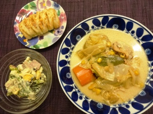 チキンクリームシチューアスパラとスナップえんどう、パテの卵サラダポテト入りデニッシュ * * * * * * * * * * * * * マッシュポテトをハムで巻いたフィリングが入ったデニッシュはパン教室で焼いたもの。かなり手間がかかりますが、絶品でした(#^.^#) 揚げ野菜入りエビチリウィンナーのオイケチャ炒めごぼうのサラダ * * * * * * * * * * * * *