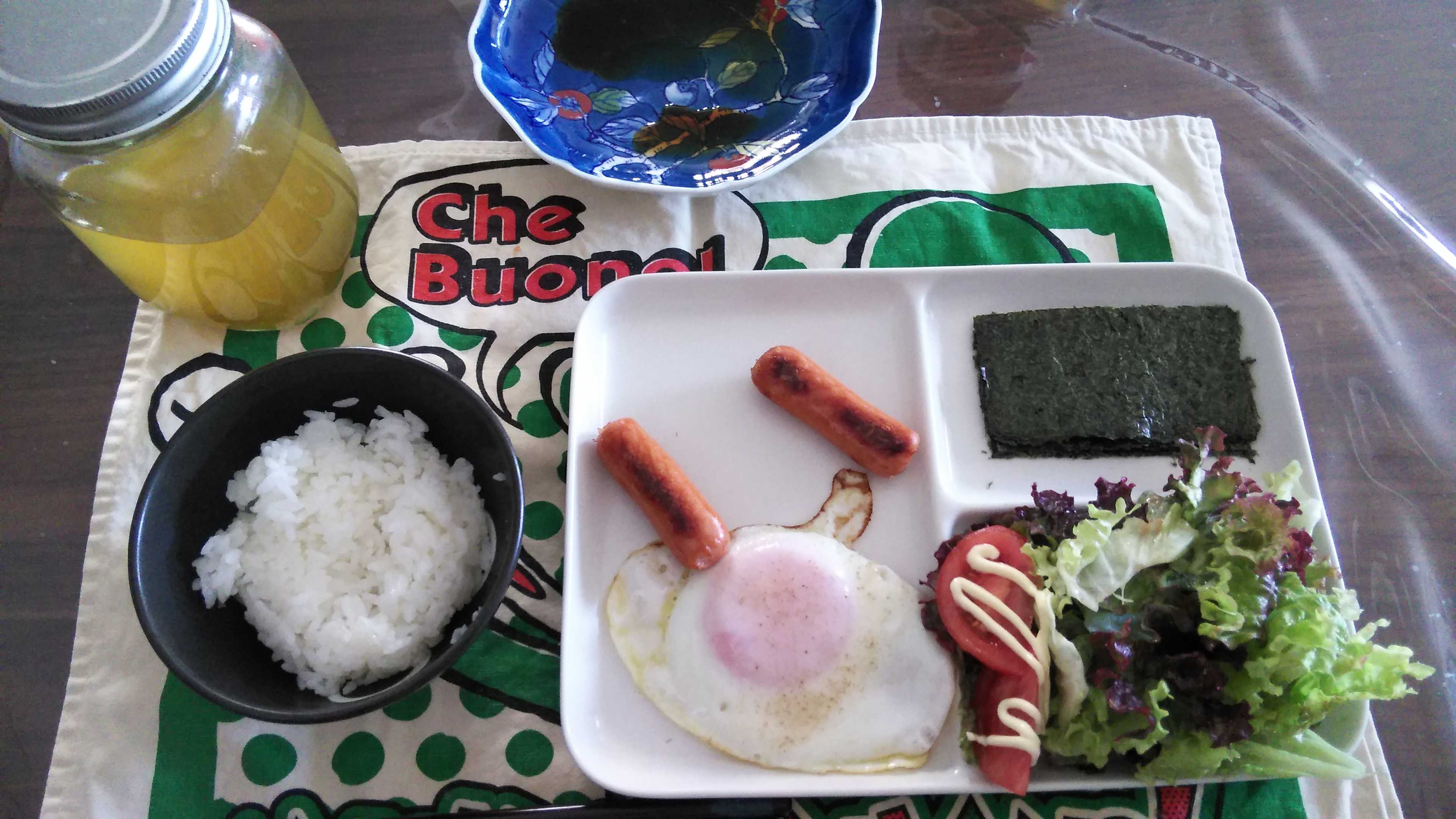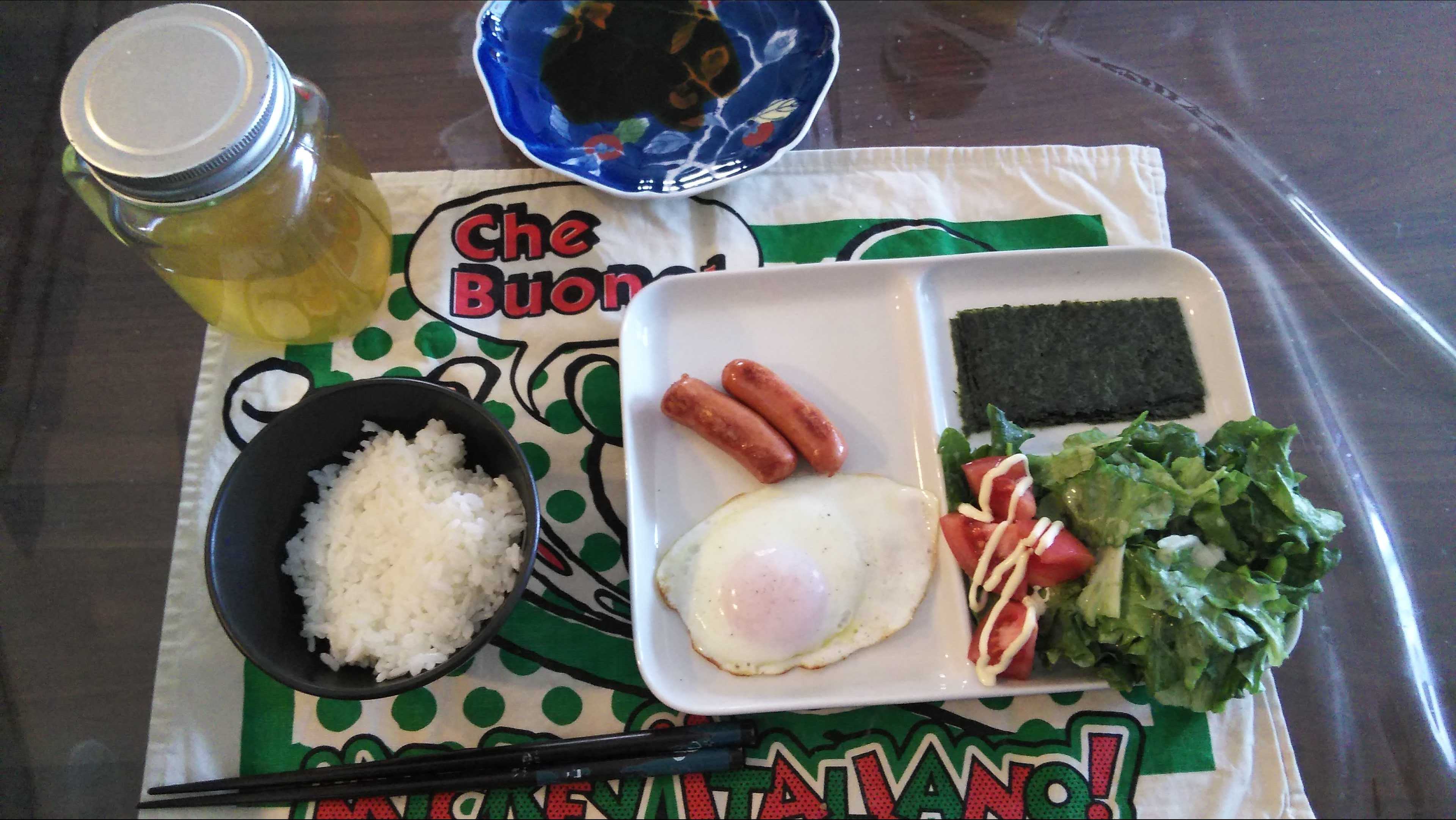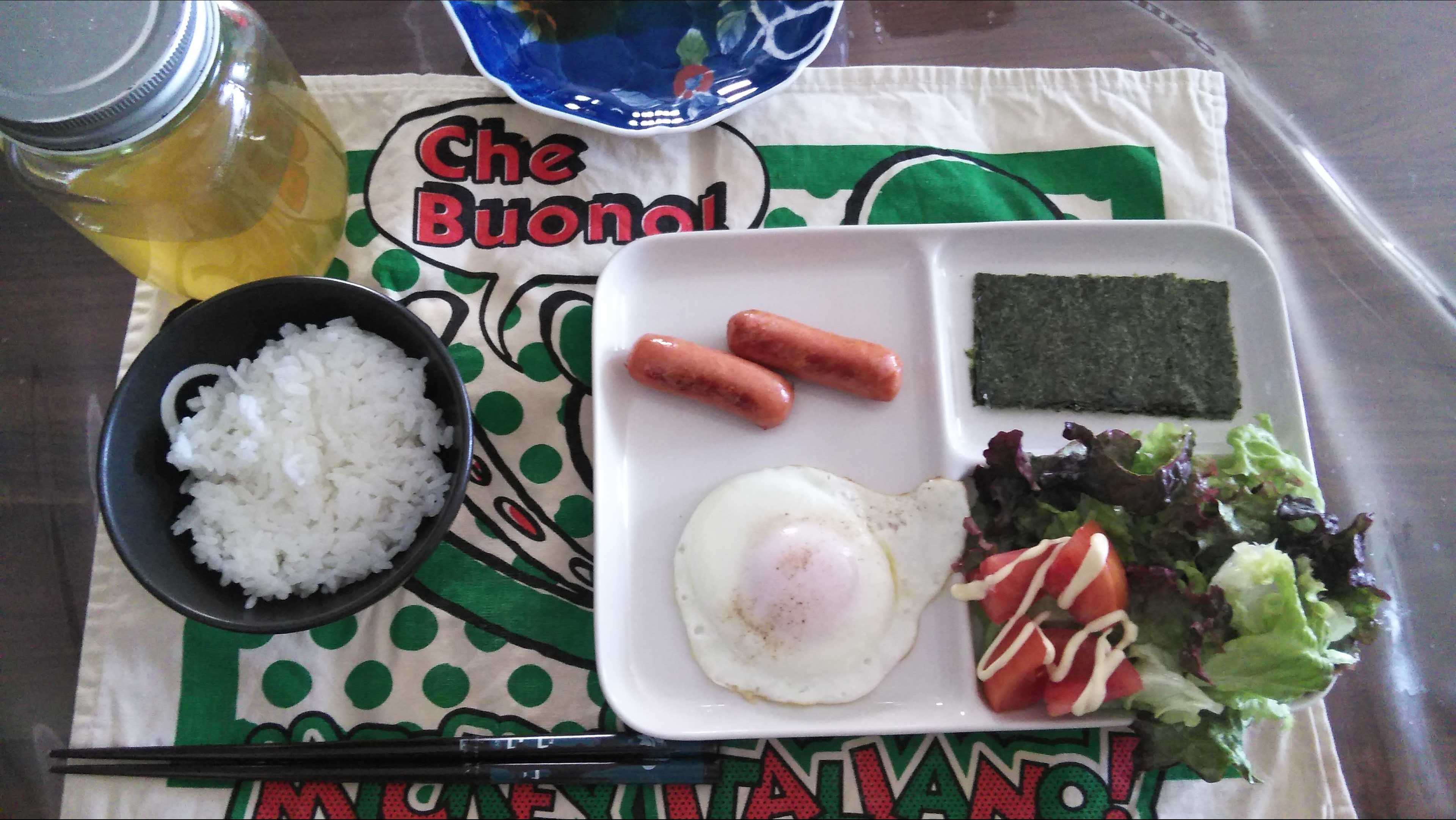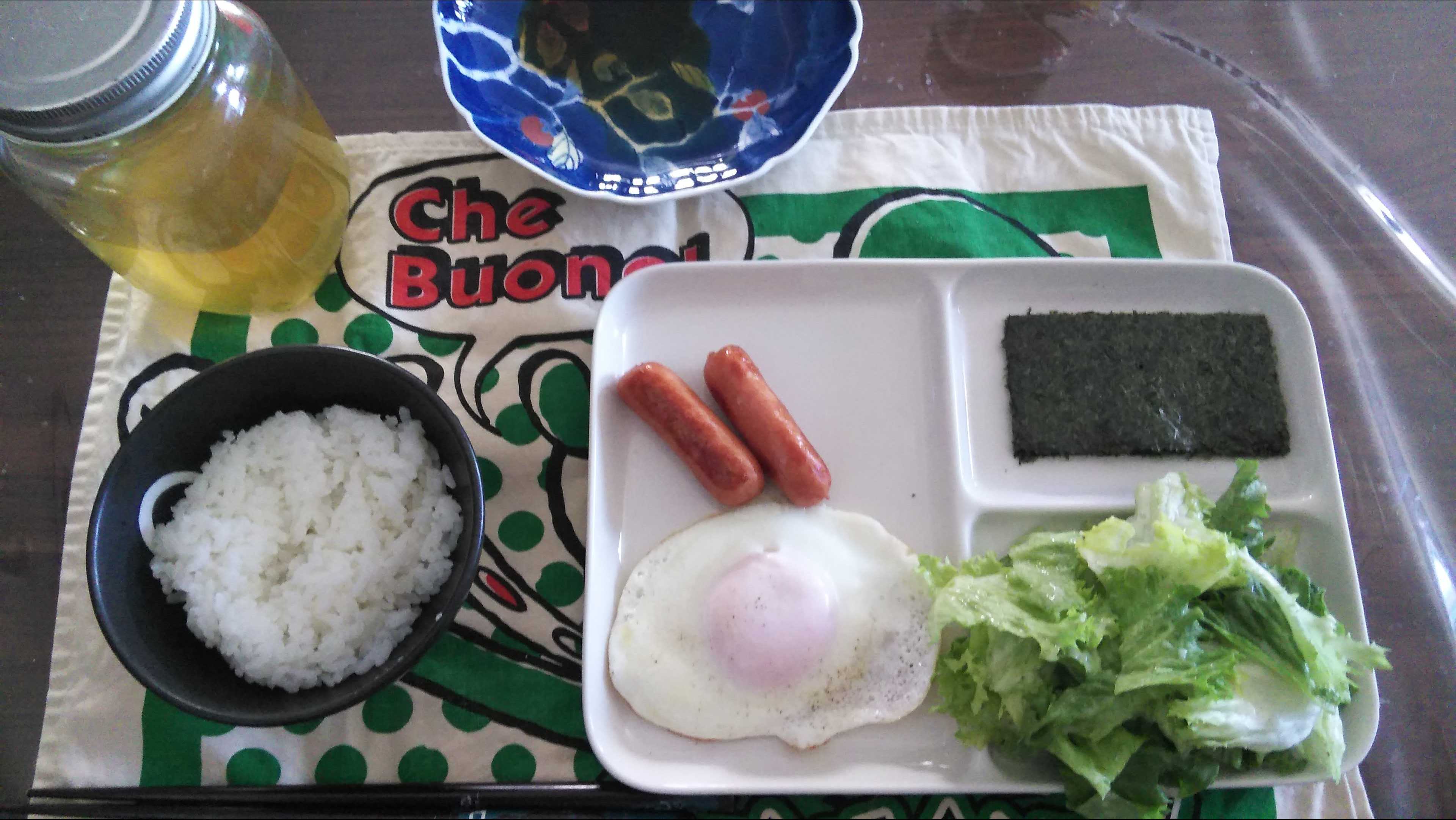 朝食→サラダ、ウィンナー2本、目玉焼き、焼きのり、ご飯、お茶朝食後→カフェオレ昼食→サラダ、りんごジャムヨーグルト、チーズハムトースト、豆乳ココア夕食→トマト、サラダ、焼きから揚げ、玉ねぎと卵のスープ、ご飯、お茶夕食→コーヒー