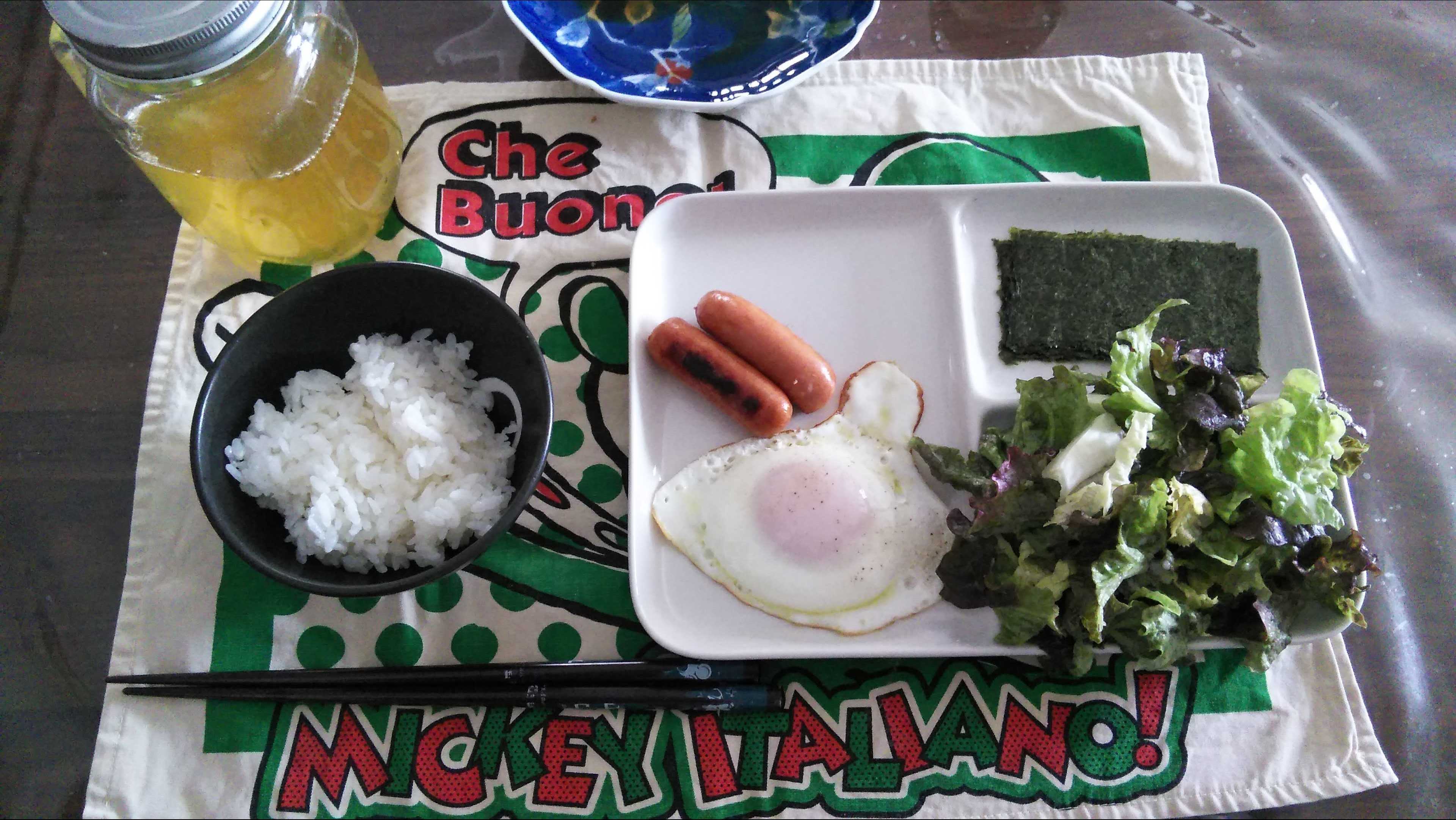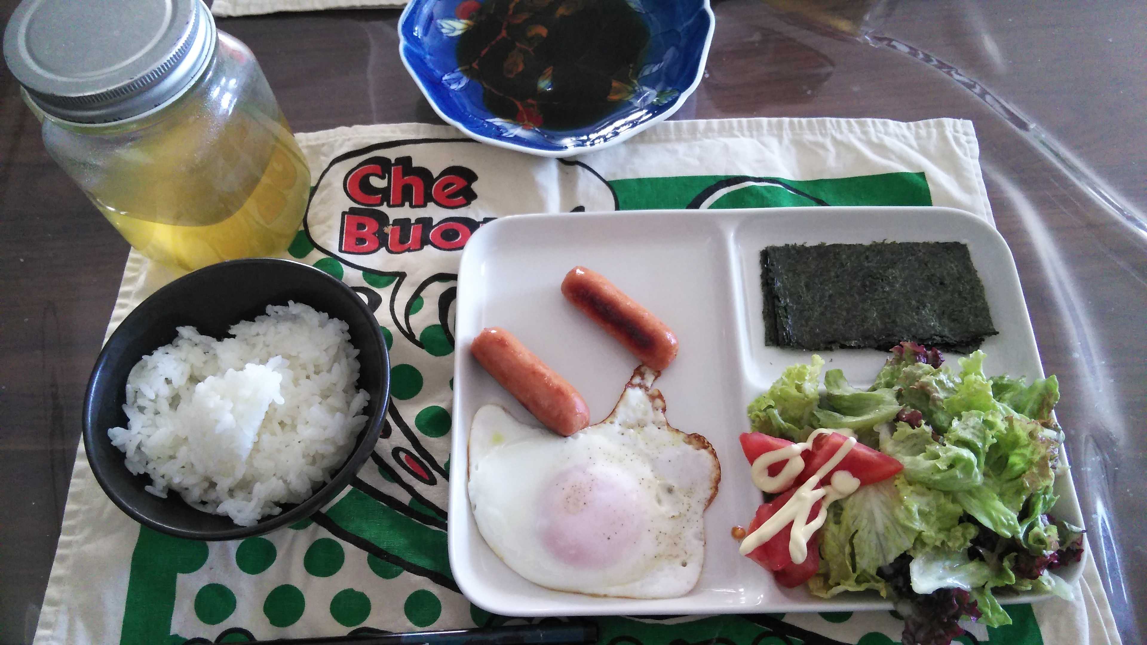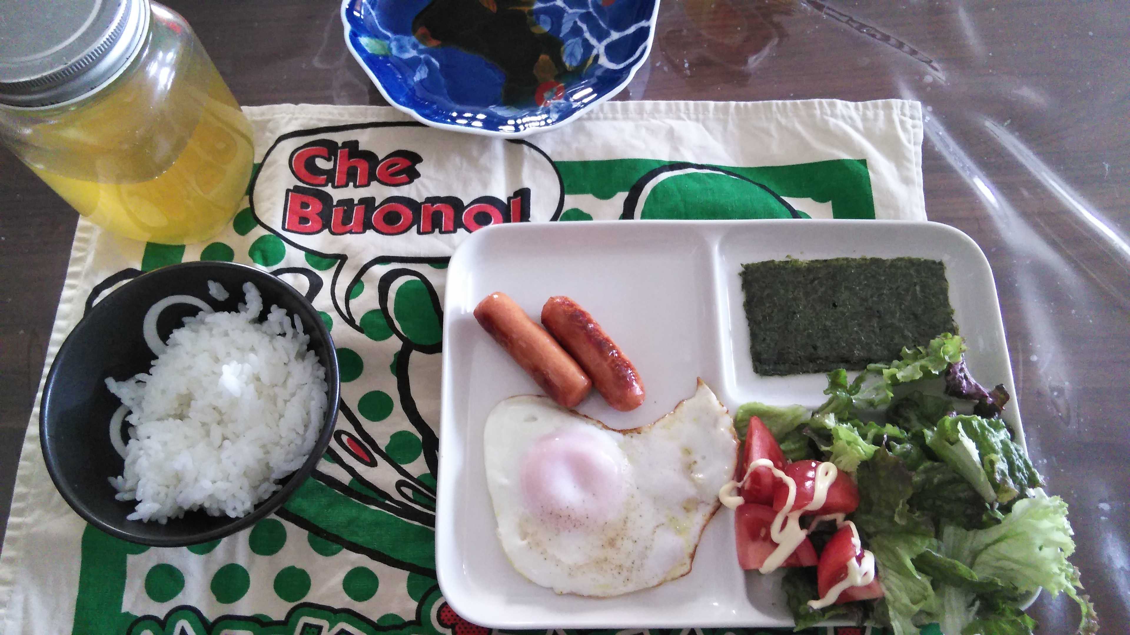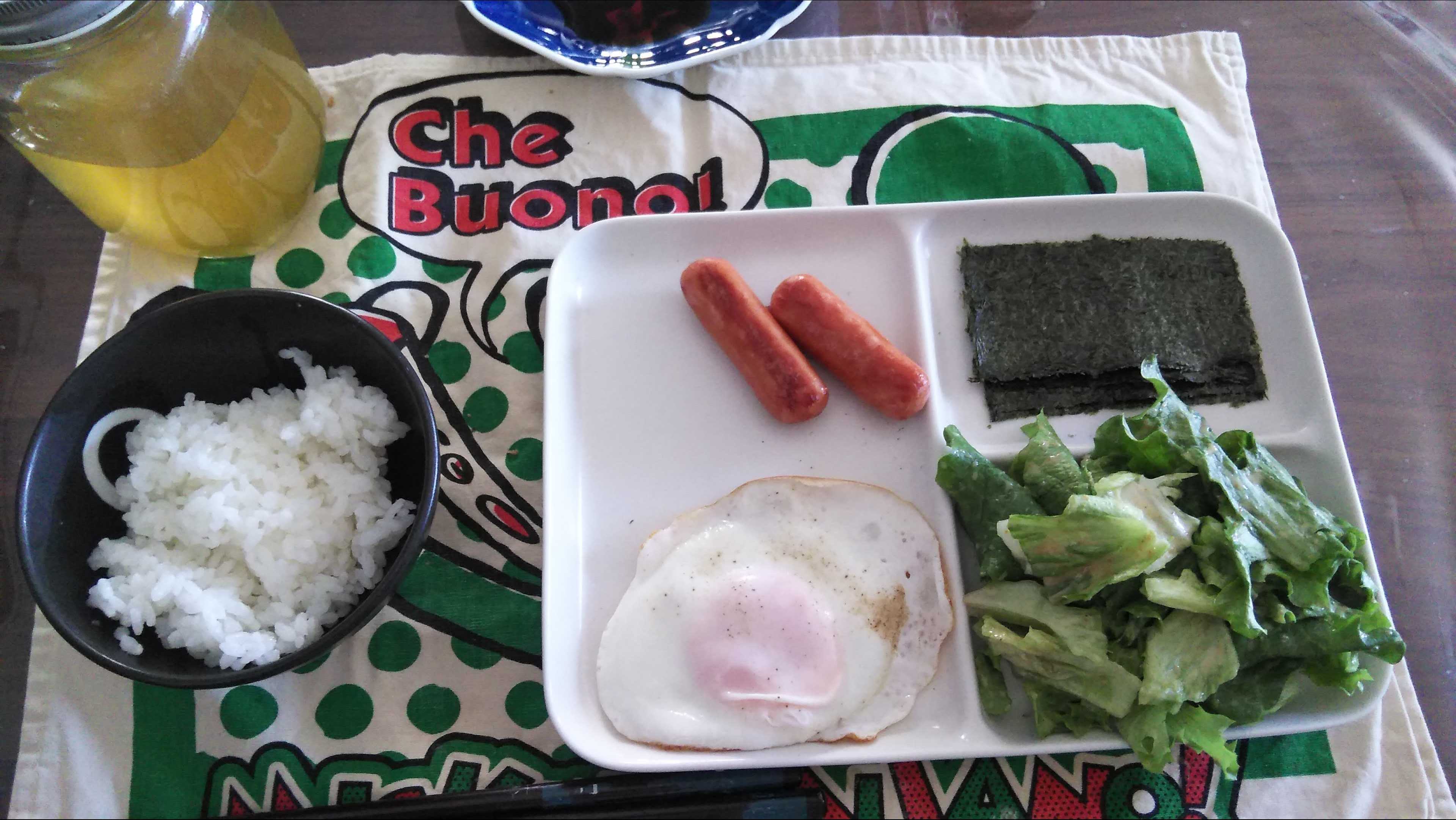 朝食→サラダ、ウィンナー2本、目玉焼き、焼きのり、ご飯、お茶朝食後→カフェオレ昼食→サラダ、りんごジャムヨーグルト、チーズハムトースト、豆乳ココア夕食→トマト、サラダ、焼きから揚げ、玉ねぎと卵のスープ、ご飯、お茶夕食→コーヒー
