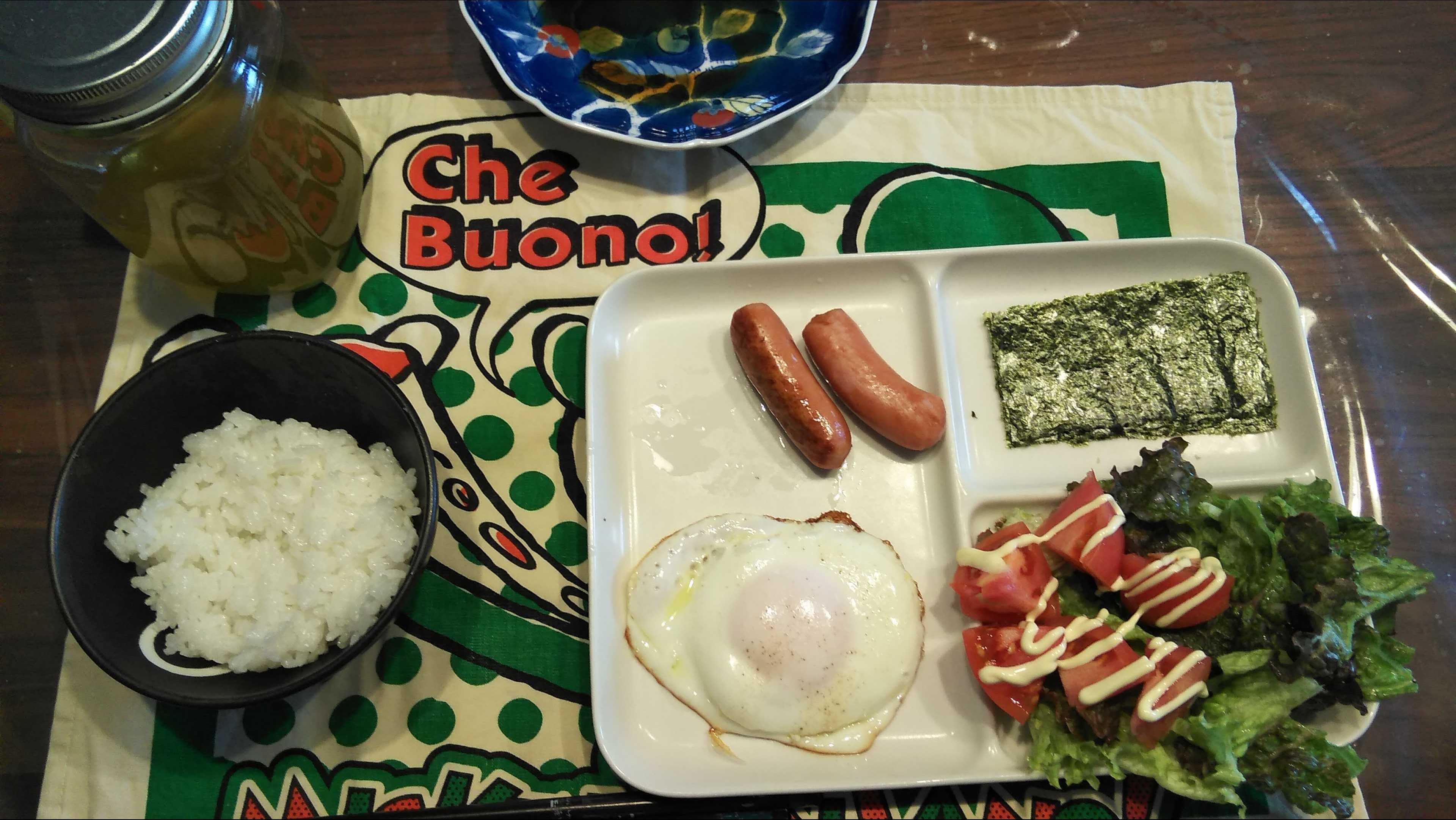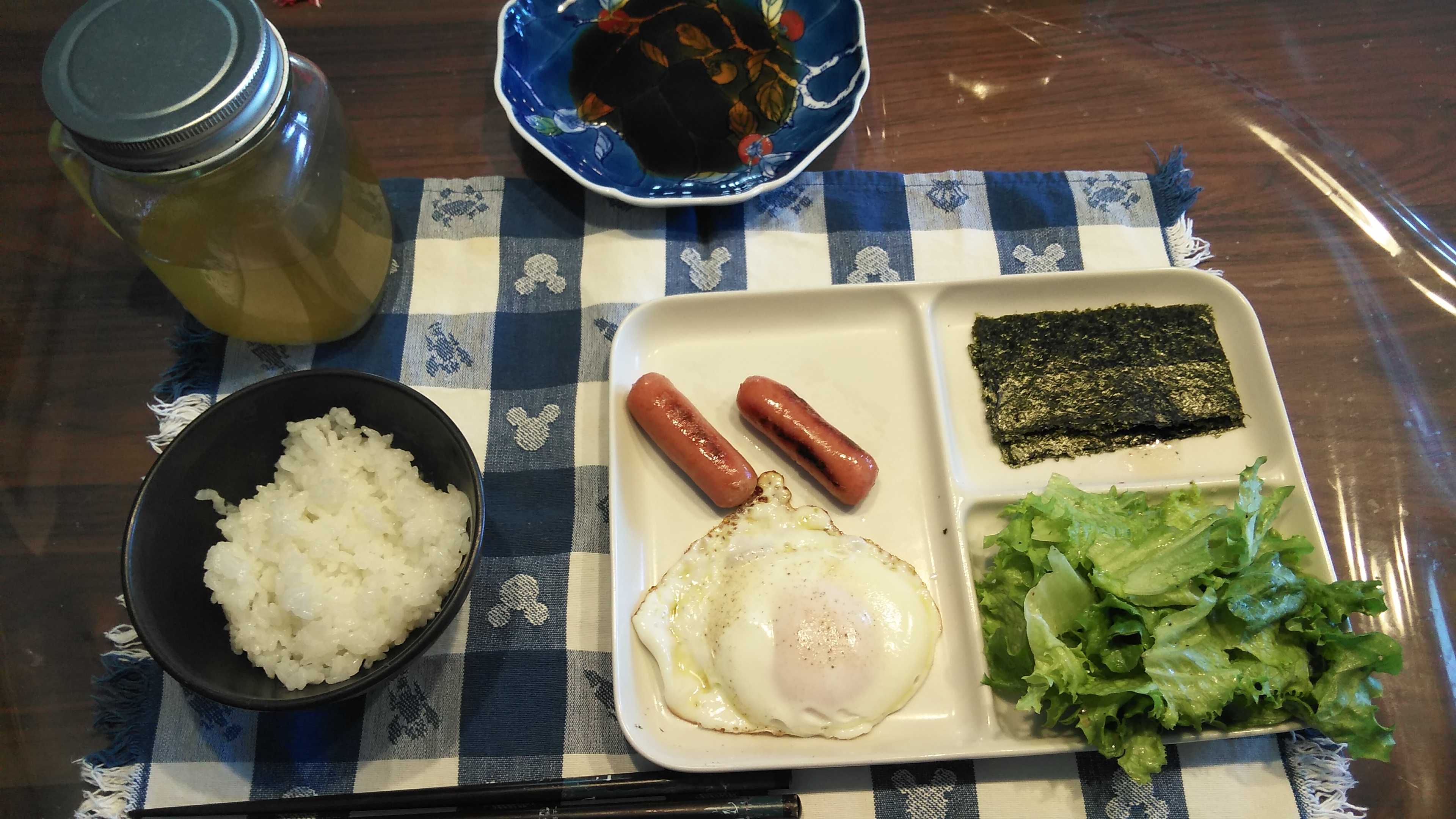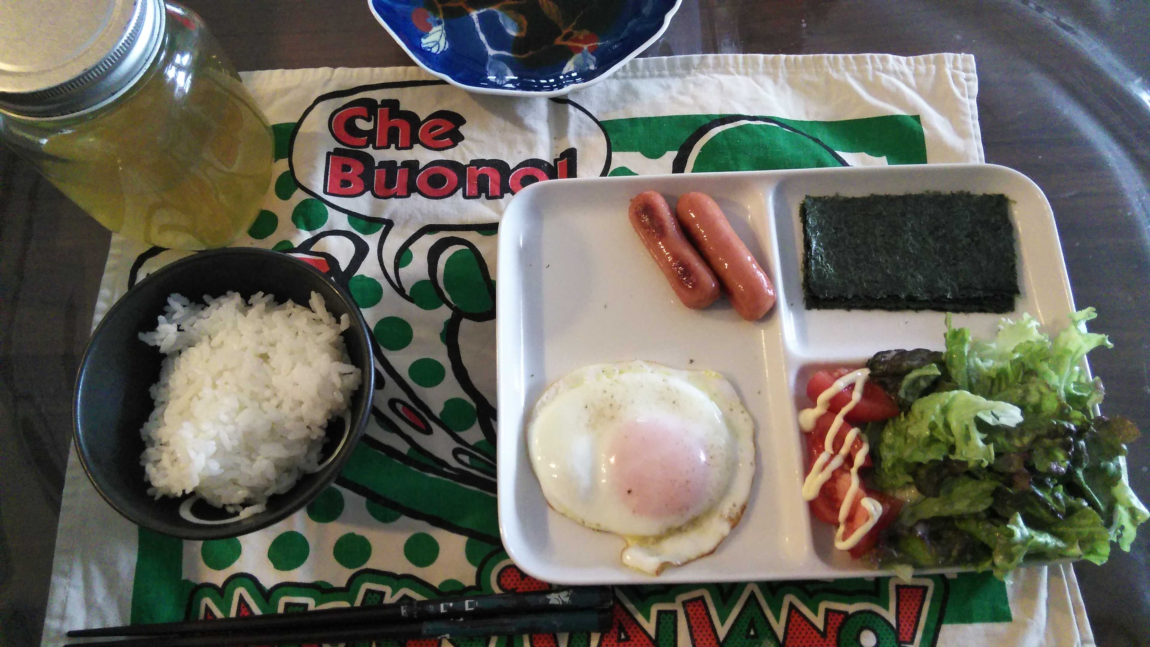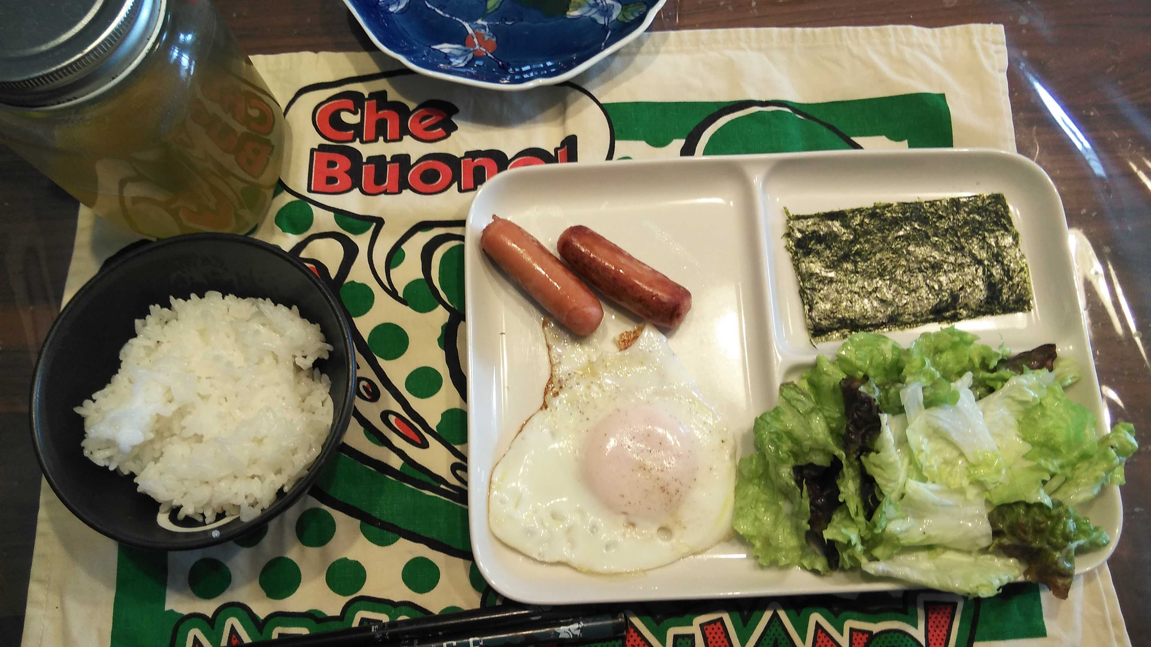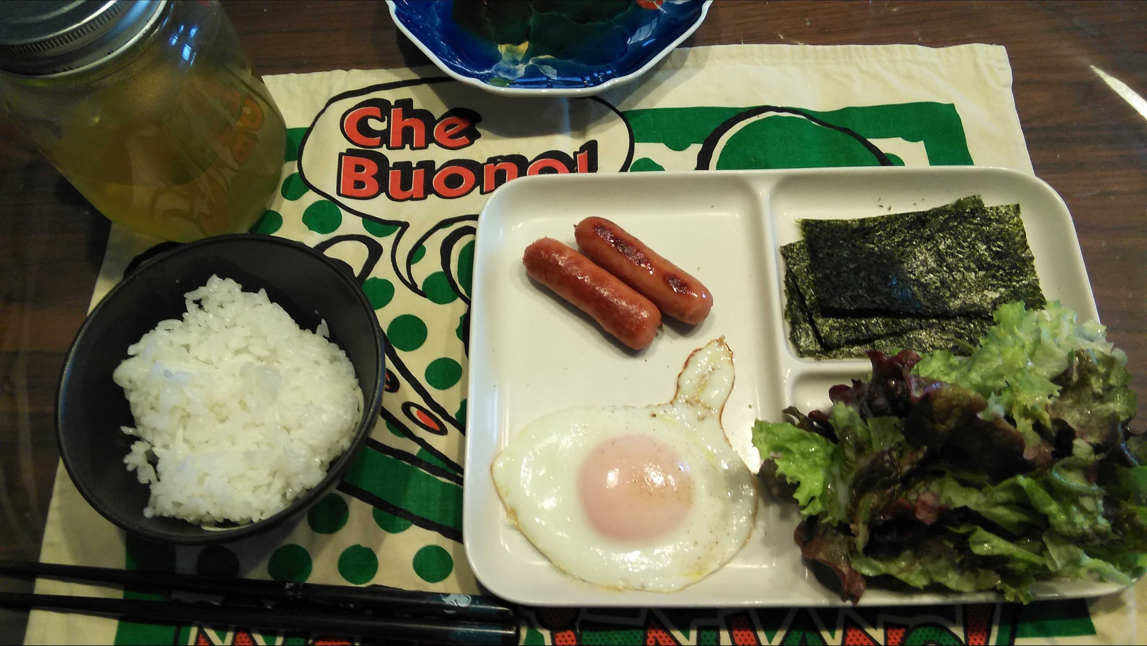 朝食→サラダ、ウィンナー2本、目玉焼き、焼きのり、ご飯、お茶朝食後→カフェオレ昼食→サラダ、りんごジャムヨーグルト、チーズハムトースト、豆乳ココア夕食→トマト、サラダ、焼きから揚げ、玉ねぎと卵のスープ、ご飯、お茶夕食→コーヒー