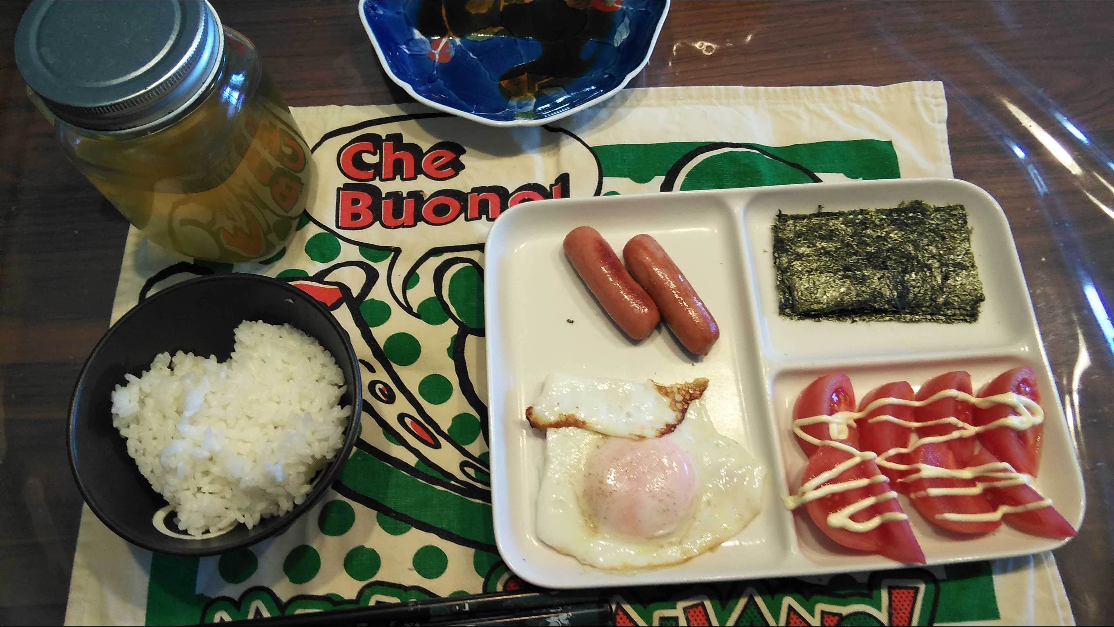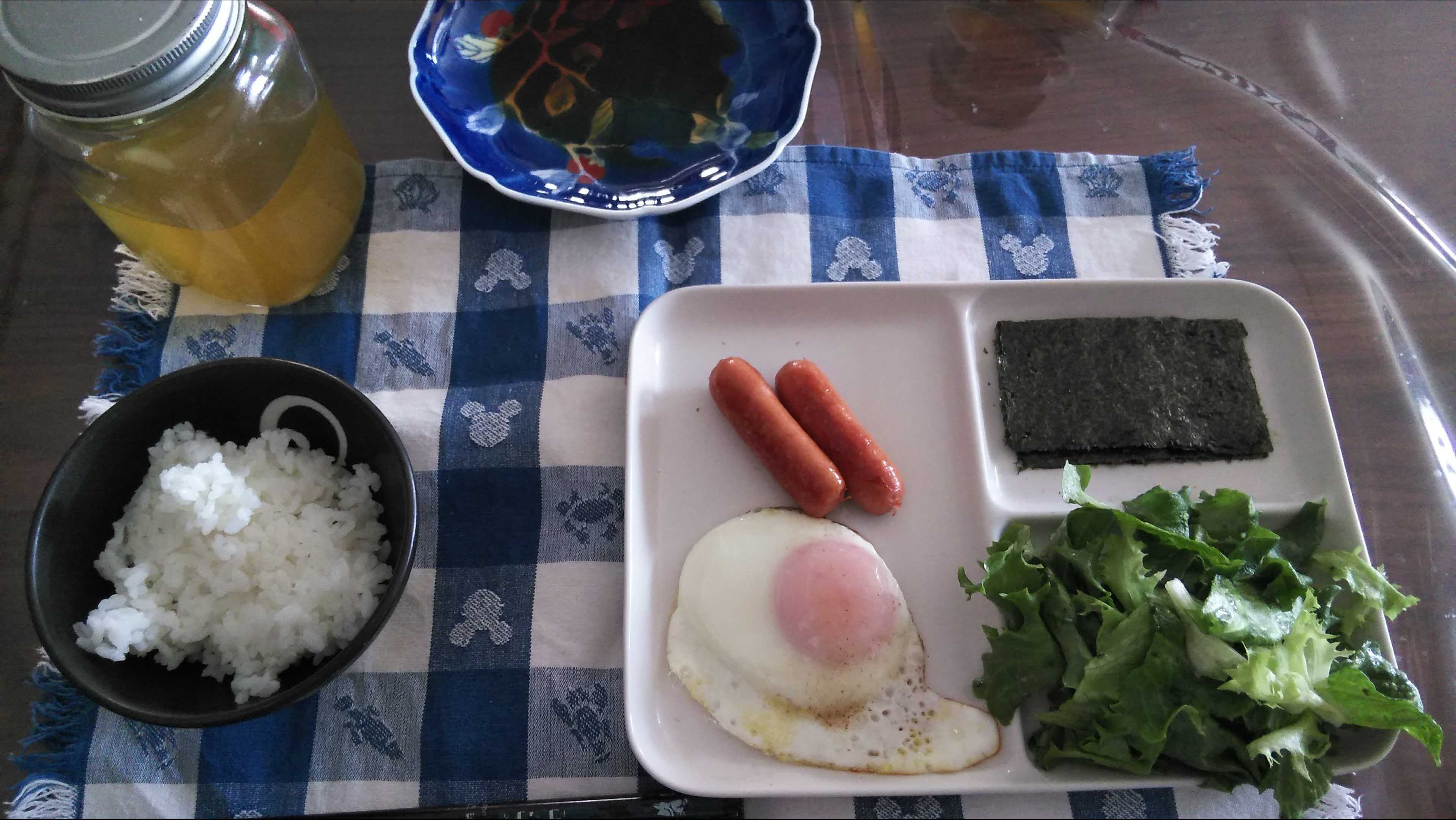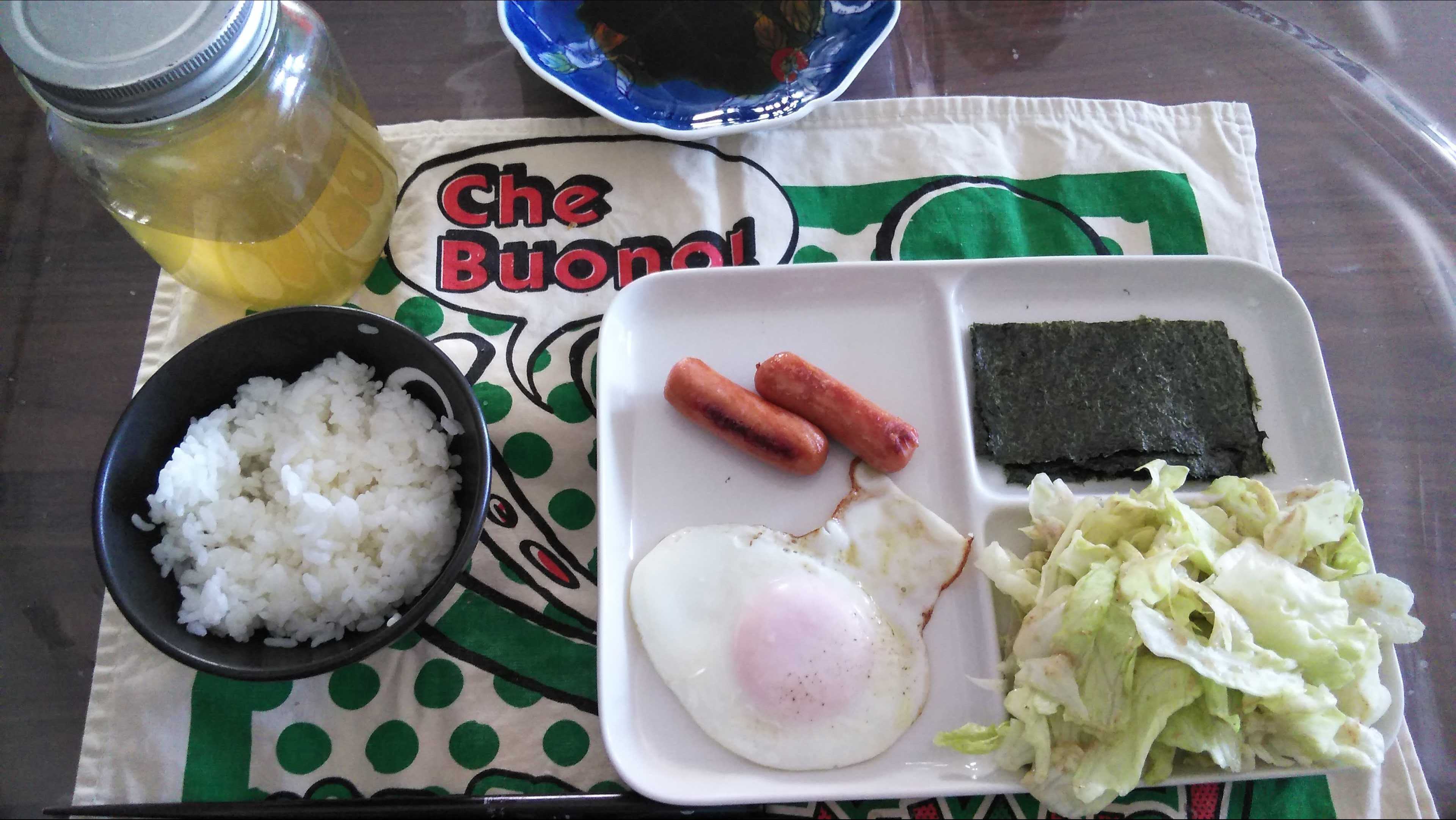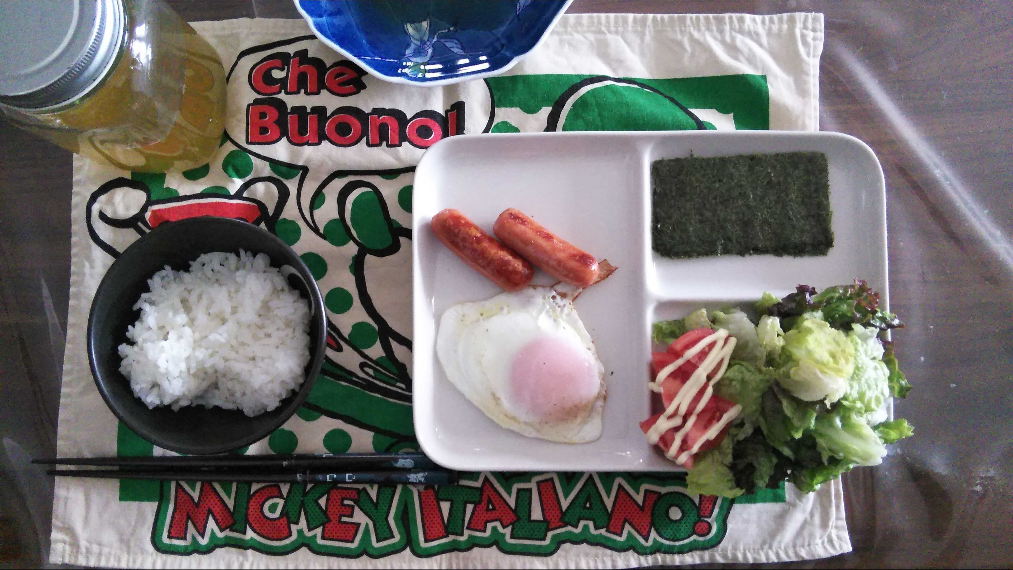 朝食→サラダ、ウィンナー2本、目玉焼き、焼きのり、ご飯、お茶朝食後→カフェオレ昼食→サラダ、りんごジャムヨーグルト、チーズハムトースト、豆乳ココア夕食→トマト、サラダ、焼きから揚げ、玉ねぎと卵のスープ、ご飯、お茶夕食→コーヒー