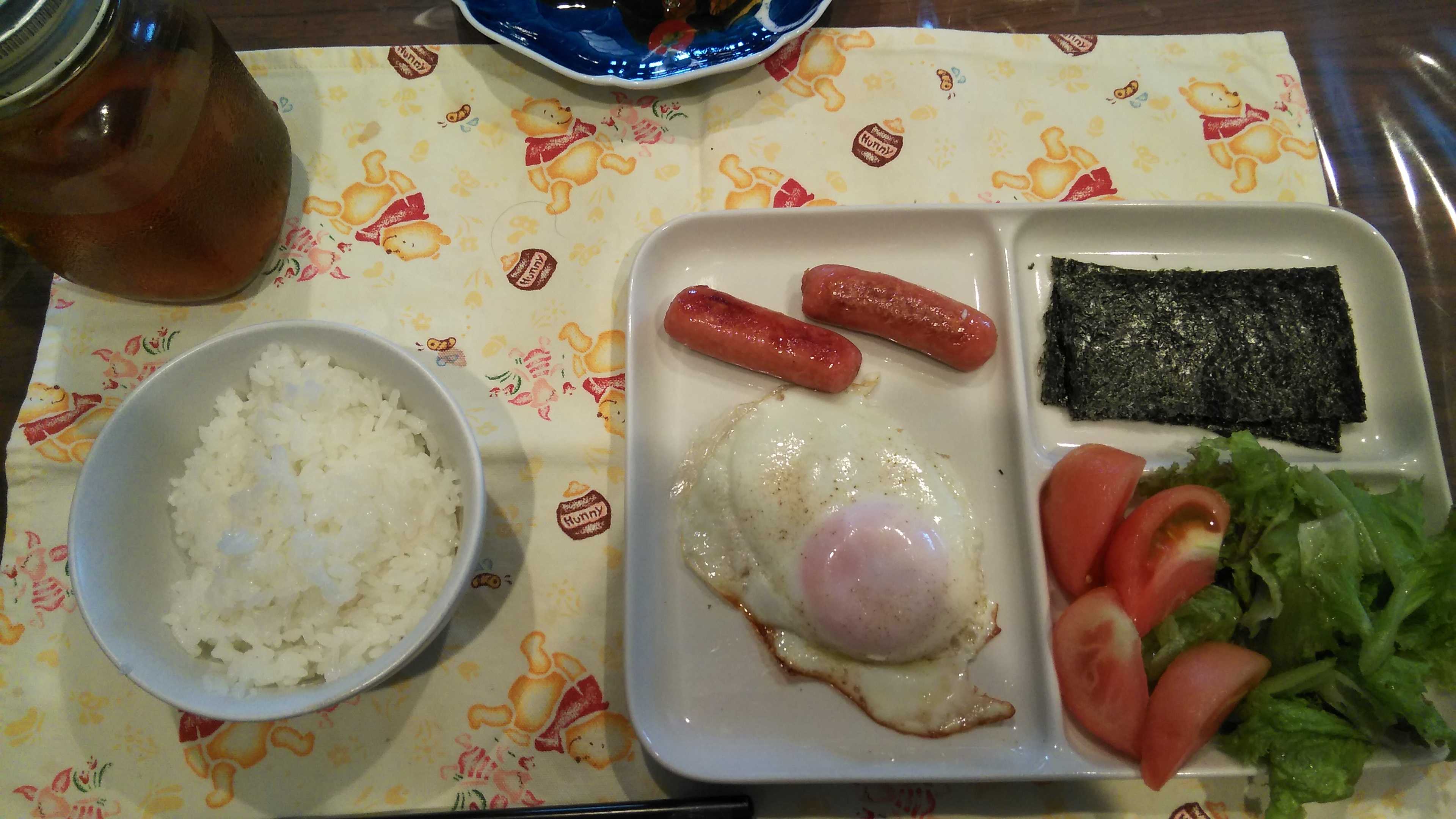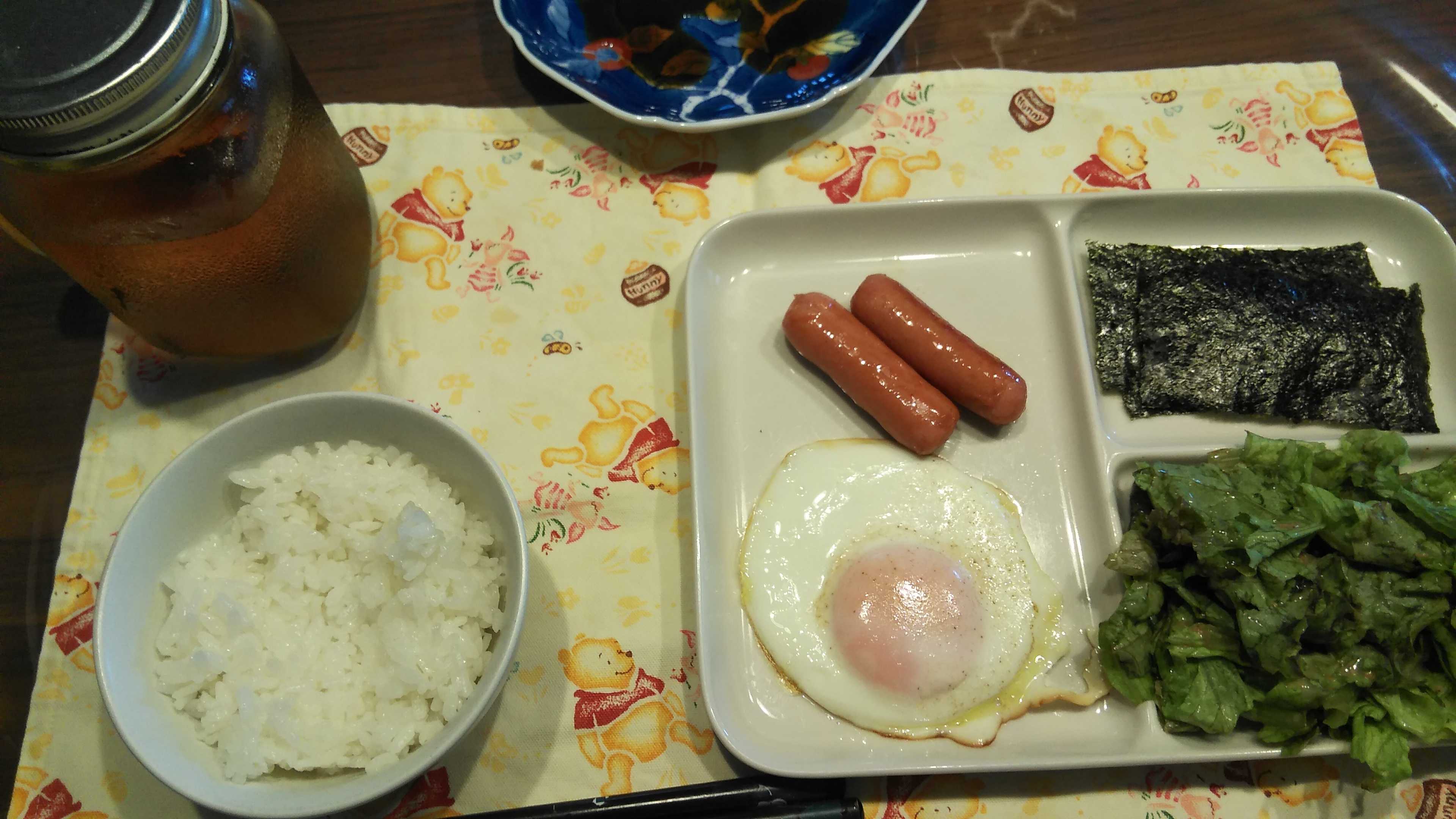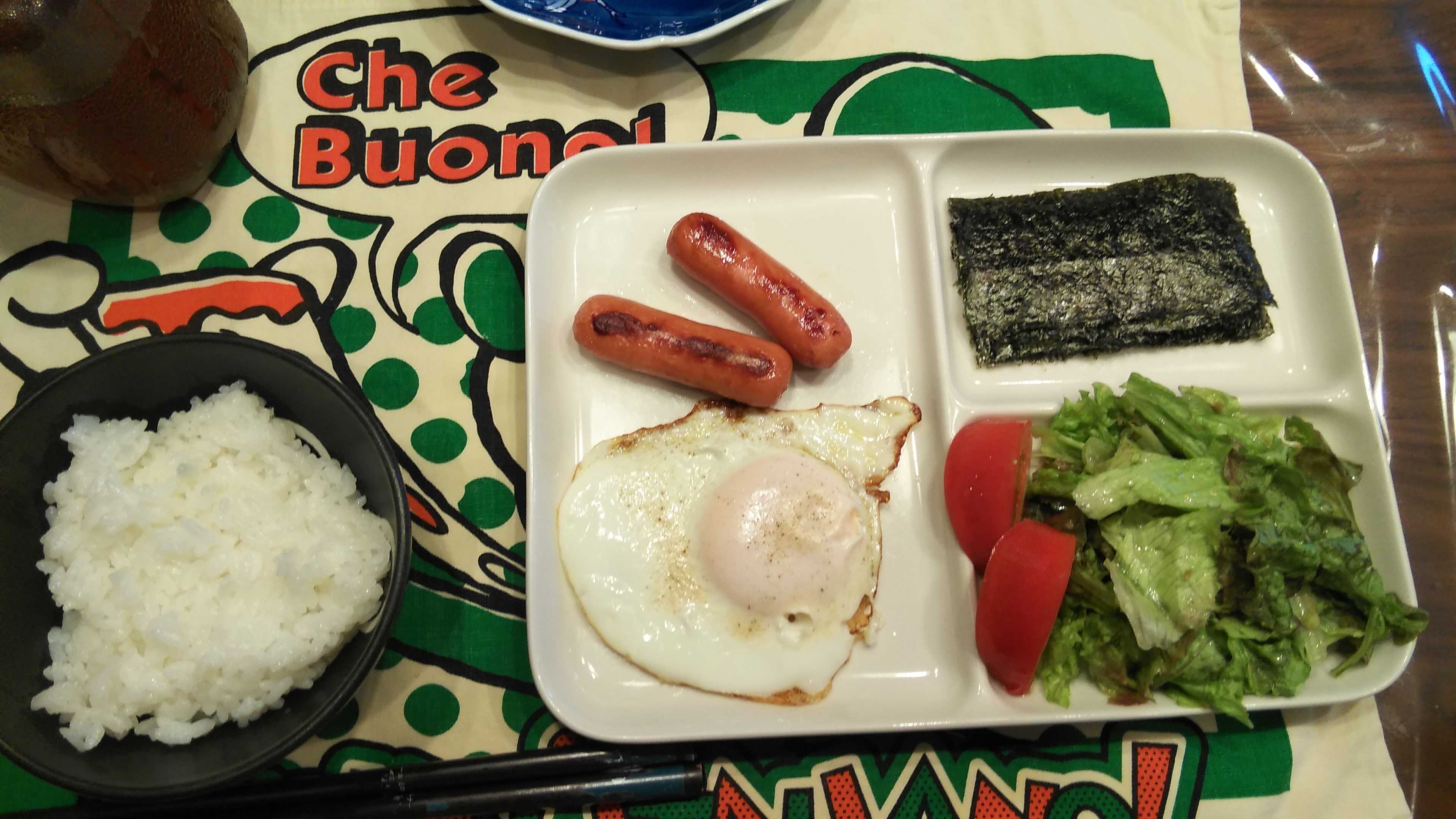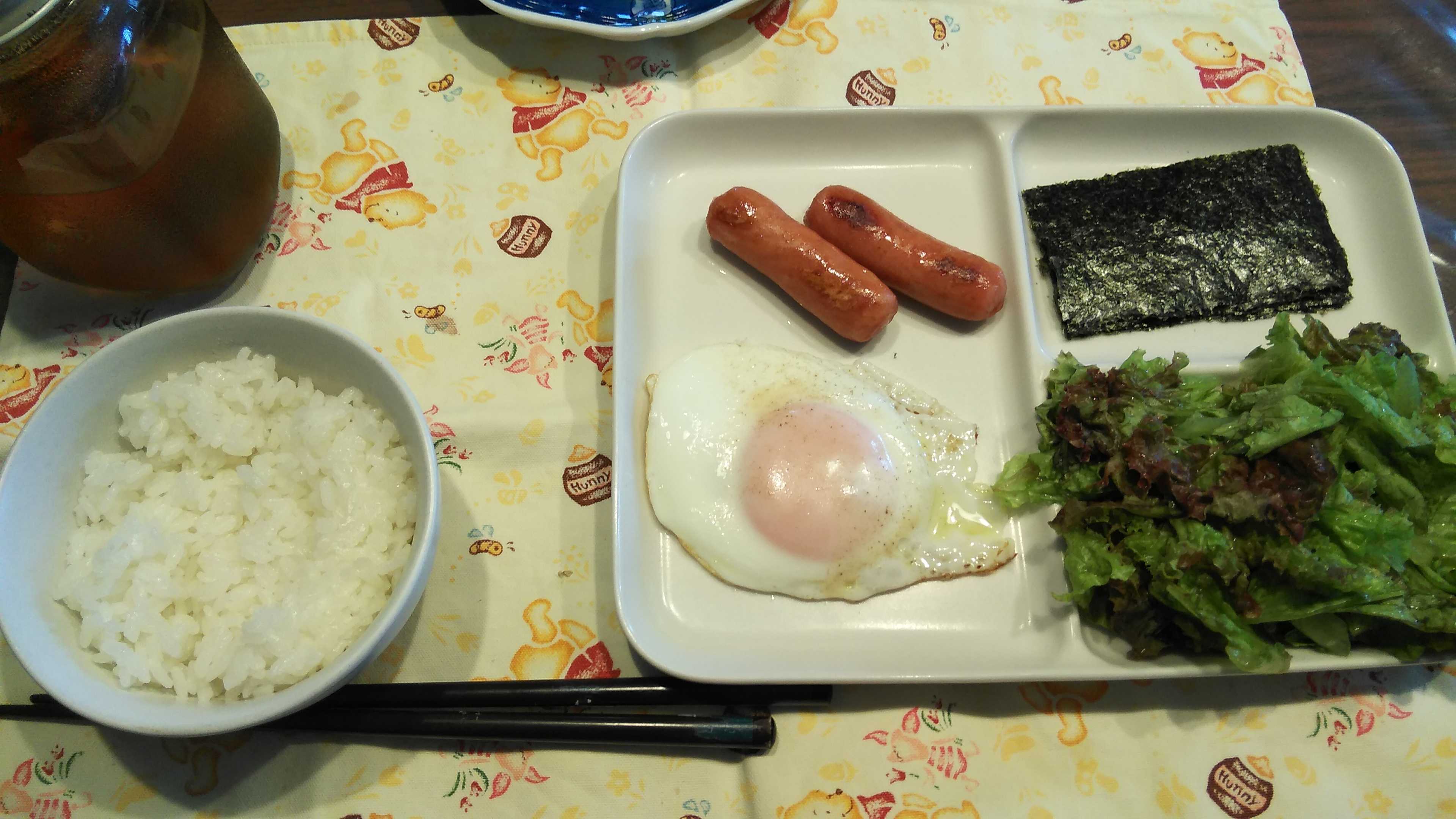 朝食→サラダ、ウィンナー2本、目玉焼き、焼きのり、ご飯、紅茶朝食後→カフェオレ昼食→サラダ、イチゴジャムヨーグルト、ツナチーズトースト、牛乳夕食→トマト、サラダ、ピーマン炒め、焼きポークメンチ、ご飯、カボチャの味噌汁、紅茶夕食後→アイスコーヒー