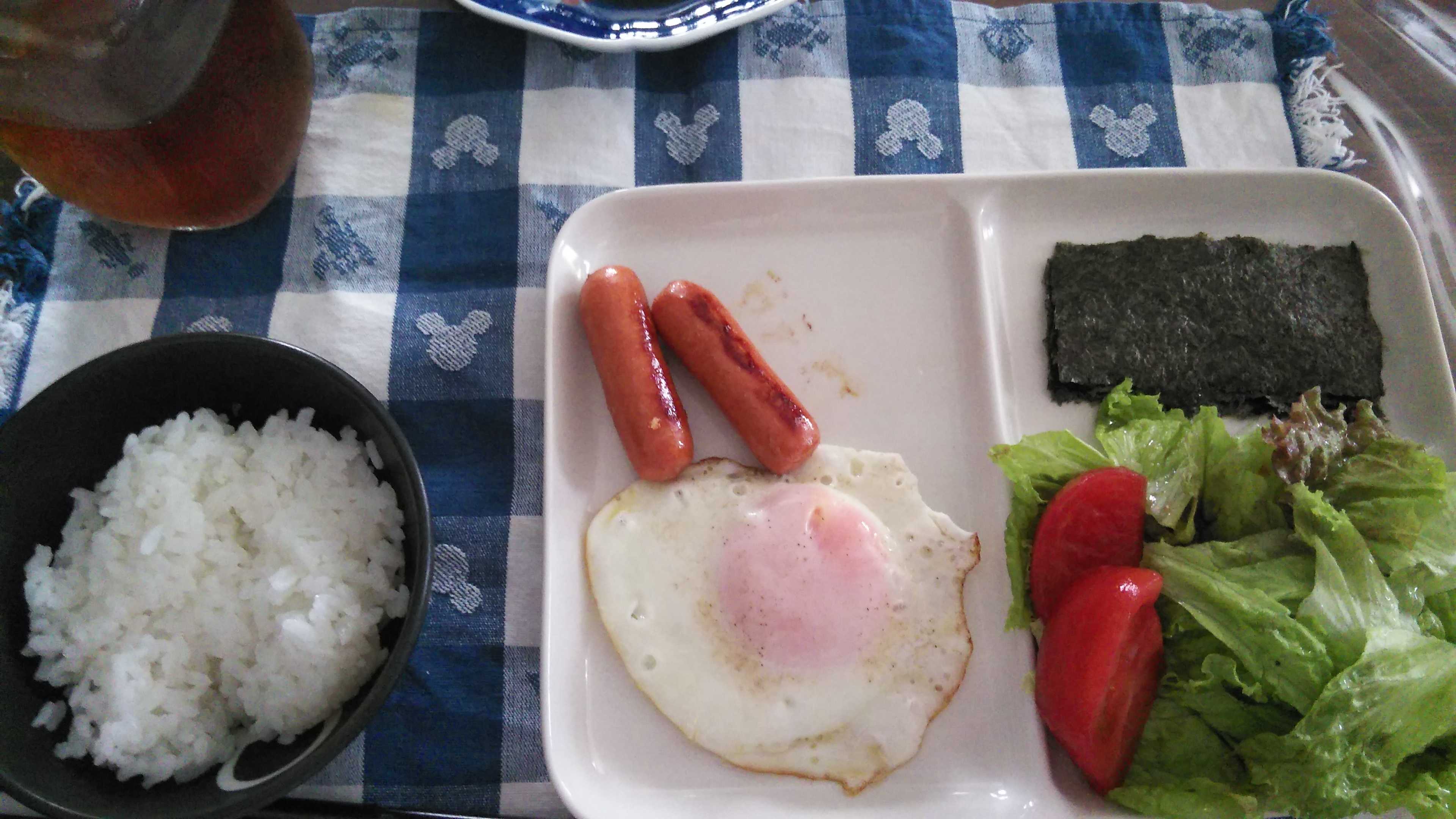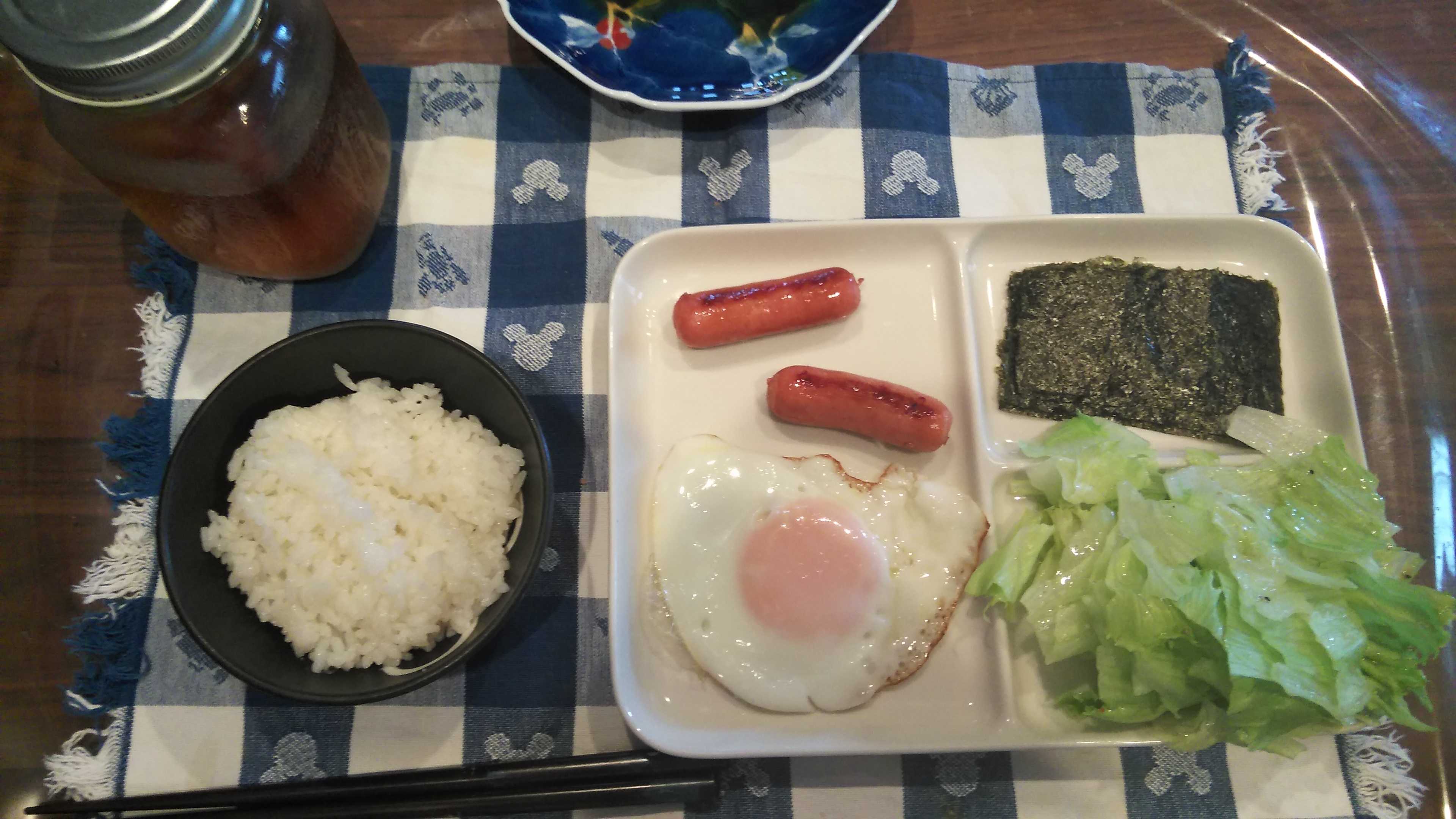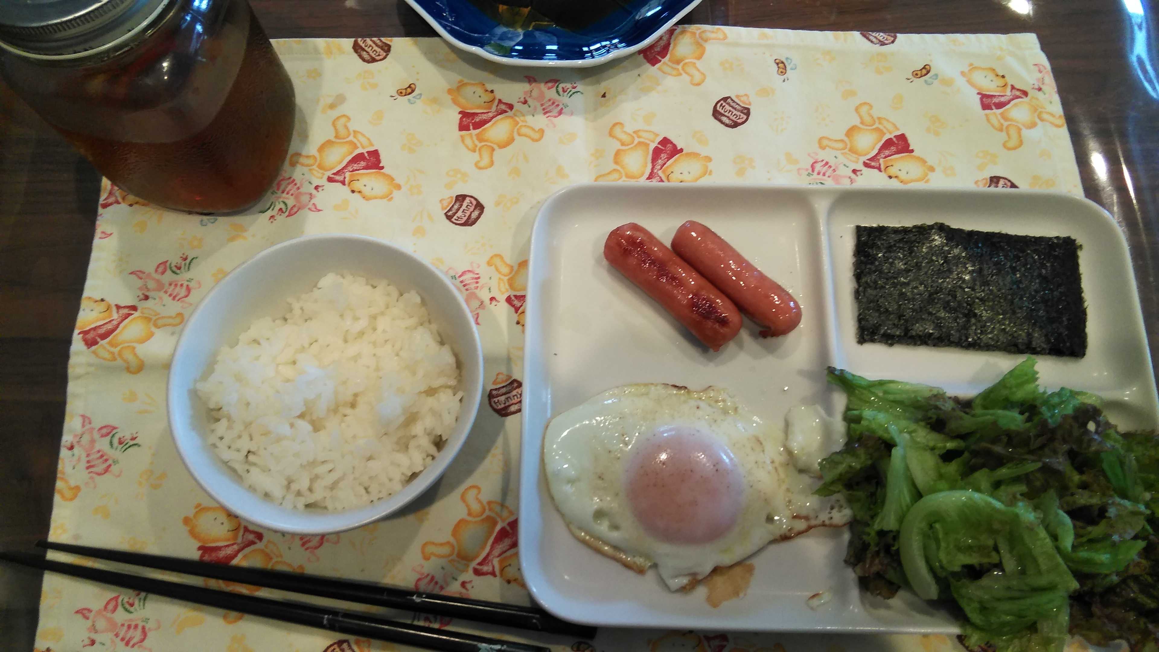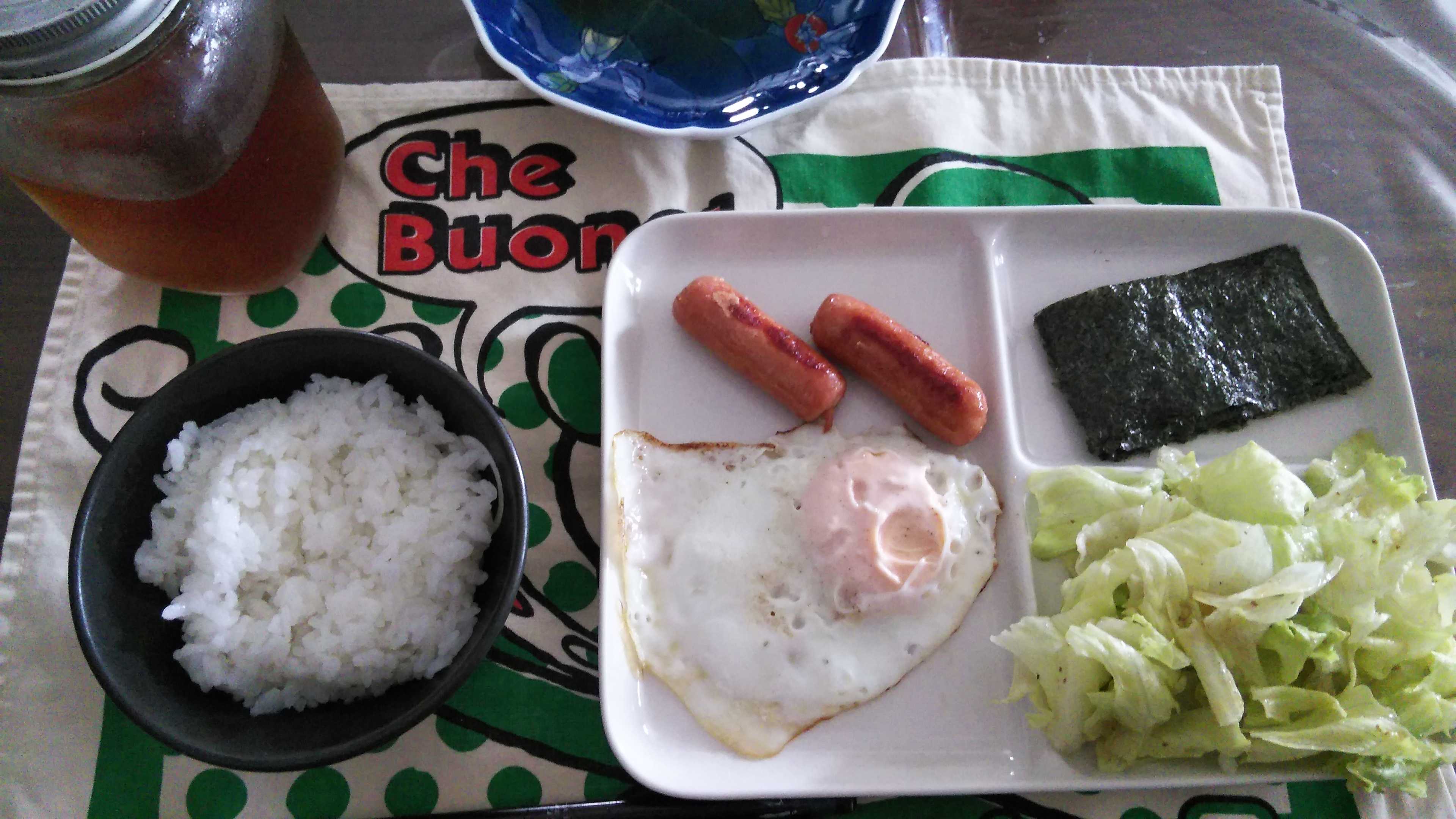 朝食→サラダ、ウィンナー2本、目玉焼き、焼きのり、ご飯、紅茶朝食後→カフェオレ昼食→サラダ、イチゴジャムヨーグルト、ツナチーズトースト、牛乳夕食→トマト、サラダ、ピーマン炒め、焼きポークメンチ、ご飯、カボチャの味噌汁、紅茶夕食後→アイスコーヒー