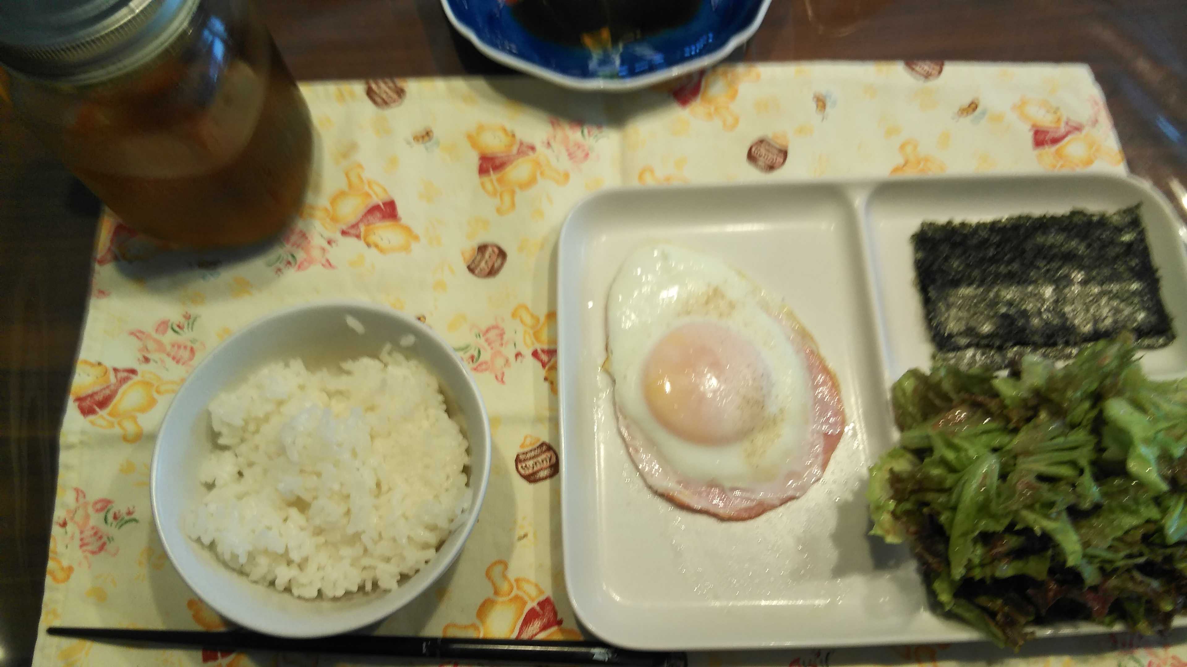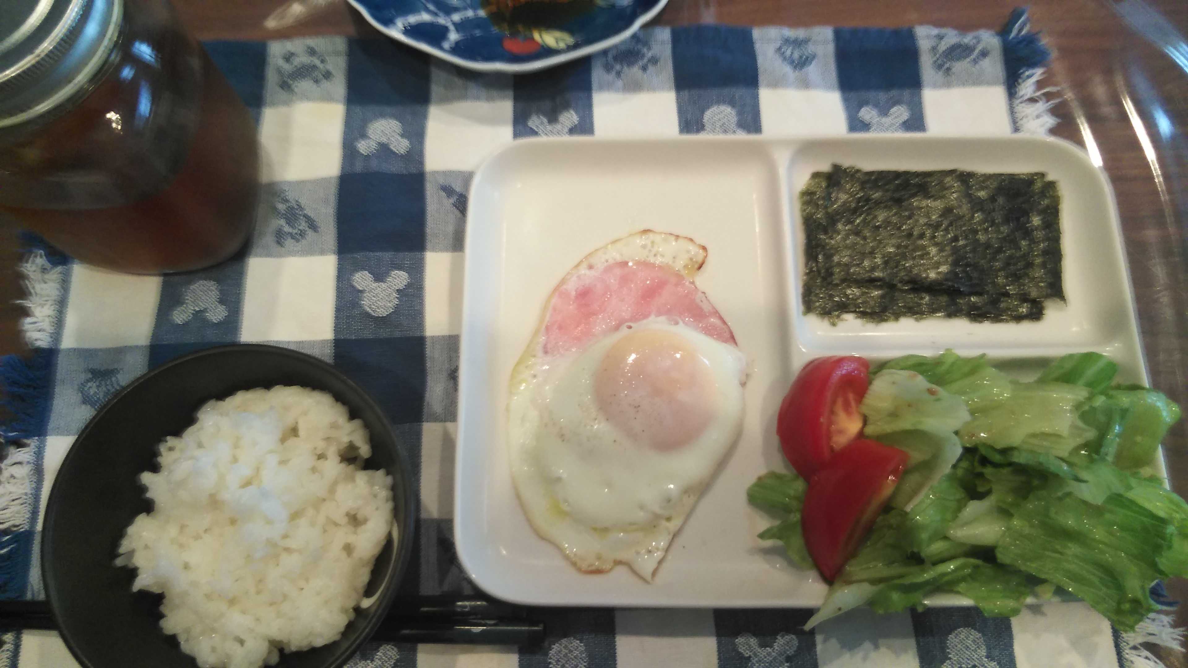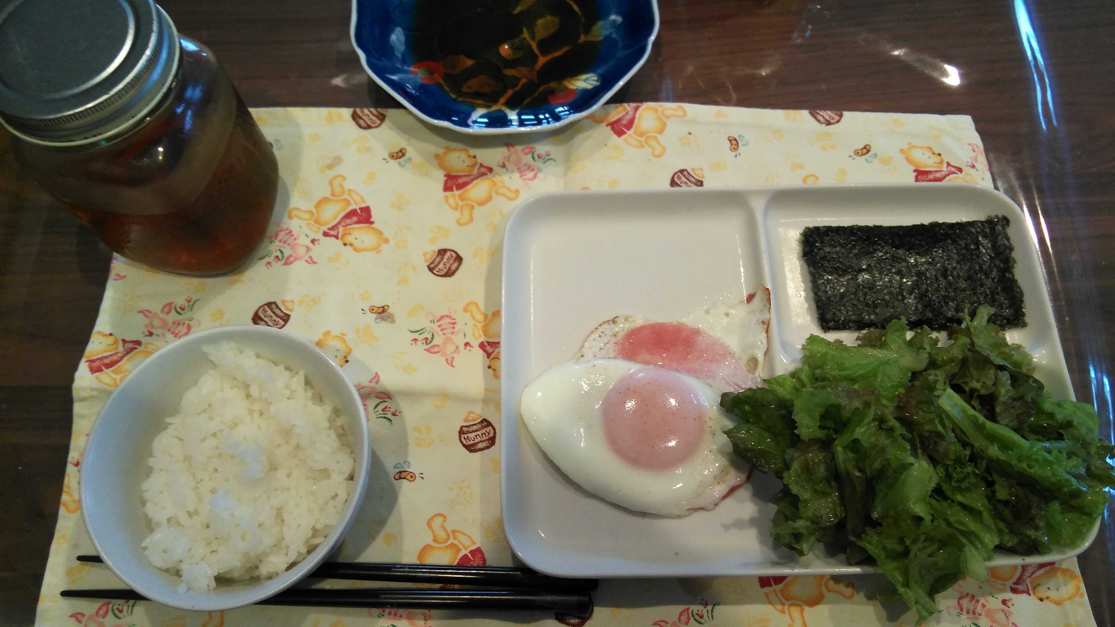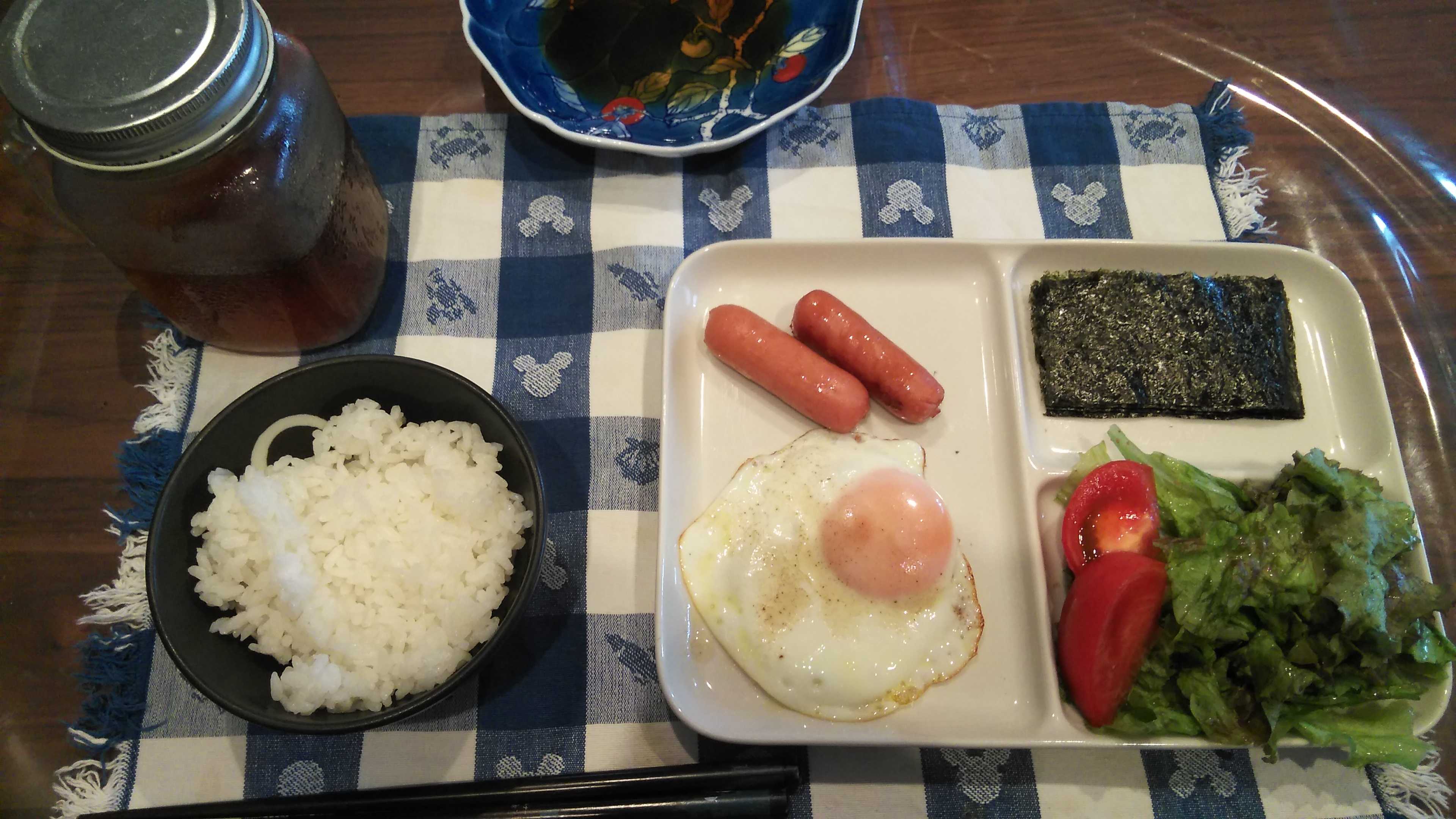 朝食→サラダ、ウィンナー2本、目玉焼き、焼きのり、ご飯、紅茶朝食後→カフェオレ昼食→サラダ、イチゴジャムヨーグルト、ツナチーズトースト、牛乳夕食→トマト、サラダ、ピーマン炒め、焼きポークメンチ、ご飯、カボチャの味噌汁、紅茶夕食後→アイスコーヒー