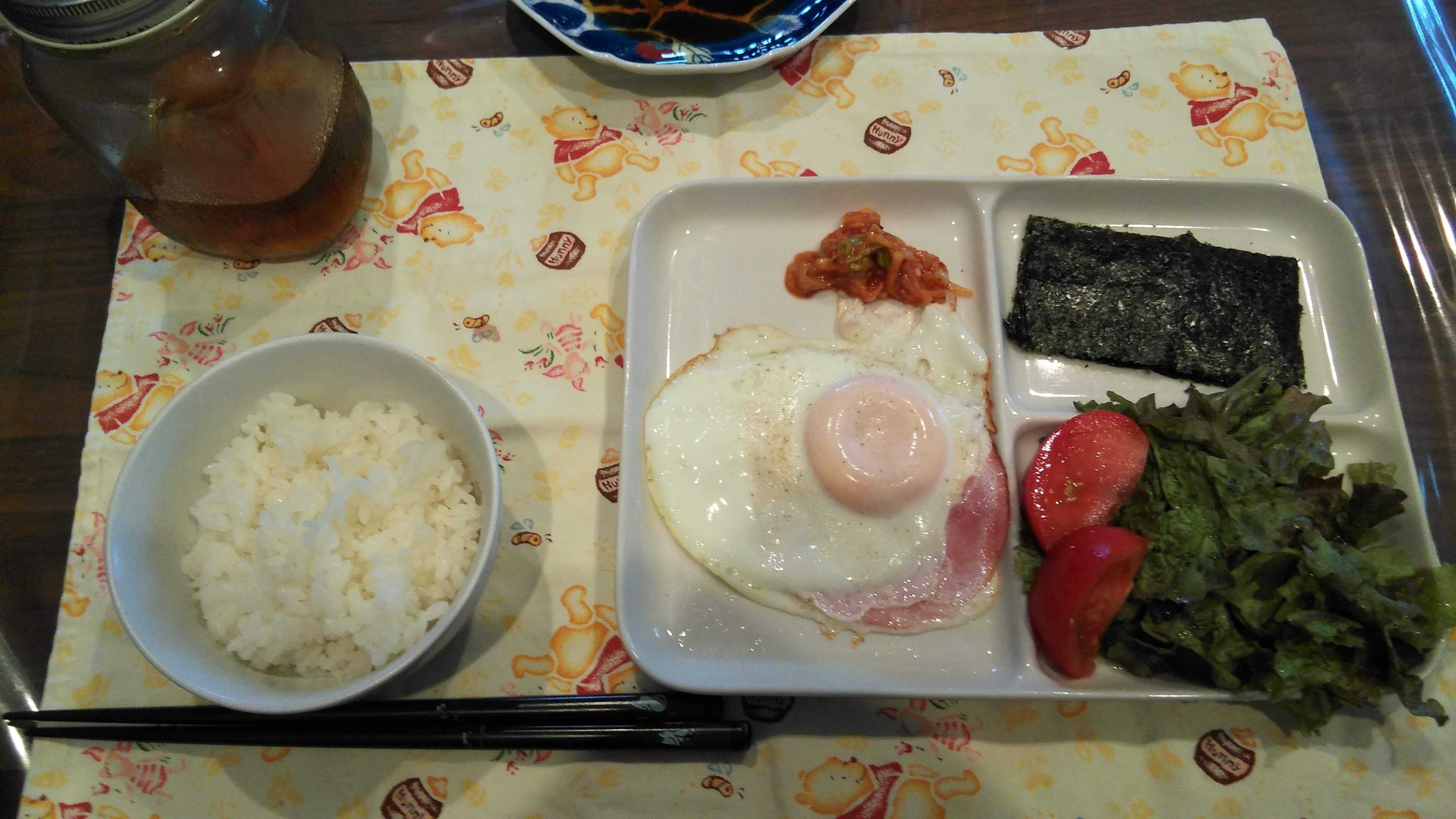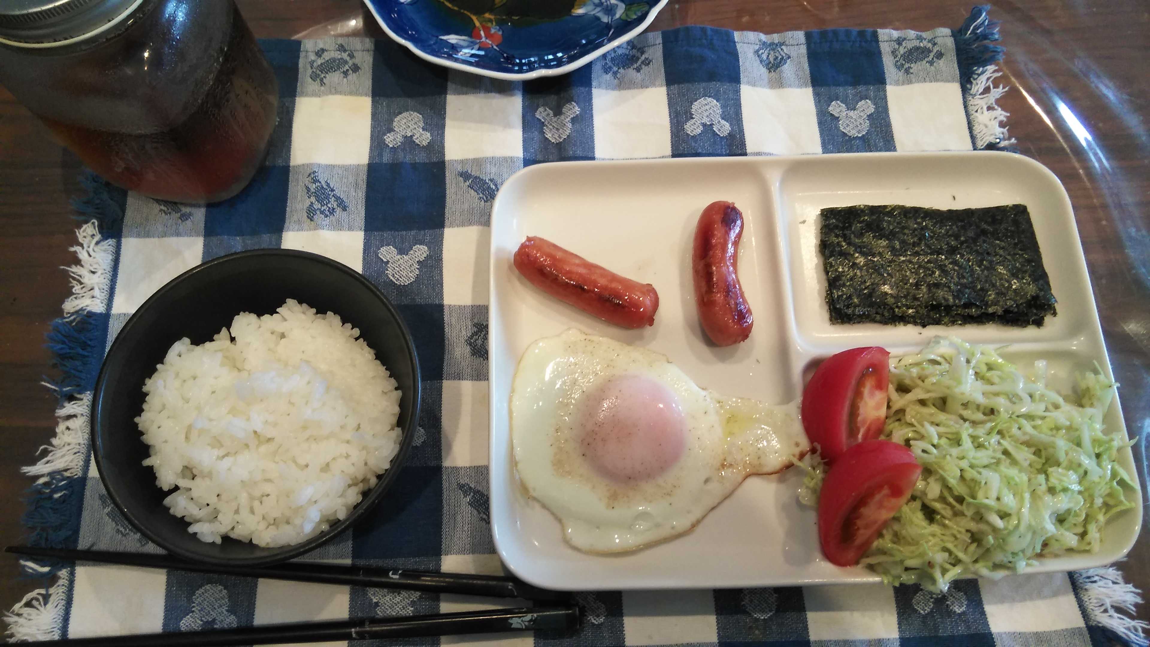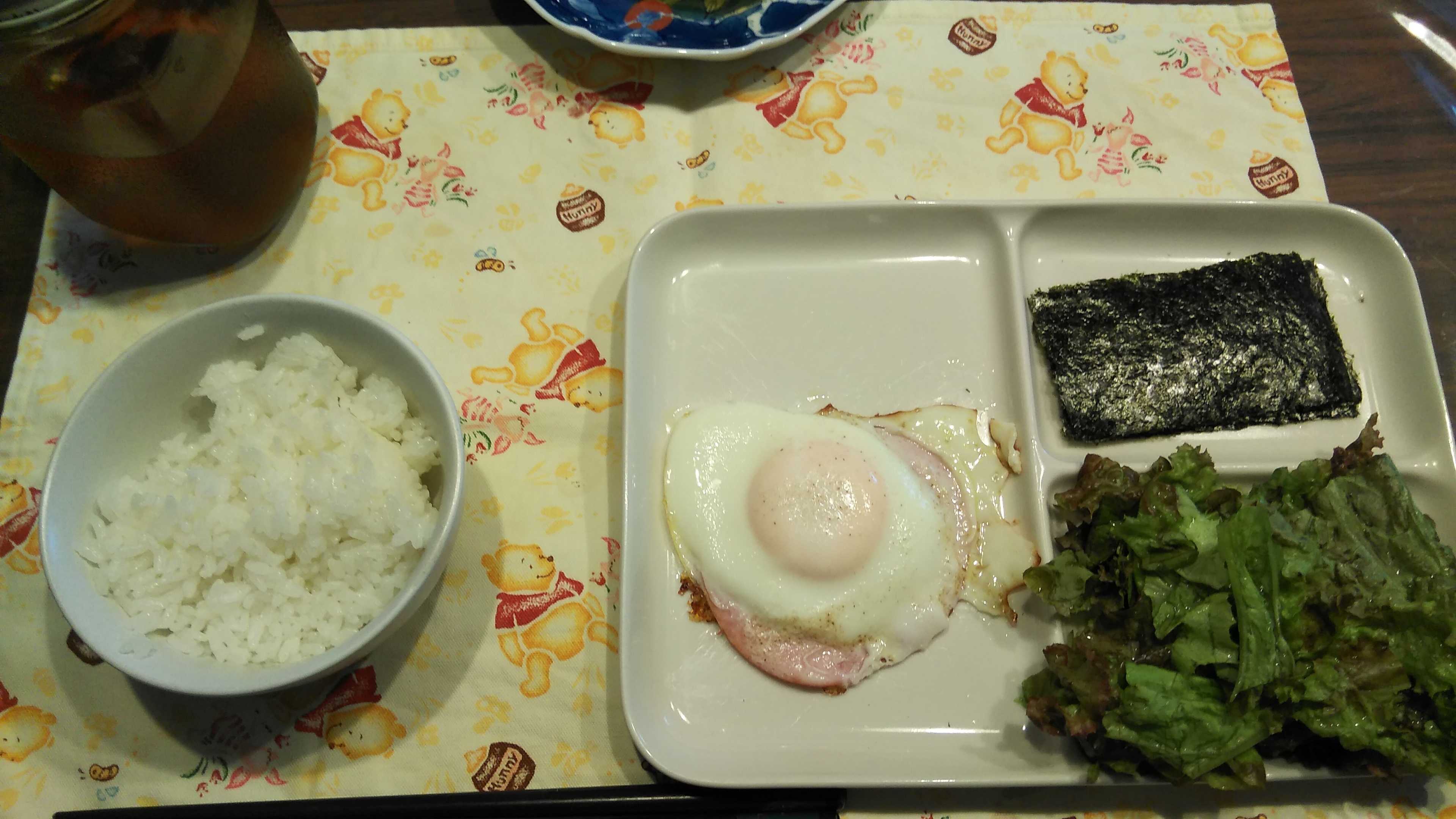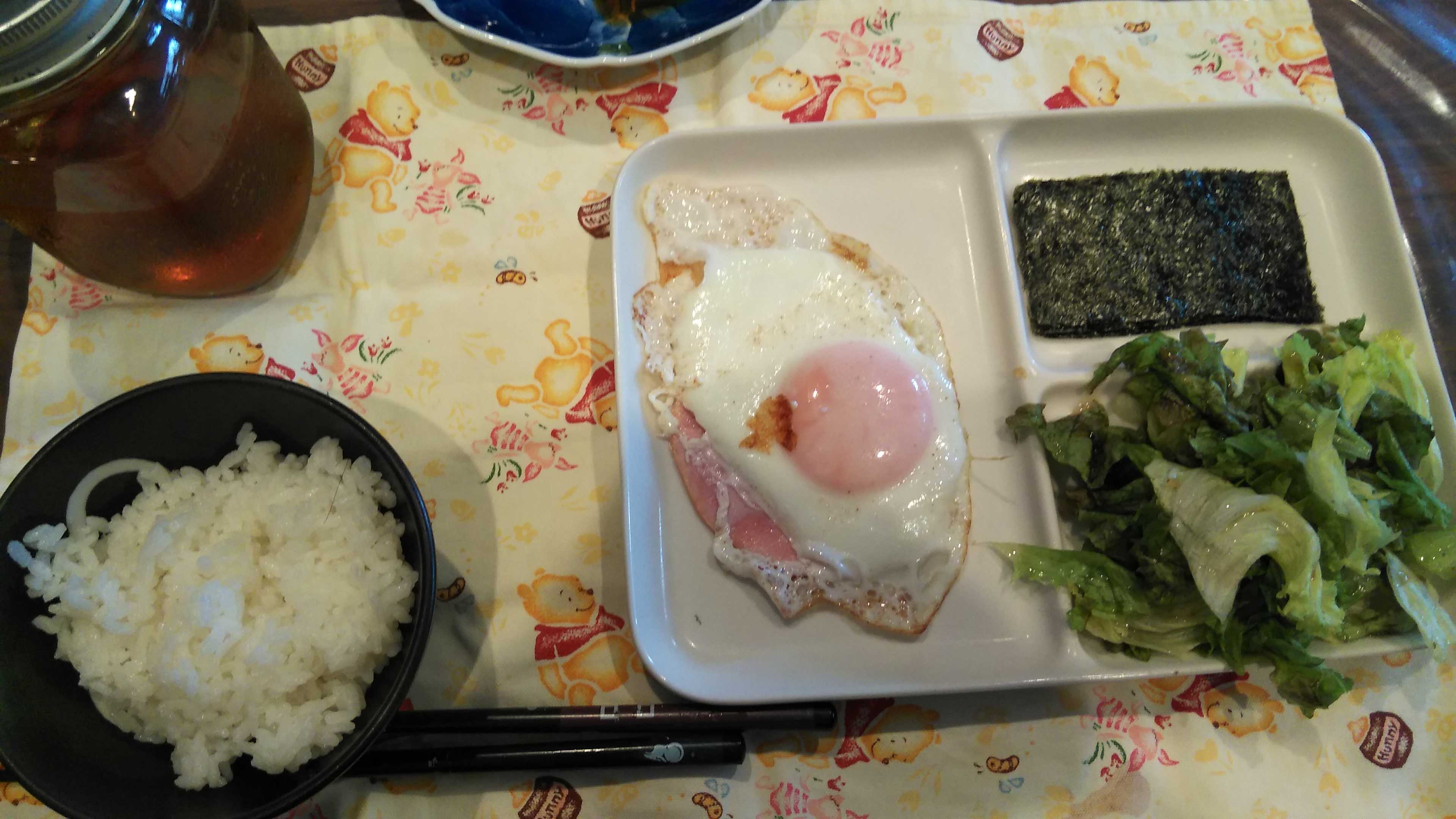 朝食→サラダ、ウィンナー2本、目玉焼き、焼きのり、ご飯、紅茶朝食後→カフェオレ昼食→サラダ、イチゴジャムヨーグルト、ツナチーズトースト、牛乳夕食→トマト、サラダ、ピーマン炒め、焼きポークメンチ、ご飯、カボチャの味噌汁、紅茶夕食後→アイスコーヒー