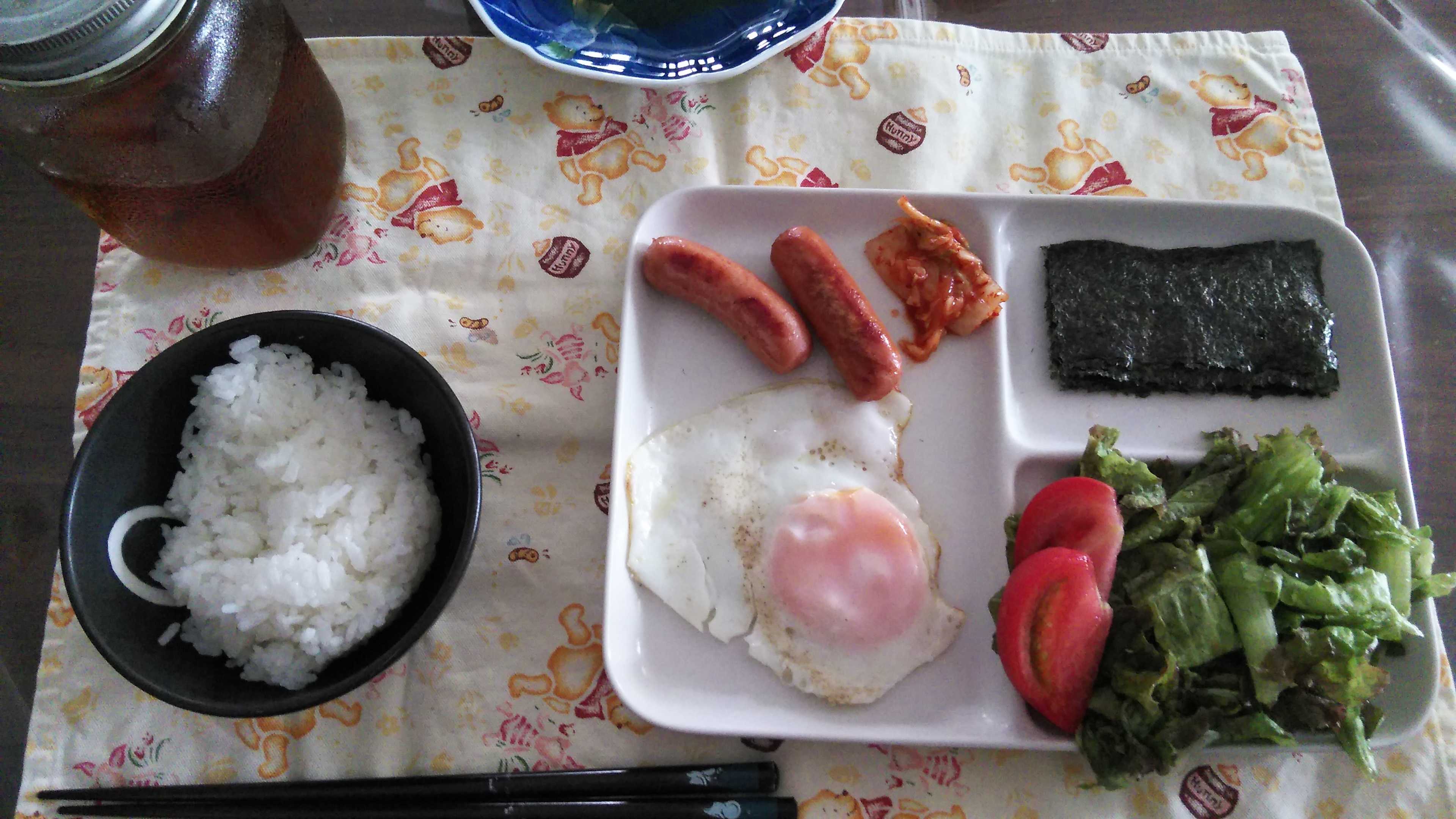 朝食→トマト、サラダ、ウィンナー2本、目玉焼き、キムチ、焼きのり、ご飯、紅茶朝食後→カフェオレ昼食→サラダ、イチゴジャムヨーグルト、ツナチーズトースト、牛乳夕食→トマト、サラダ、ポークハンバーグ、冷奴、ご飯、エノキダケのお吸い物夕食後→アイスコーヒー