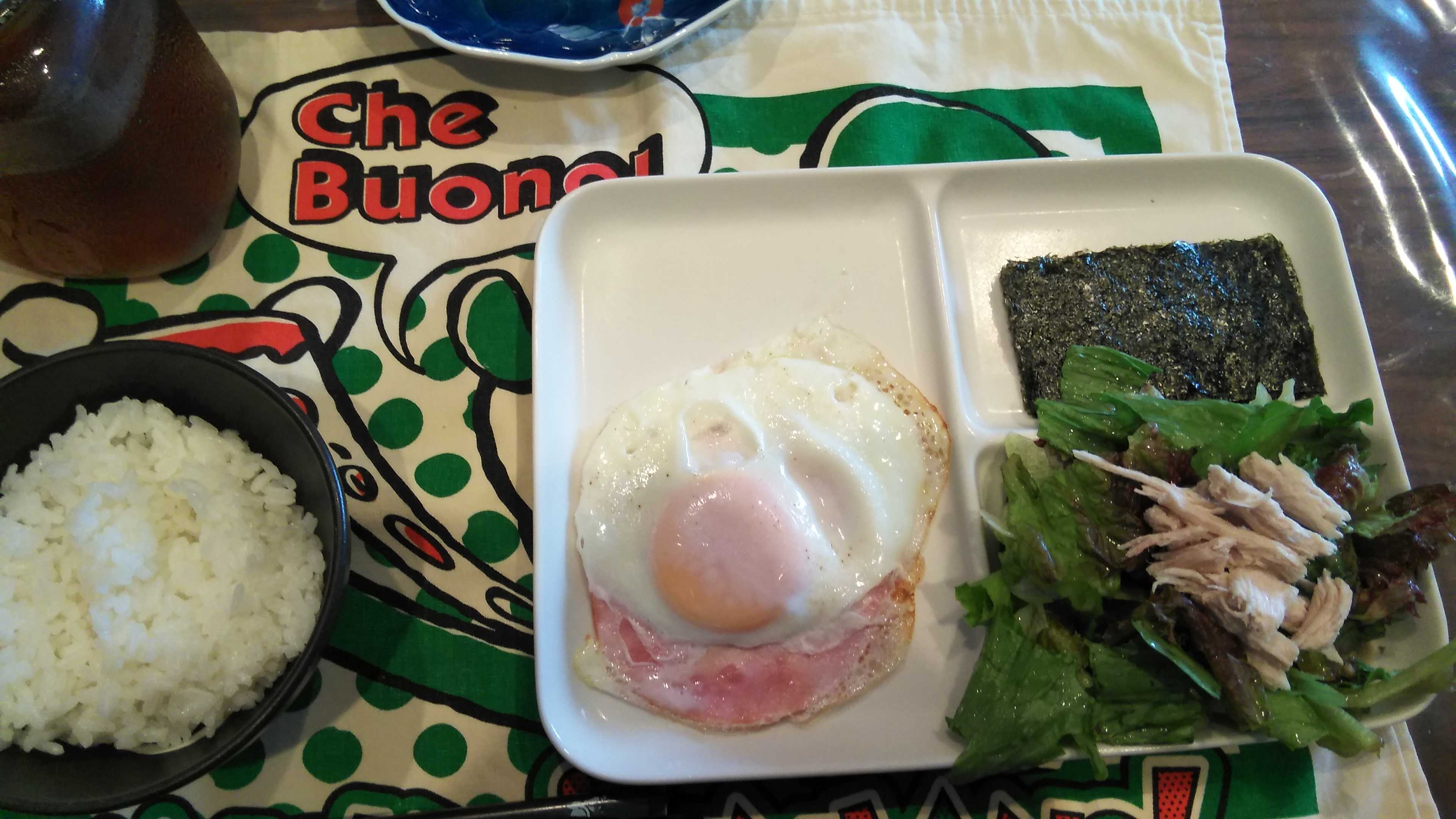 朝食→鶏ささみサラダ、ハムエッグ、焼きのり、ご飯、紅茶朝食後→カフェオレ昼食→サラダ、イチゴジャムヨーグルト、チーズハムトースト、豆乳ココア夕食→サラダ、ニラ玉炒め、鮭ときのこの豆乳クリーム、オクラのお吸い物、ご飯、紅茶夕食後→アイスコーヒー