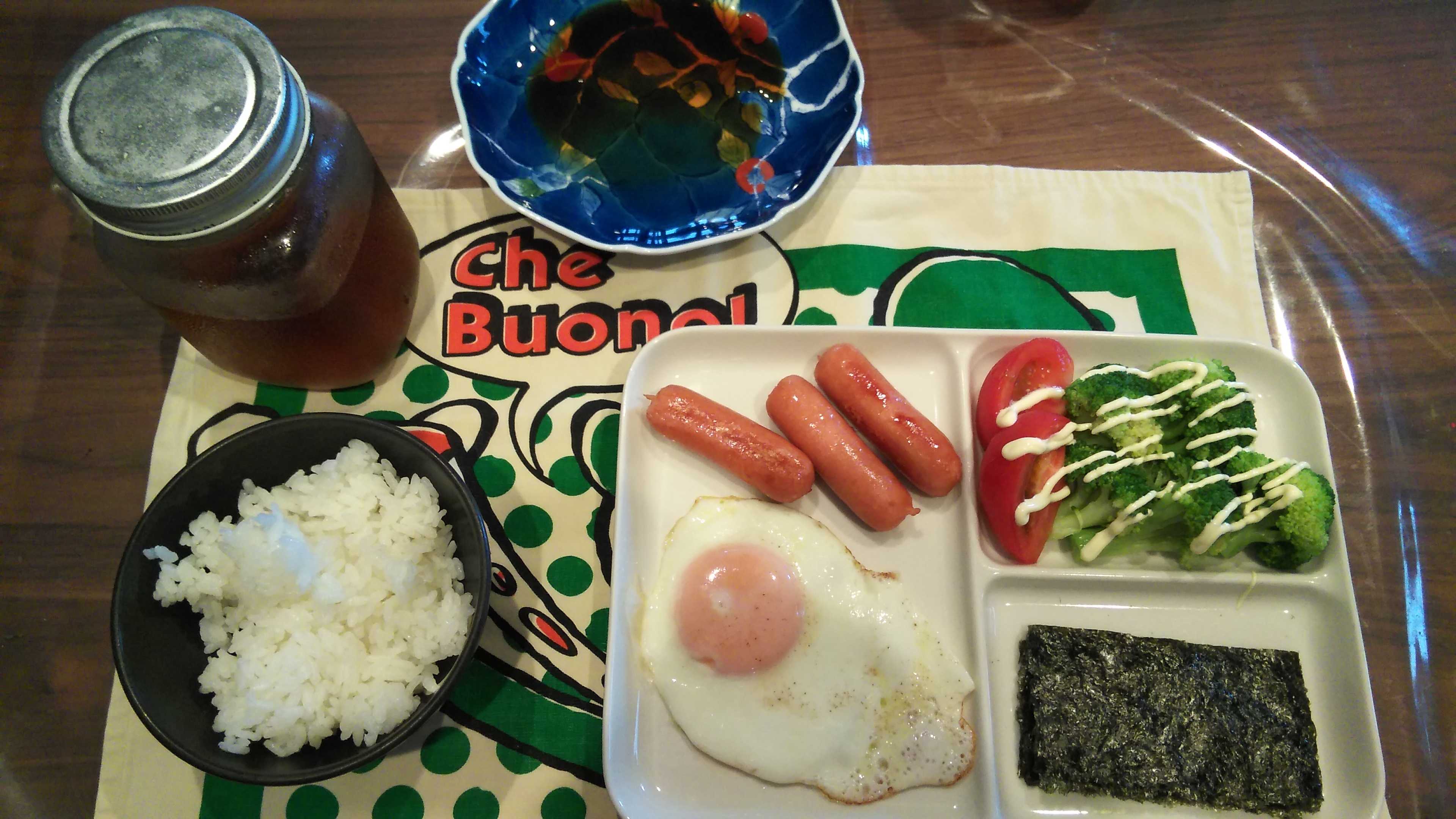 朝食→トマト、サラダ、ウィンナー2本、目玉焼き、焼きのり、ご飯、紅茶朝食後→カフェオレ昼食→サラダ、ブルーベリージャムヨーグルト、チーズハムトースト、豆乳ココア夕食→トマト、ブロッコリーサラダ、冷奴、茄子のグラタン、ご飯、ワカメと卵のコンソメスープ、紅茶夕食後→アイスコーヒー