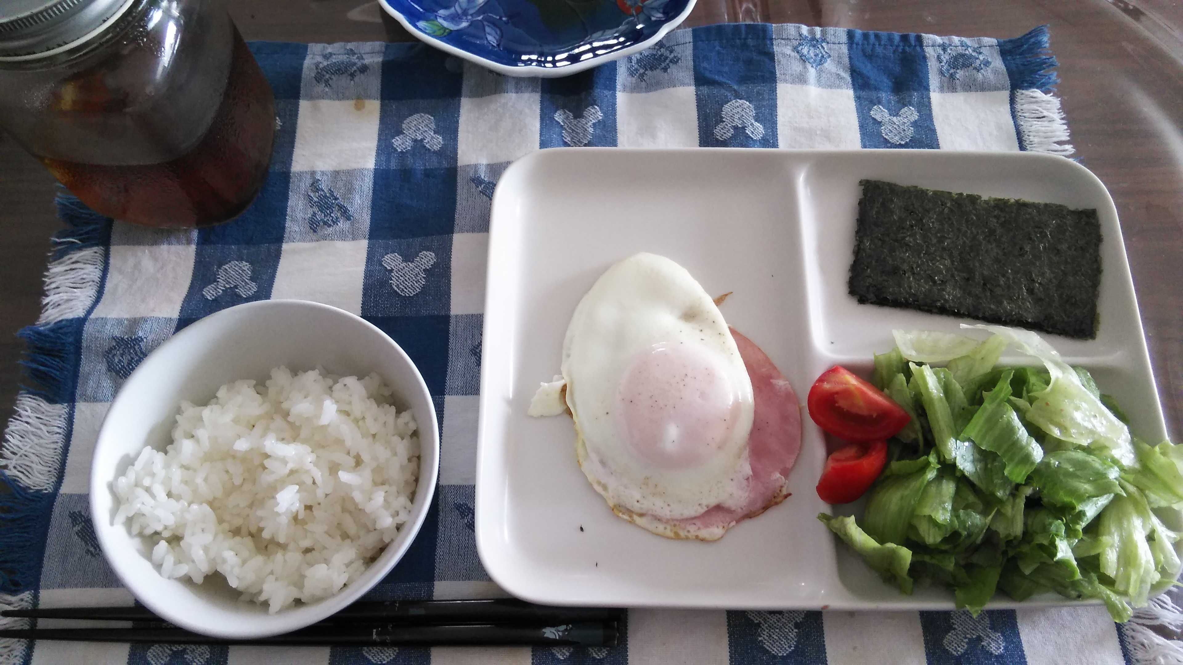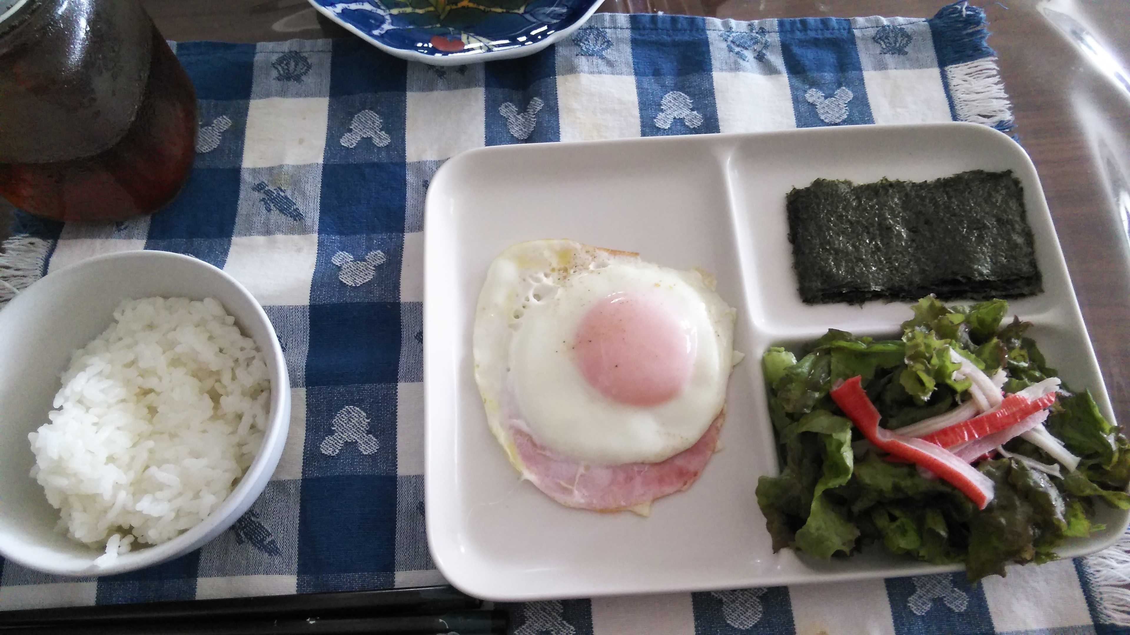 朝食→サラダ、ハムエッグ、焼きのり、ご飯、紅茶朝食後→カフェオレ昼食→カニカマサラダ、イチゴジャムヨーグルト、チーズハムトースト、豆乳ココア夕食→トマト、サラダ、きのこの卵とじ、豚肉のわさび醤油焼き、わかめの味噌汁、ご飯、紅茶夕食後→アイスコーヒー