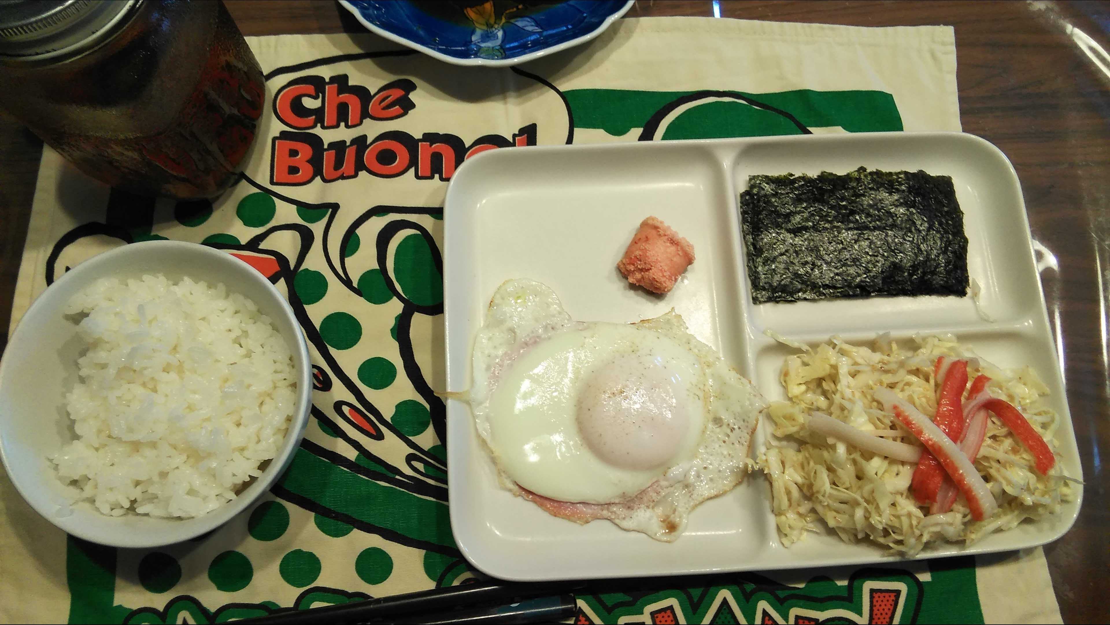 朝食→カニカマサラダ、焼き明太子、ハムエッグ、焼きのり、ご飯、紅茶朝食後→カフェオレ昼食→カニカマサラダ、イチゴジャムヨーグルト、チーズハムトースト、豆乳ココア夕食→カニカマサラダ、焼きビーフン、茄子の味噌汁、紅茶夕食後→アイスコーヒー