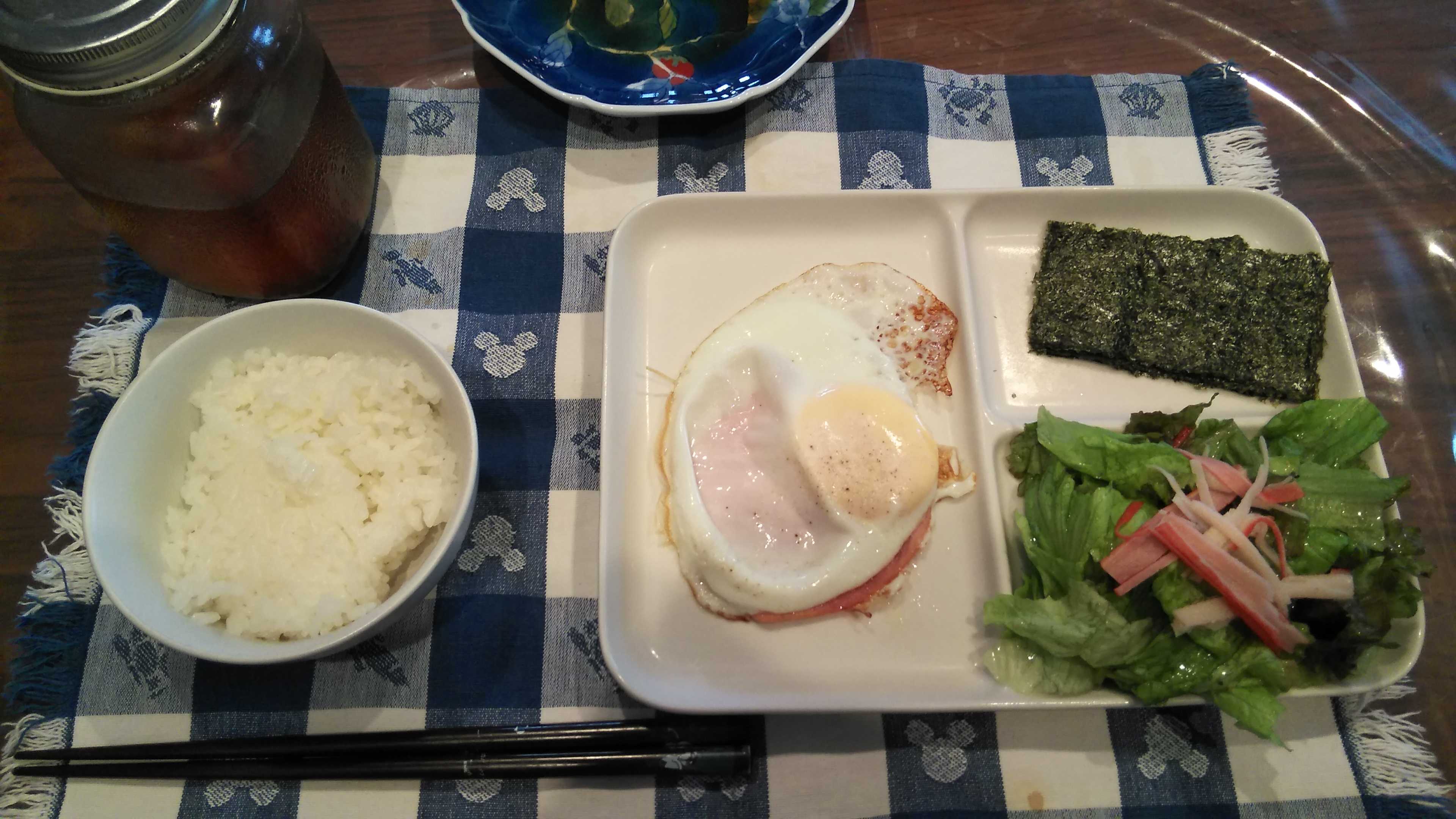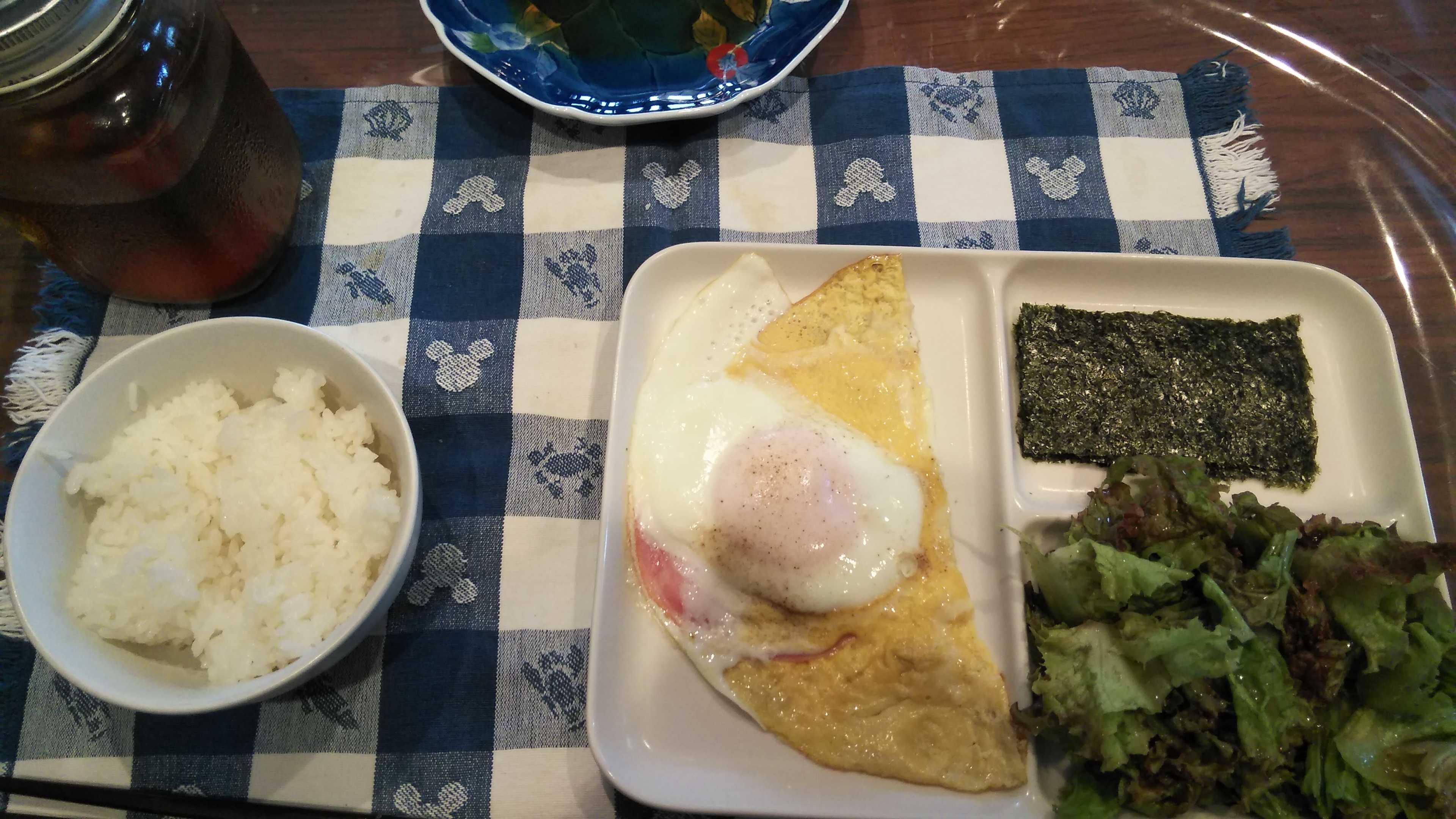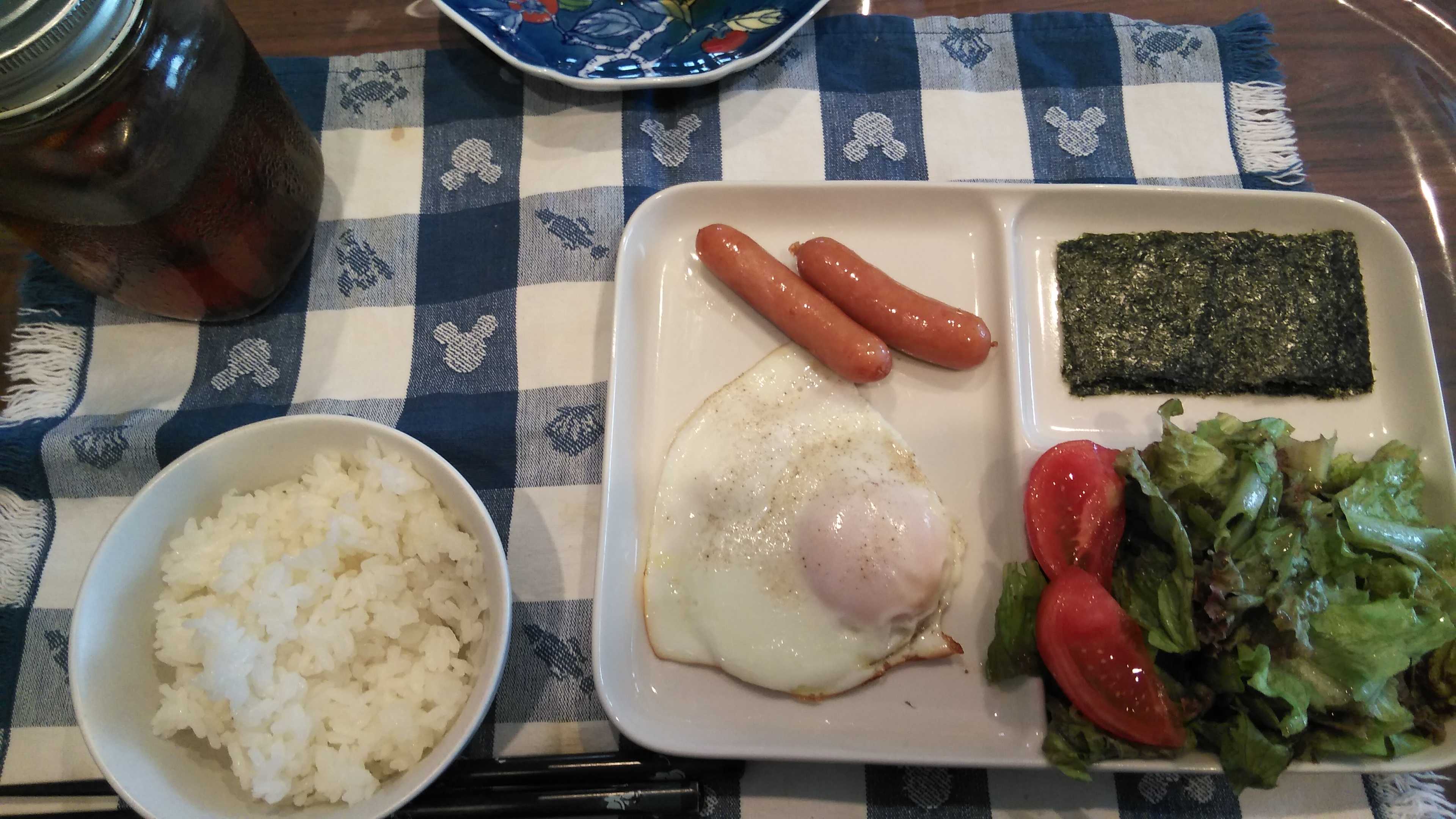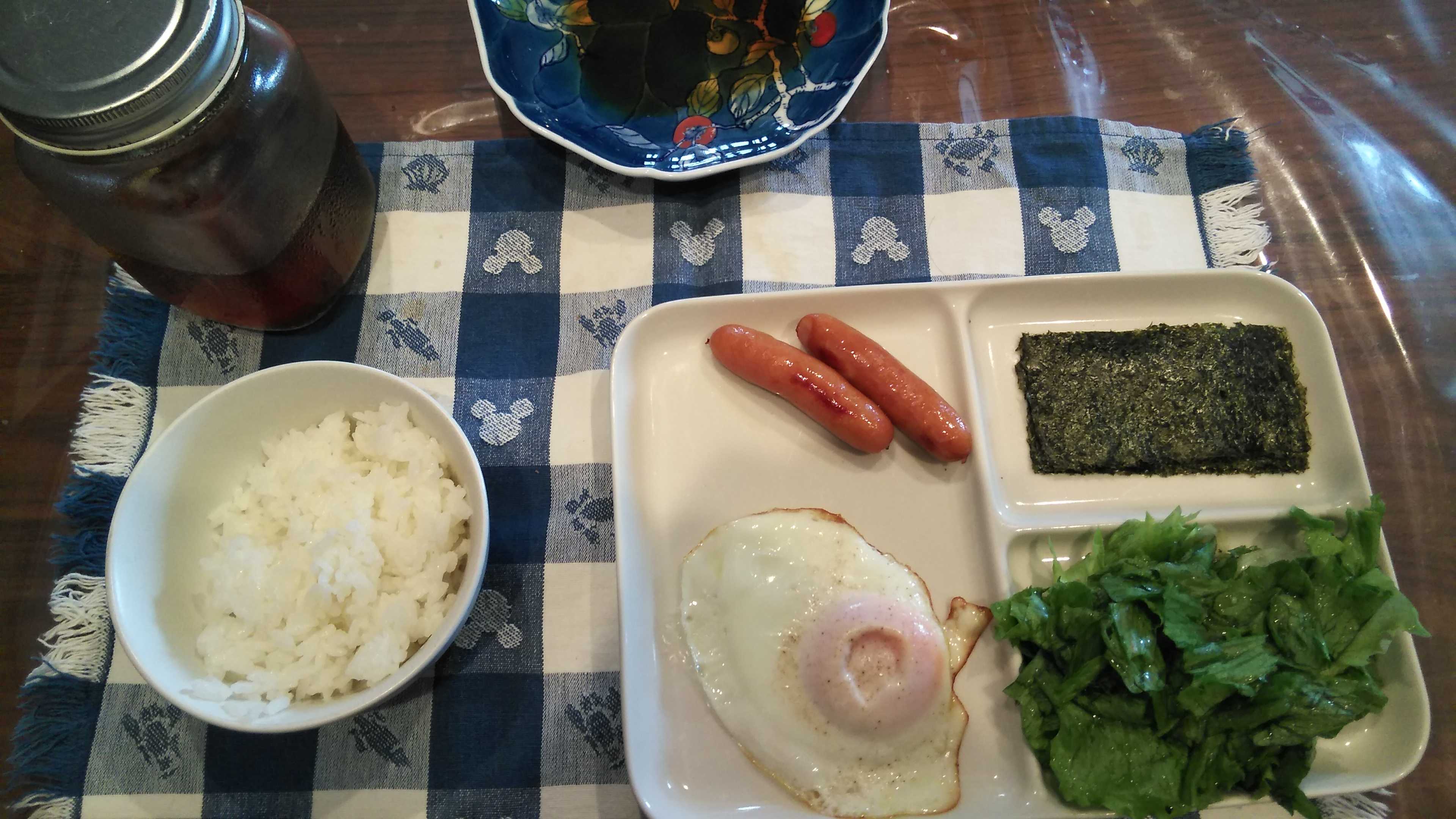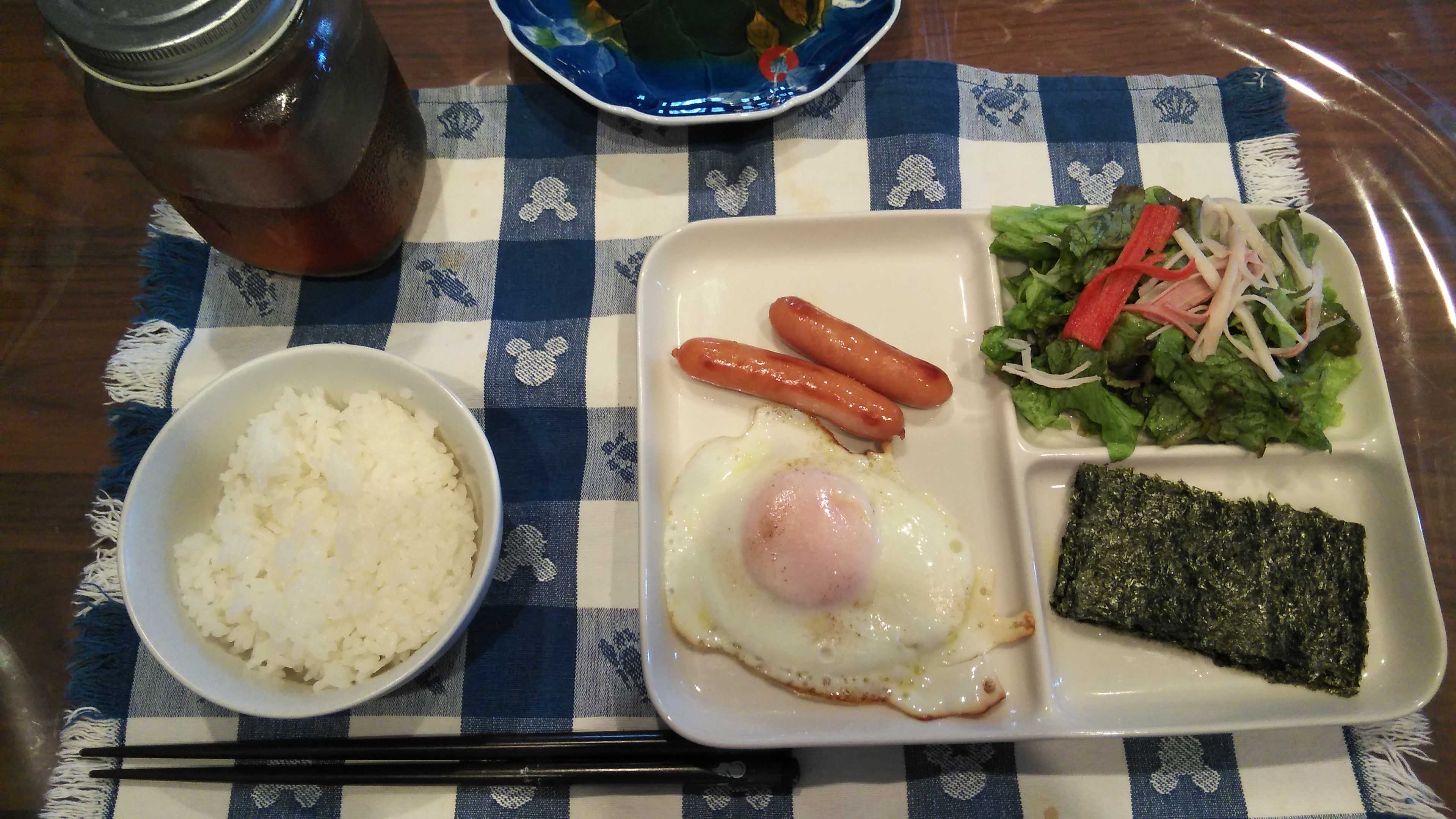 朝食→サラダ、ウィンナー3本、目玉焼き、焼きのり、ご飯、紅茶朝食後→カフェオレ昼食→サラダ、ブルーベリージャムヨーグルト、ツナチーズトースト、牛乳夕食→サラダ、ピーマンとウインナー炒め、厚揚げのピリ辛あんかけ、ご飯、カボチャの味噌汁、紅茶夕食後→アイスコーヒー