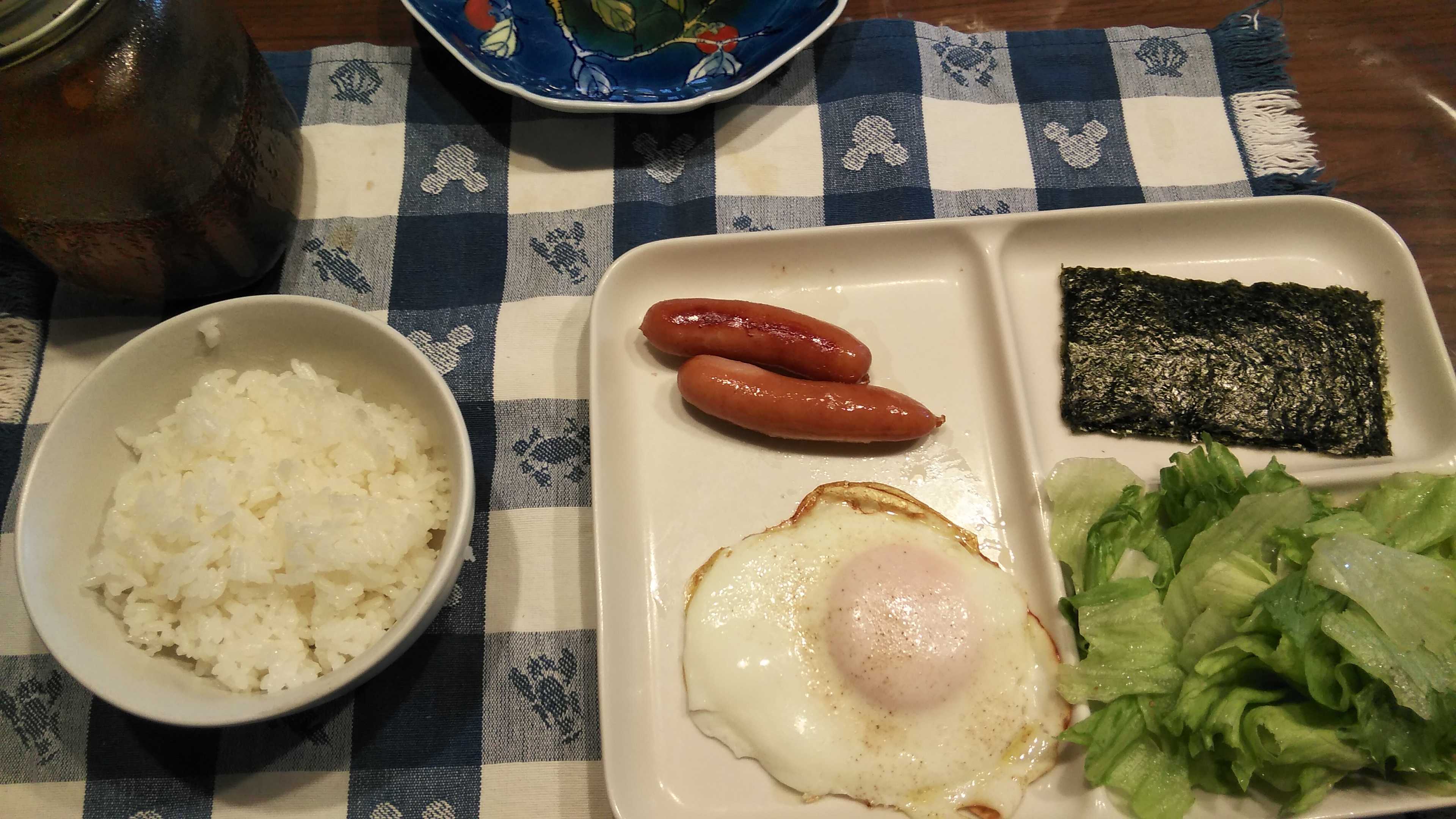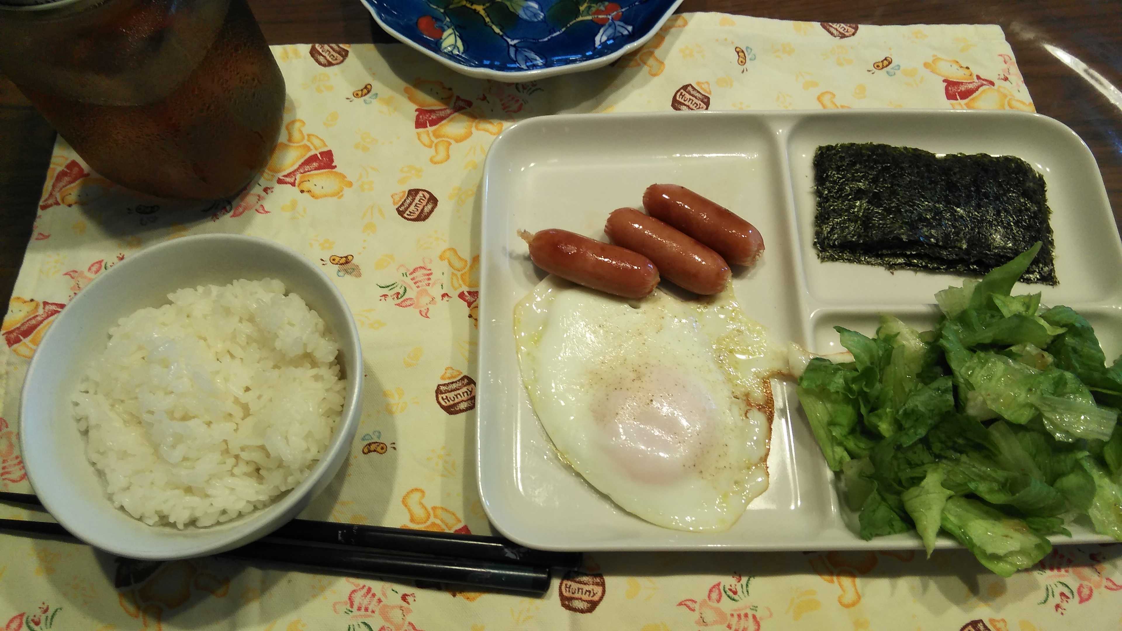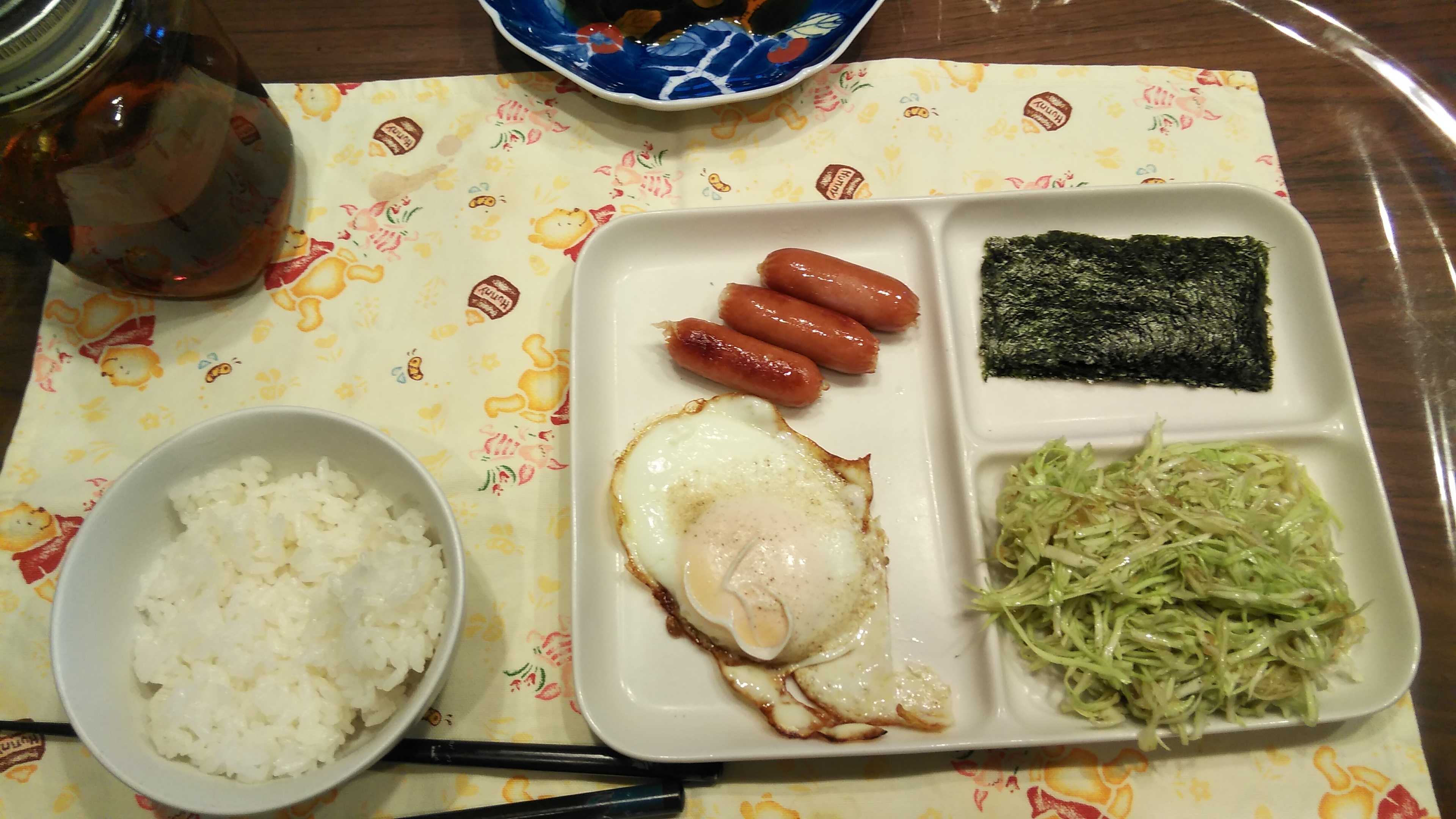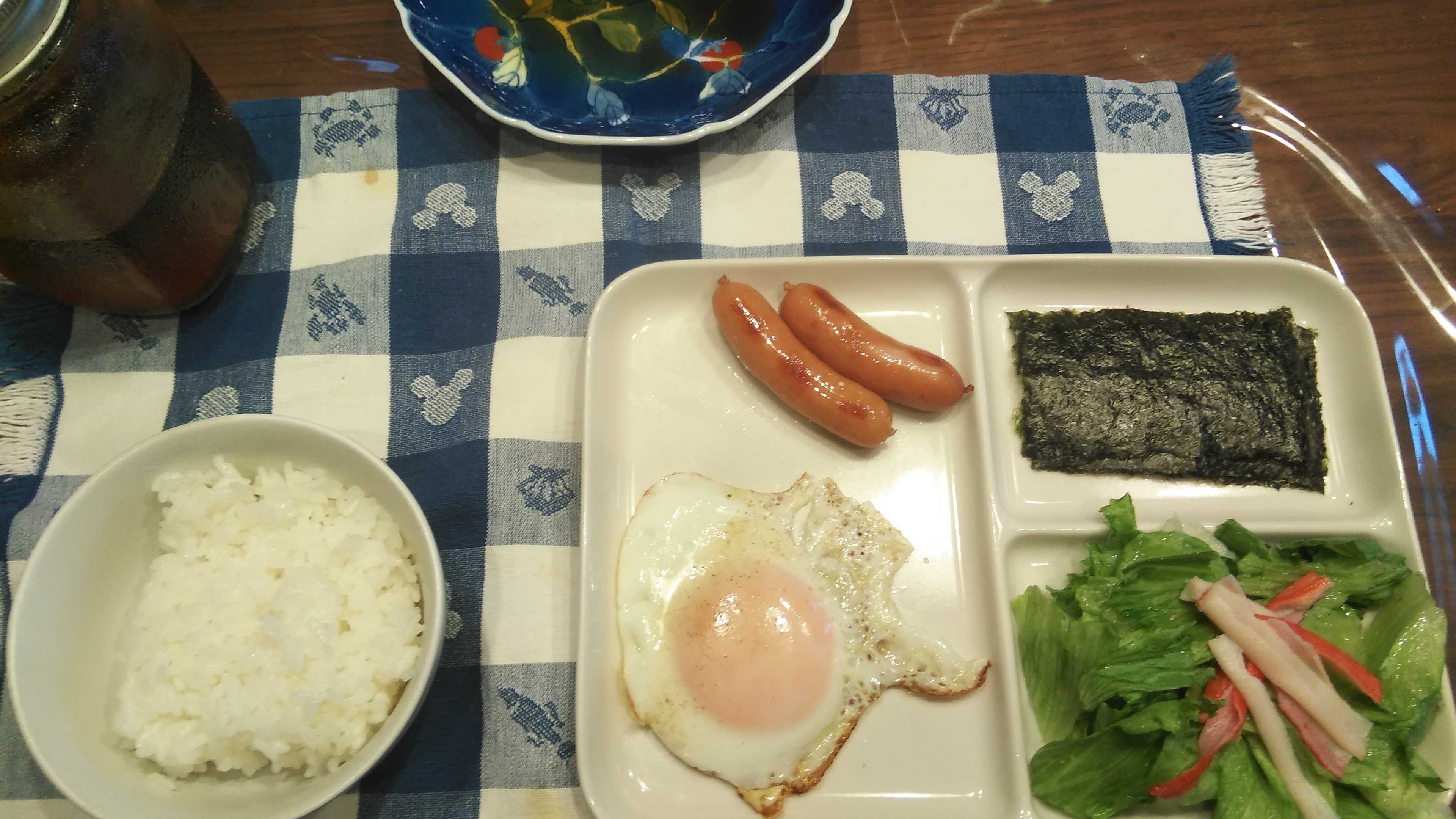 朝食→サラダ、ウィンナー3本、目玉焼き、焼きのり、ご飯、紅茶朝食後→カフェオレ昼食→サラダ、チーズハムトースト1/2、カップヌードル辛麺、豆乳ココア夕食→サラダ、ピーマンとウインナー炒め、チーズのせポークハンバーグ、ミネストローネ風スープ、ご飯、紅茶夕食後→アイスコーヒー