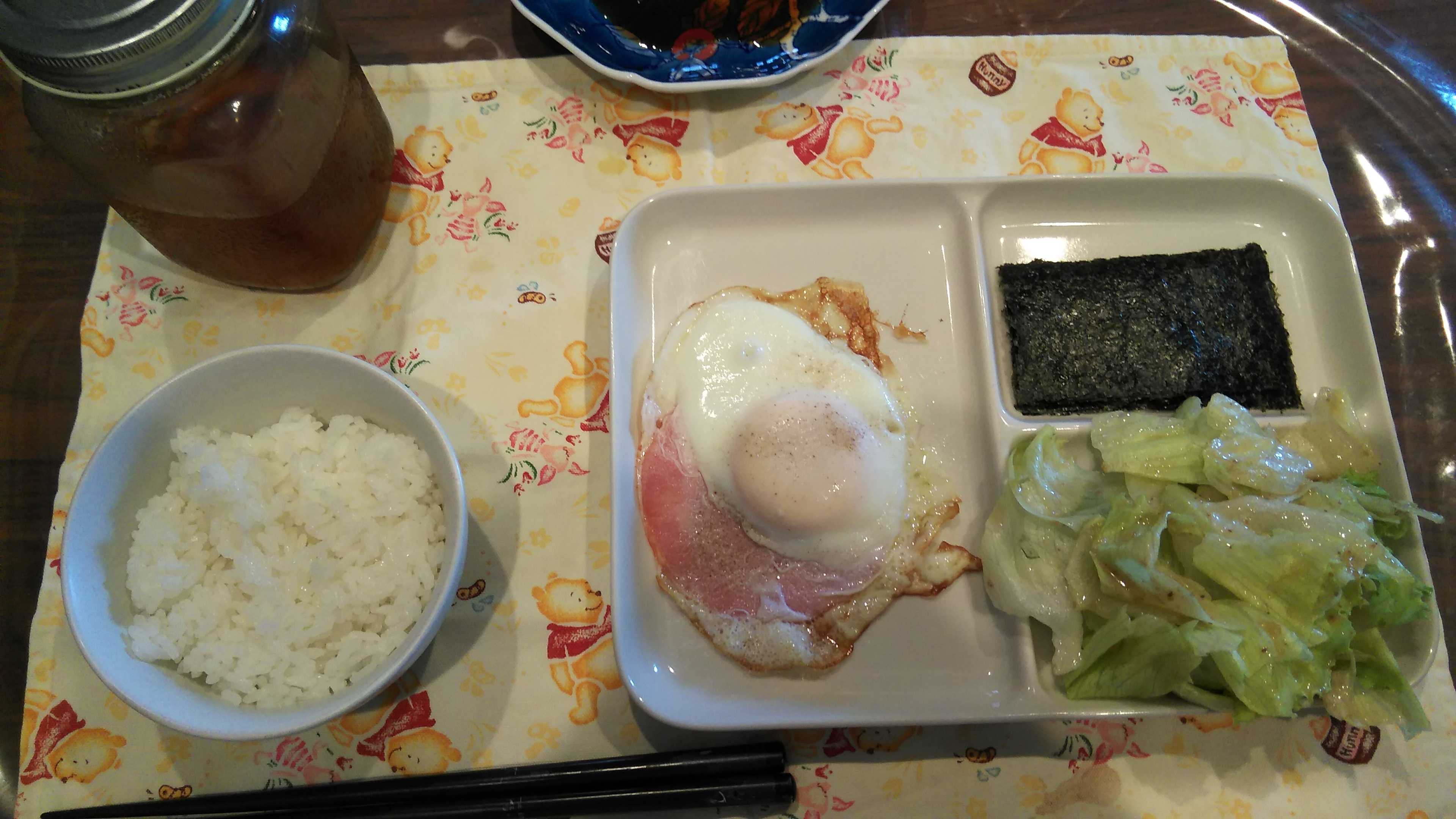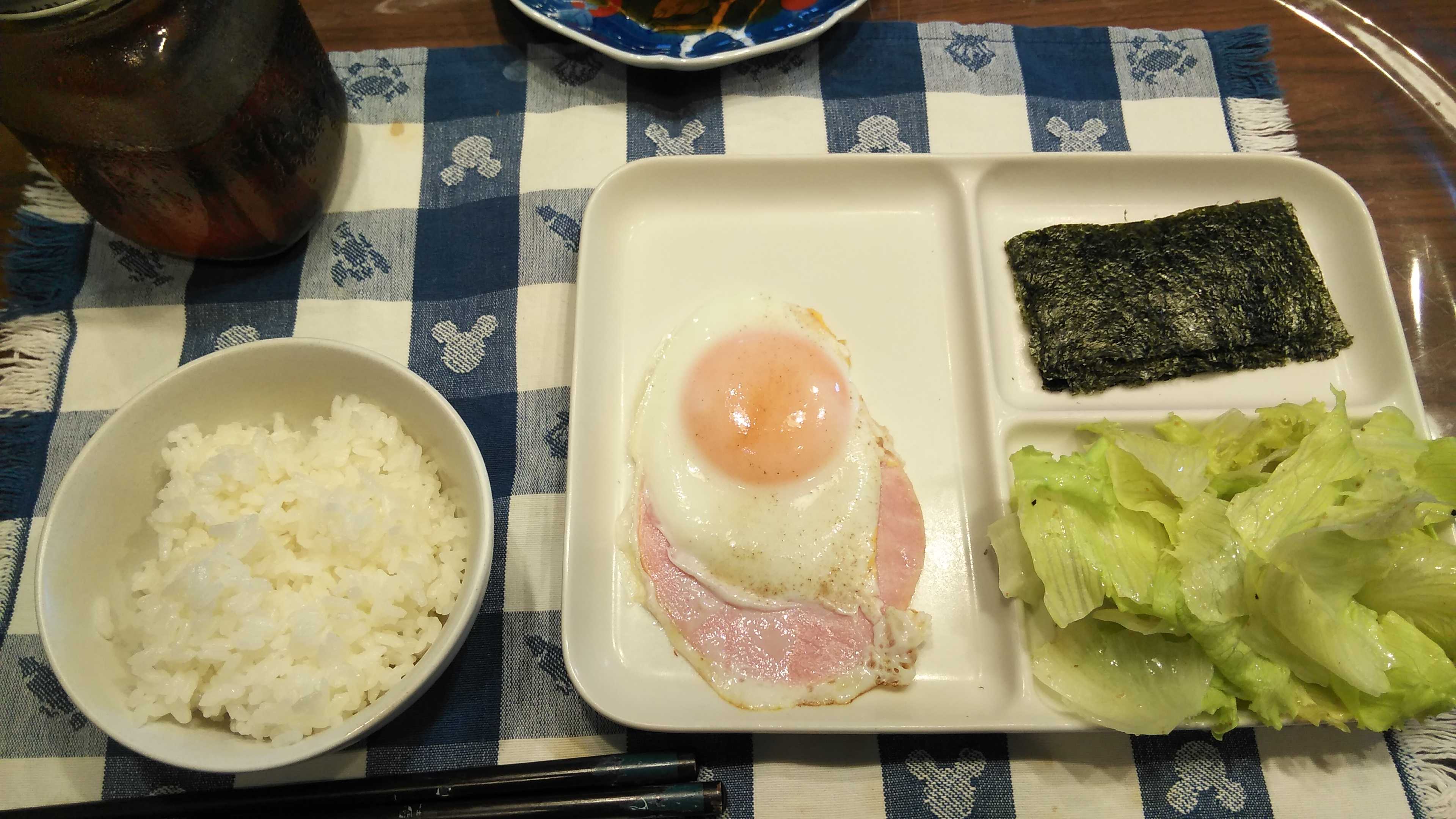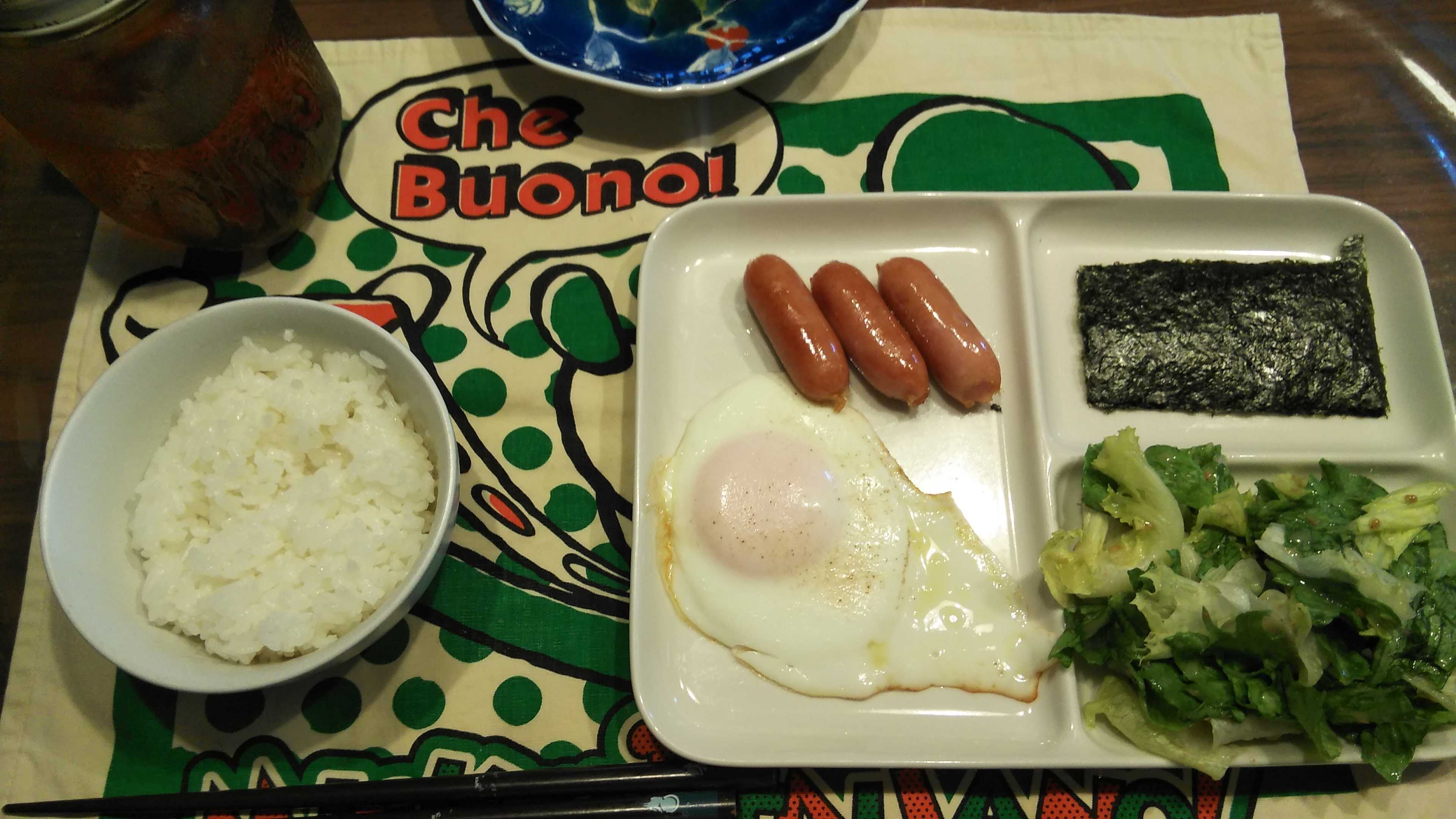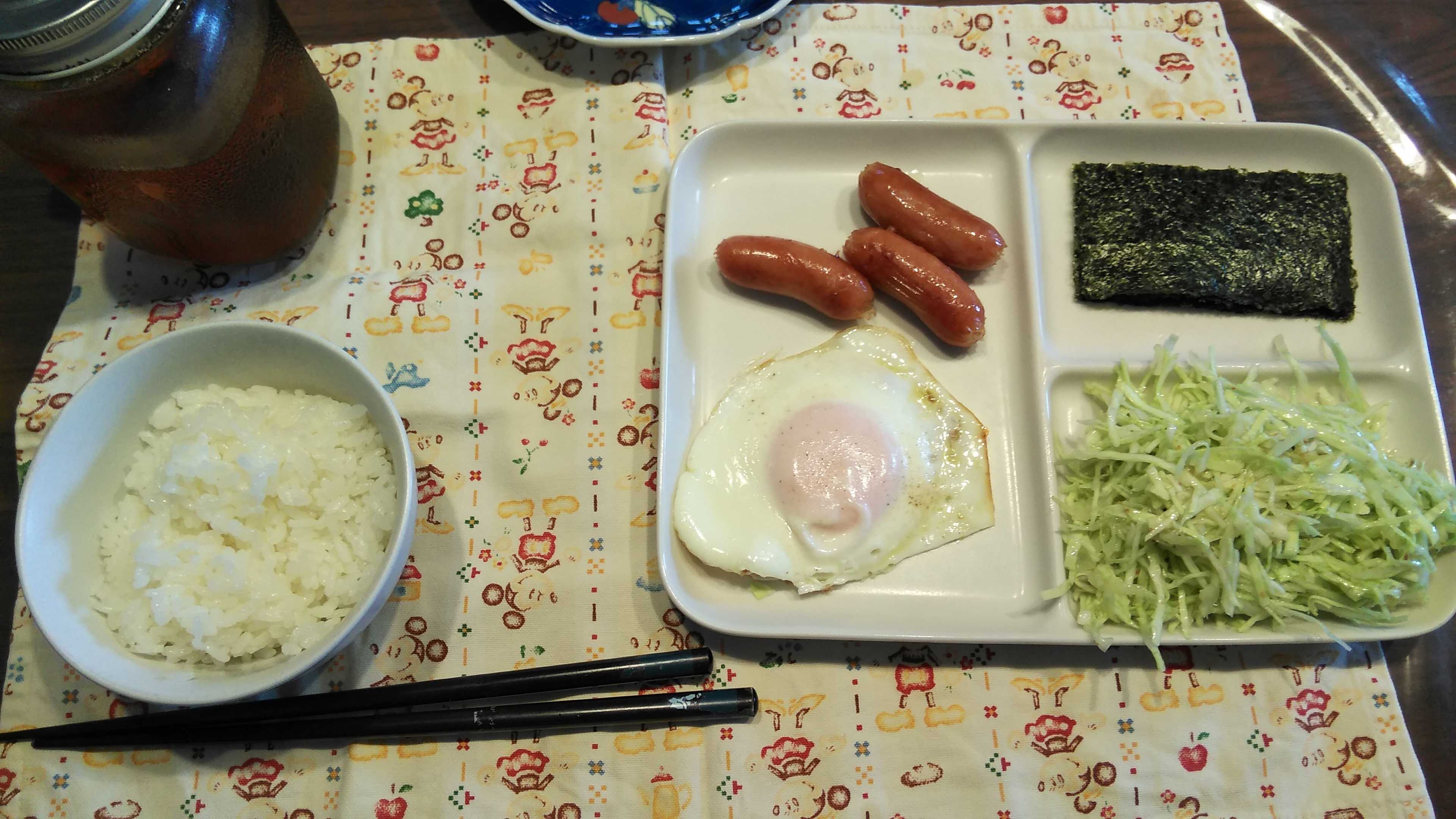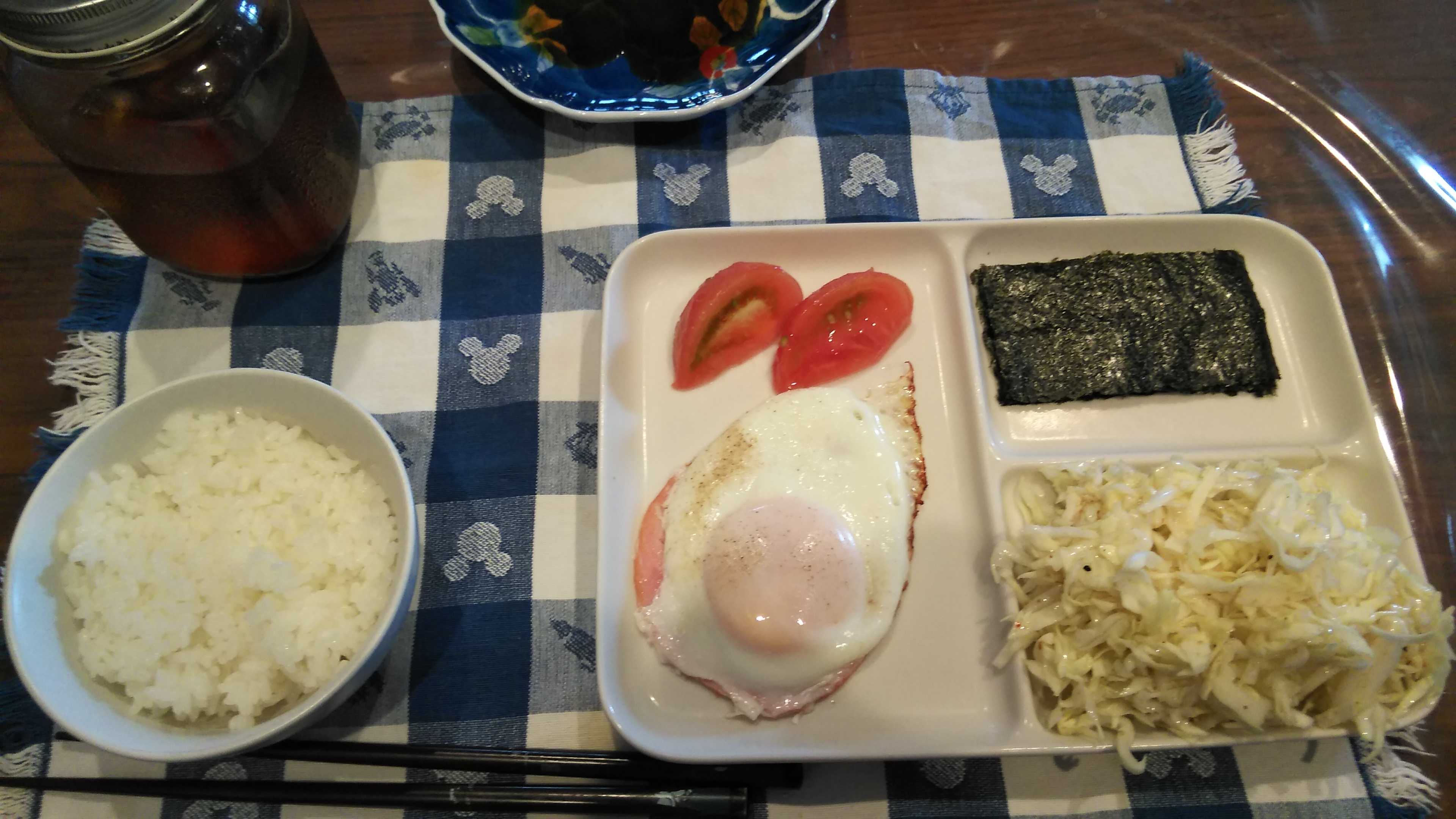 朝食→サラダ、ウィンナー3本、目玉焼き、焼きのり、ご飯、紅茶朝食後→カフェオレ昼食→サラダ、チーズハムトースト1/2、カップヌードル辛麺、豆乳ココア夕食→サラダ、ピーマンとウインナー炒め、チーズのせポークハンバーグ、ミネストローネ風スープ、ご飯、紅茶夕食後→アイスコーヒー