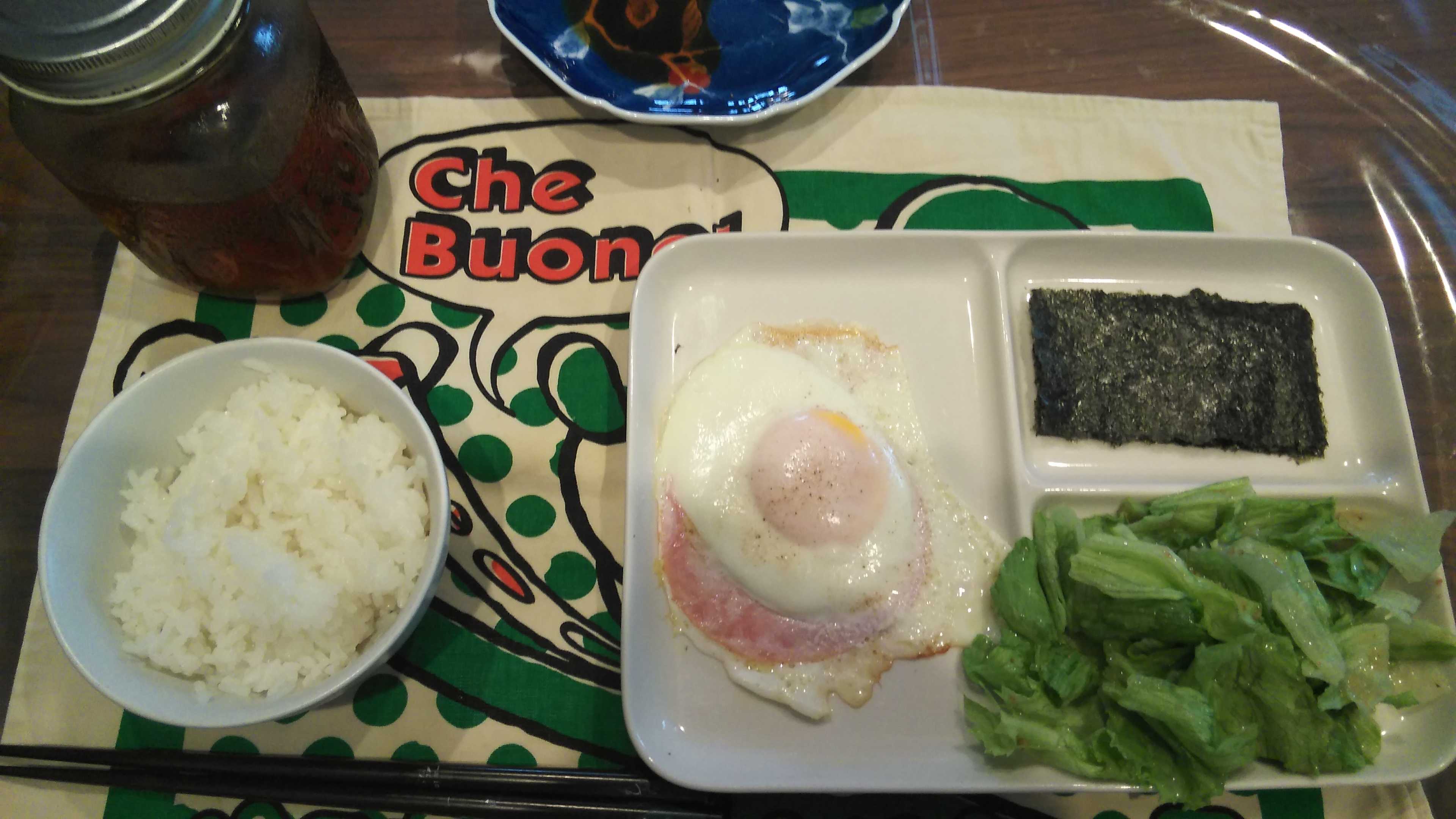 朝食→サラダ、ハムエッグ、焼きのり、ご飯、紅茶朝食後→カフェオレ昼食→サラダ、イチゴジャムヨーグルト、チーズハムトースト、豆乳ココア夕食→サラダ、ニラと卵の炒め物、シュウマイ、キャベツのコンソメスープ、ご飯、紅茶夕食後→アイスコーヒー
