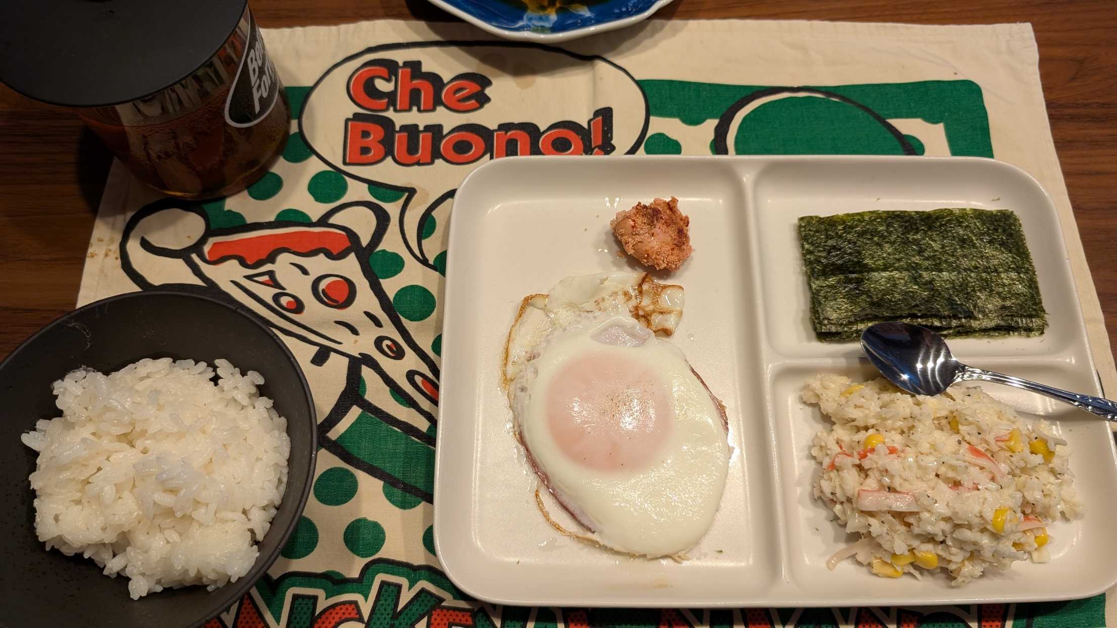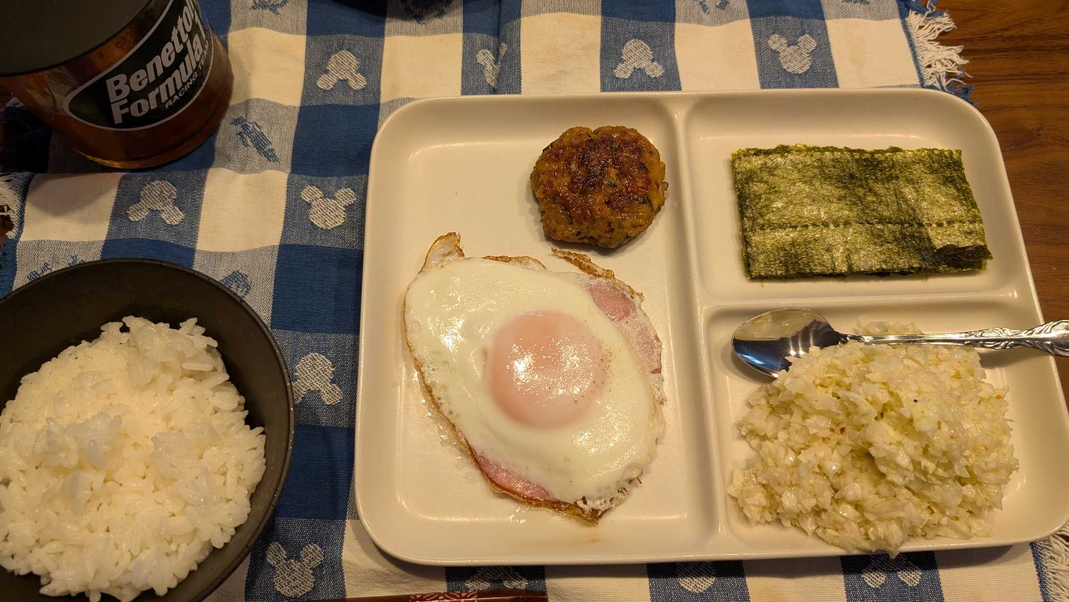 朝食→サラダ、ハムエッグ、焼きのり、ご飯、ハト麦茶朝食後→アイスコーヒー昼食→サラダ、桃ジャムヨーグルト、エースコック・スーパーカップ北海道コーン塩バター、ハト麦茶午後→アイスコーヒー夕食→サラダ、人参しりしり、豚肉のゴマゴマ焼き、ご飯、エノキダケの味噌汁、ハト麦茶