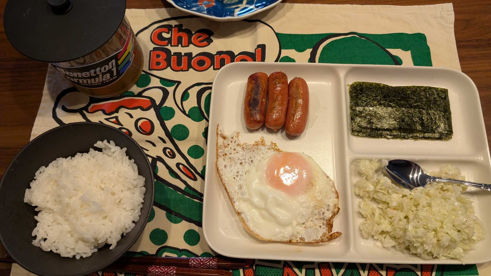 朝食→コールスローサラダ、ウィンナー3本、目玉焼き、焼きのり、ご飯、ルイボスティー朝食後→アイスコーヒー昼食→コールスローサラダ、桃ジャムヨーグルト、各種菓子パン、ルイボスティー夕食→サラダ、ナポリタン、ルイボスティー