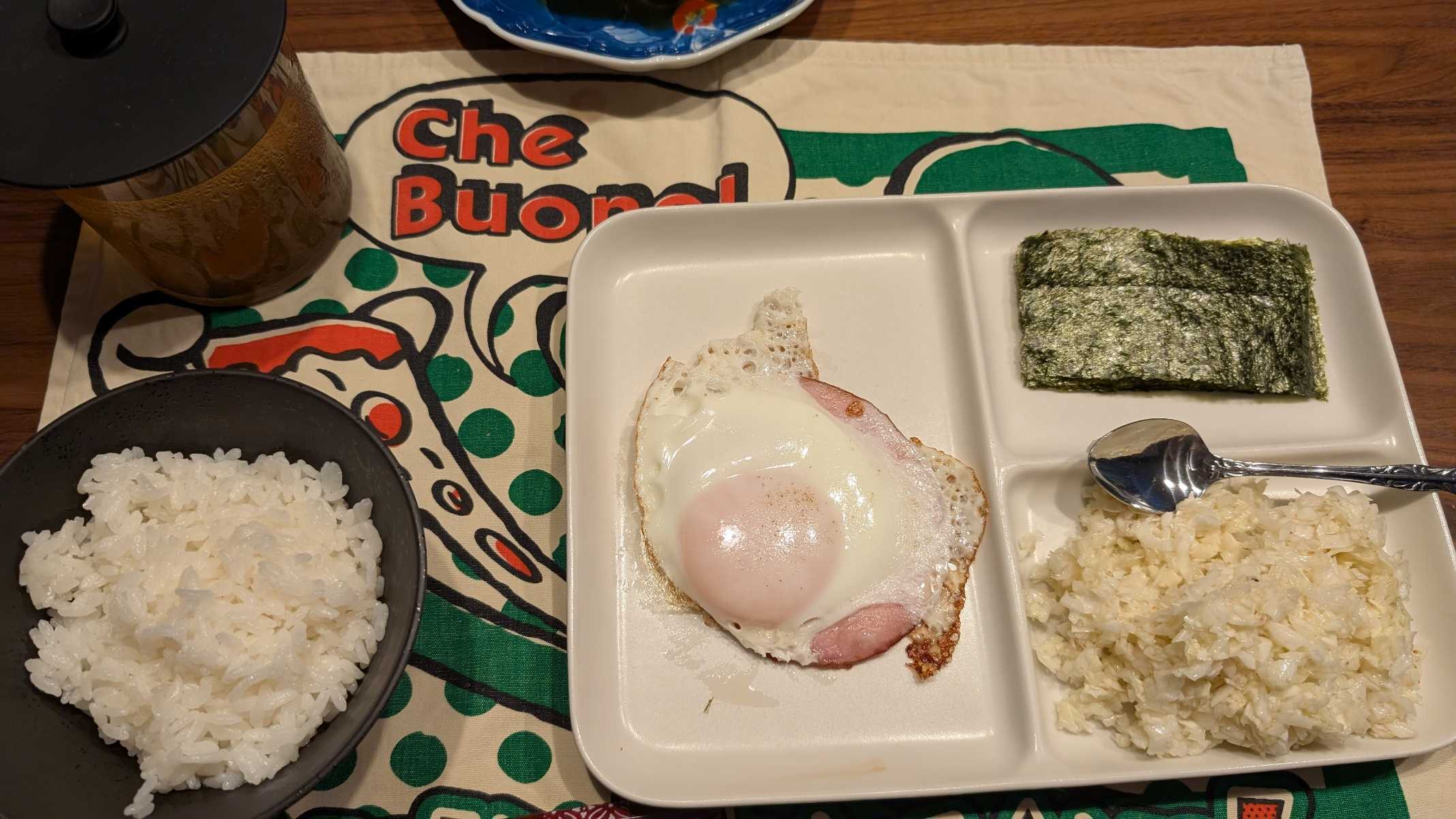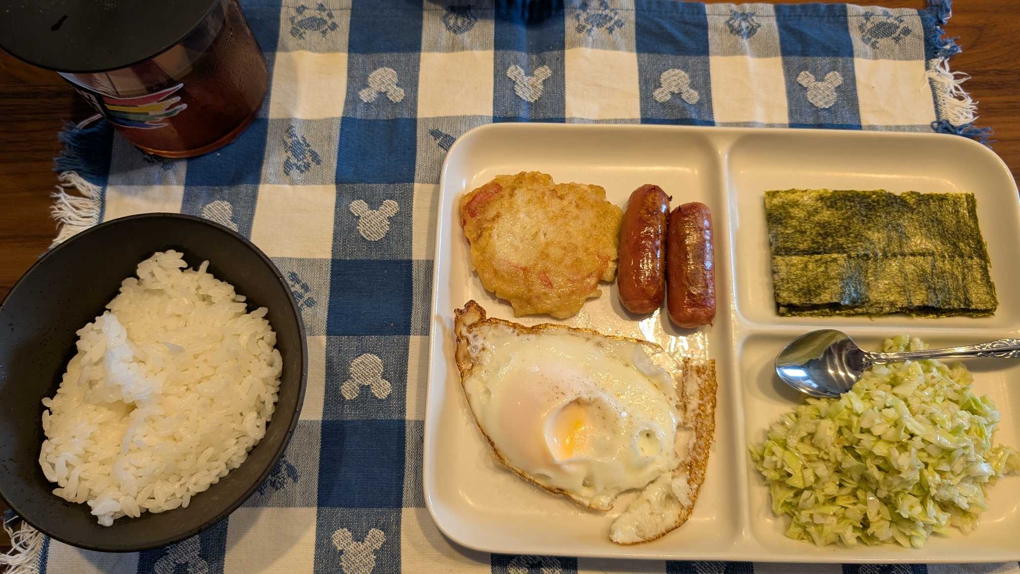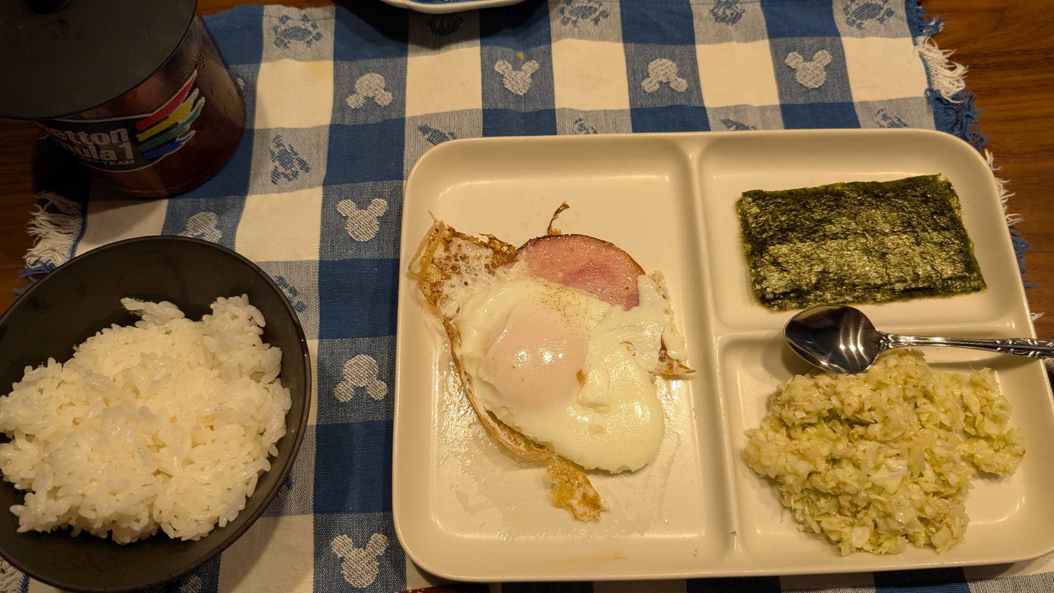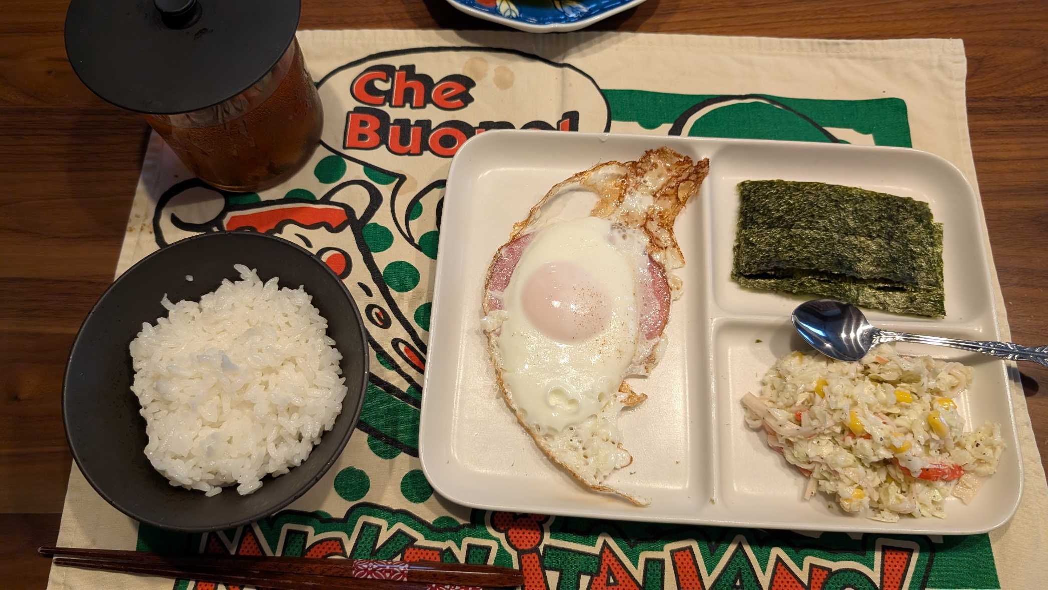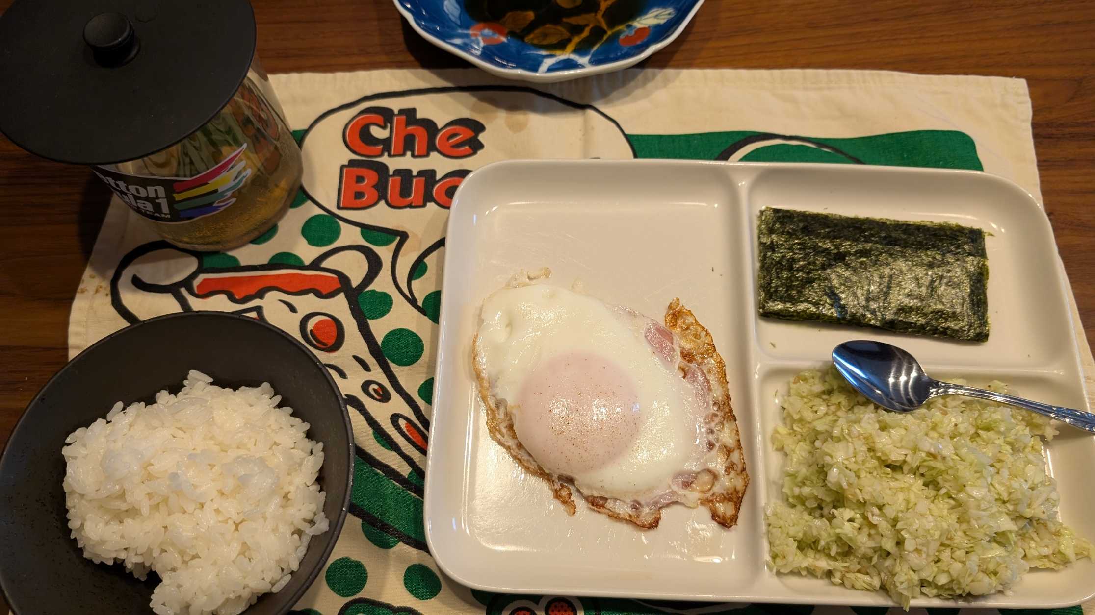朝食→コールスローサラダ、ハムエッグ、焼き明太子、焼きのり、ご飯、ルイボスティー朝食後→アイスコーヒー昼食→サラダ、イチゴジャムヨーグルト、チーズハムトースト、アイスコーヒー夕食→コールスローサラダ、竹輪と豆苗の胡麻和え、卵納豆、ご飯、茄子の味噌汁、ルイボスティー