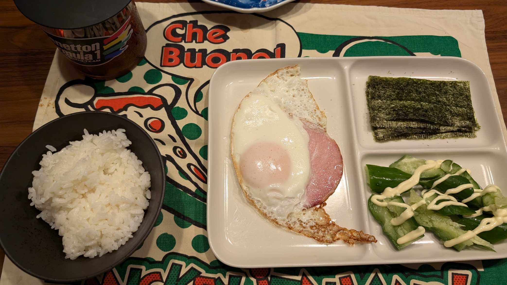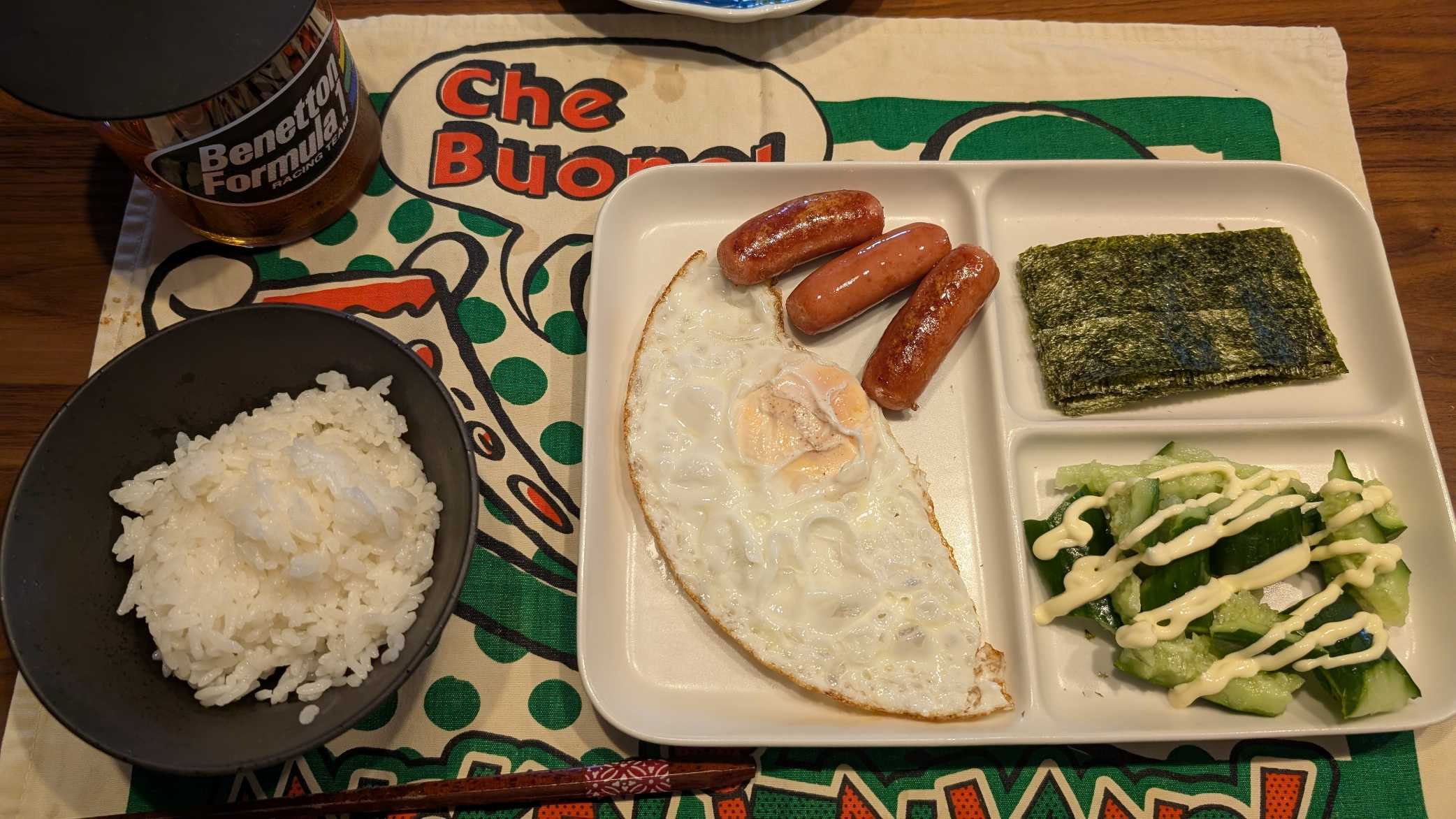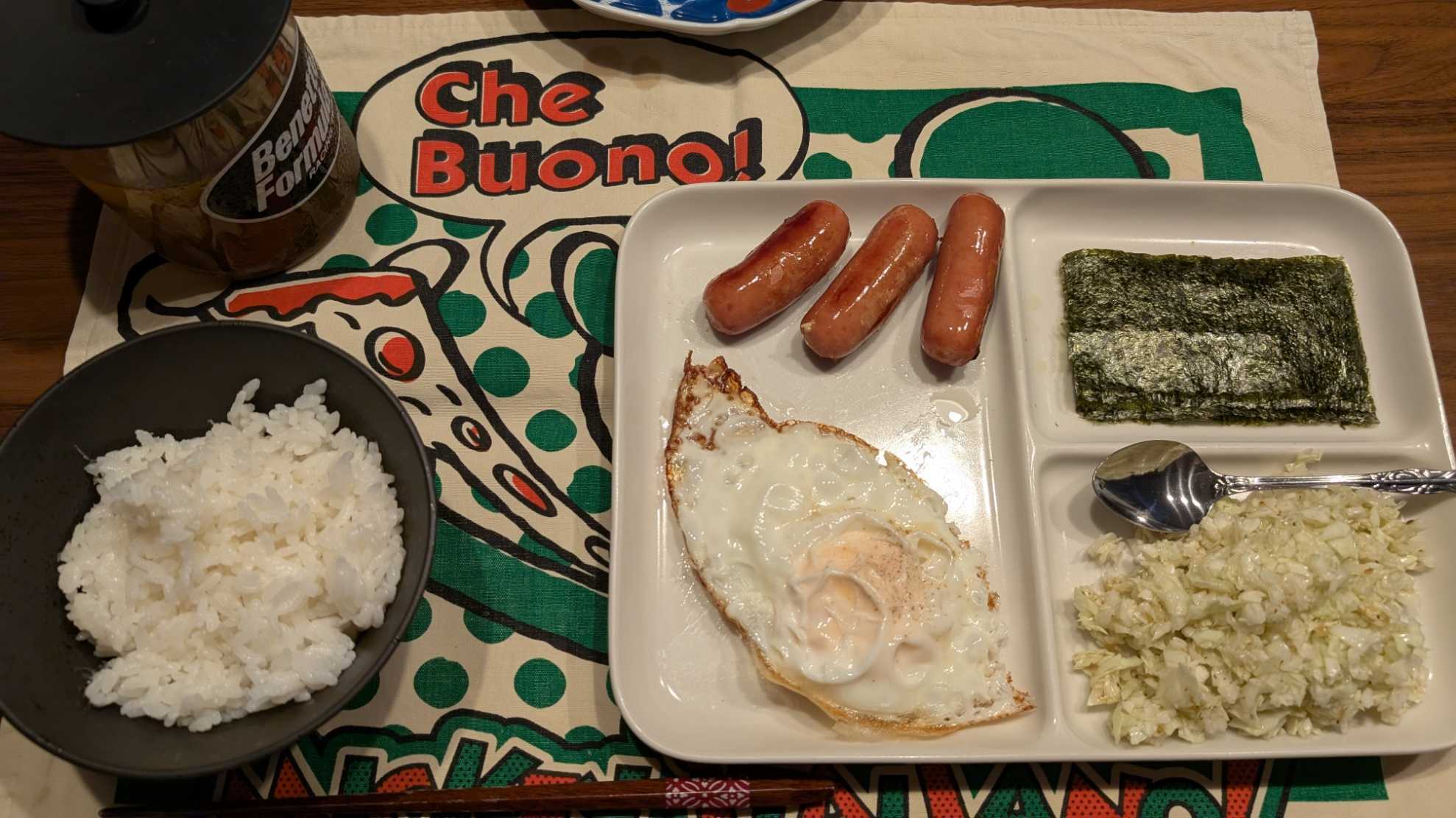 朝食→サラダ、ウィンナー3本、目玉焼き、焼きのり、ご飯、ハト麦茶朝食後→アイスコーヒー昼食→サラダ、マーマレードジャムヨーグルト、ツナチーズトースト、牛乳夕食→サラダ、茄子味噌、キハダマグロの刺身、ご飯、茄子の味噌汁、ハト麦茶