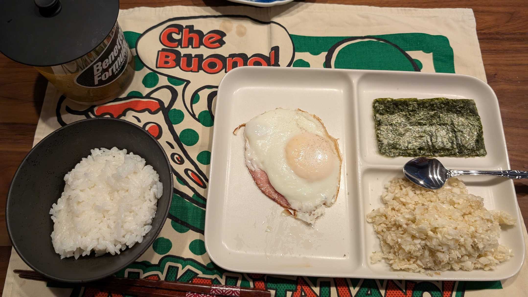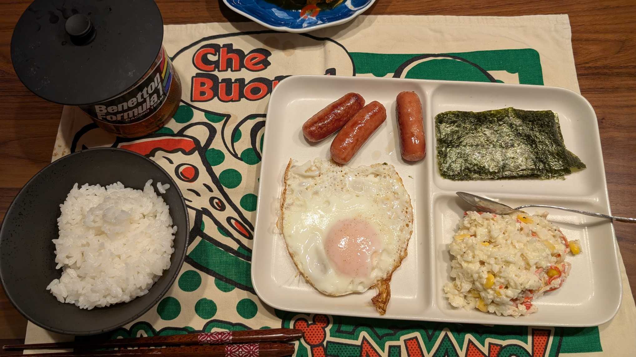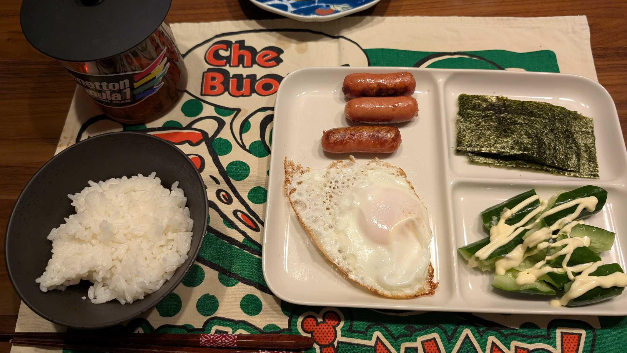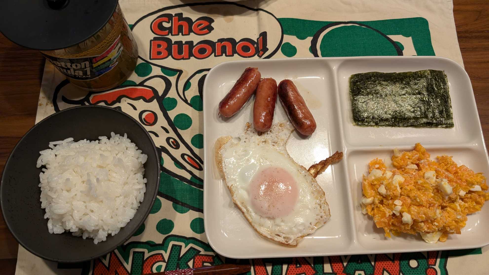 朝食→サラダ、ウィンナー3本、目玉焼き、焼きのり、ご飯、ハト麦茶朝食後→アイスコーヒー昼食→サラダ、マーマレードジャムヨーグルト、ツナチーズトースト、牛乳夕食→サラダ、茄子味噌、キハダマグロの刺身、ご飯、茄子の味噌汁、ハト麦茶