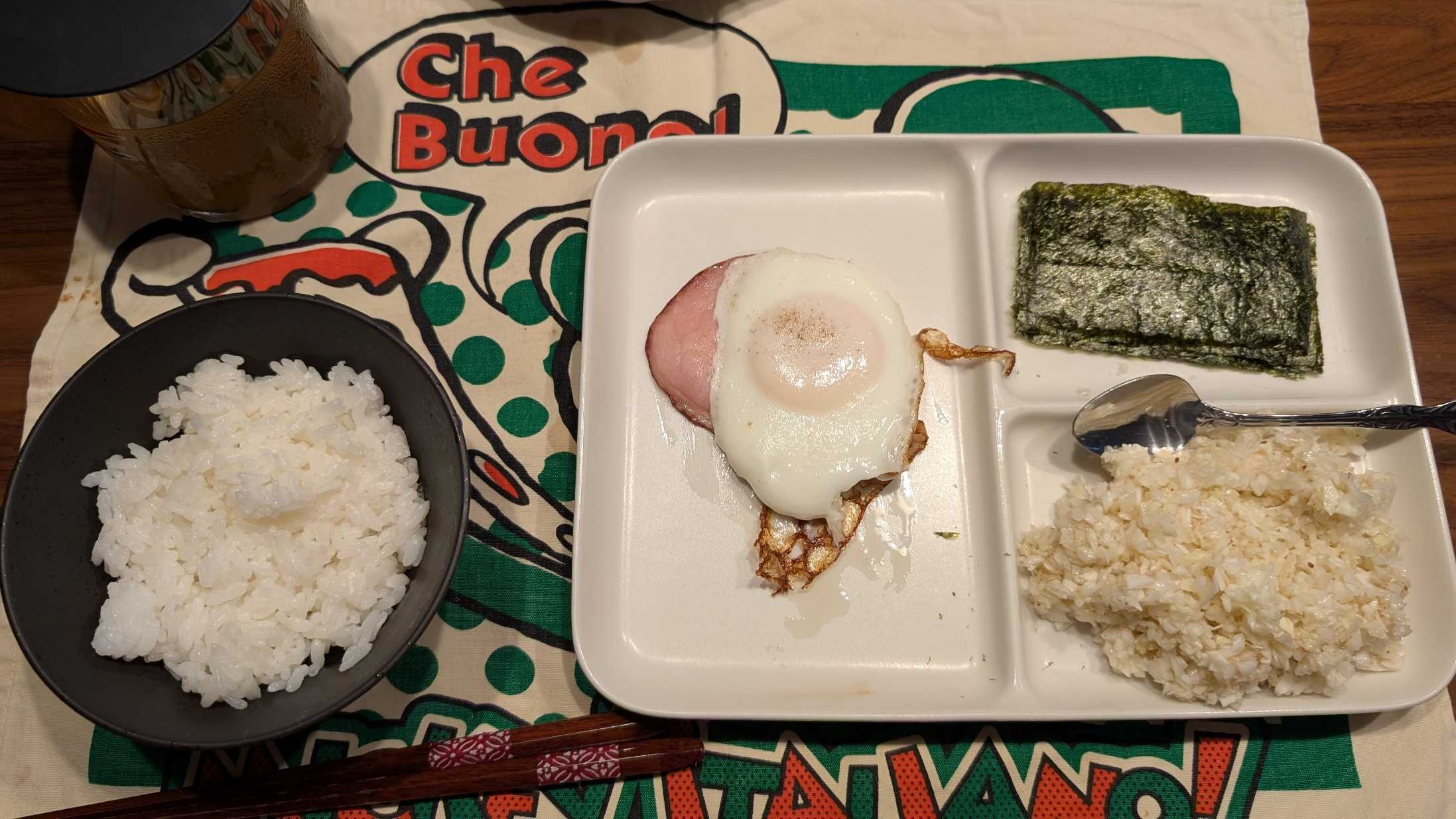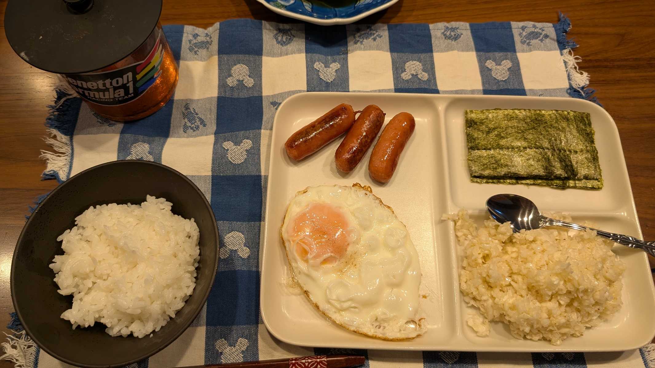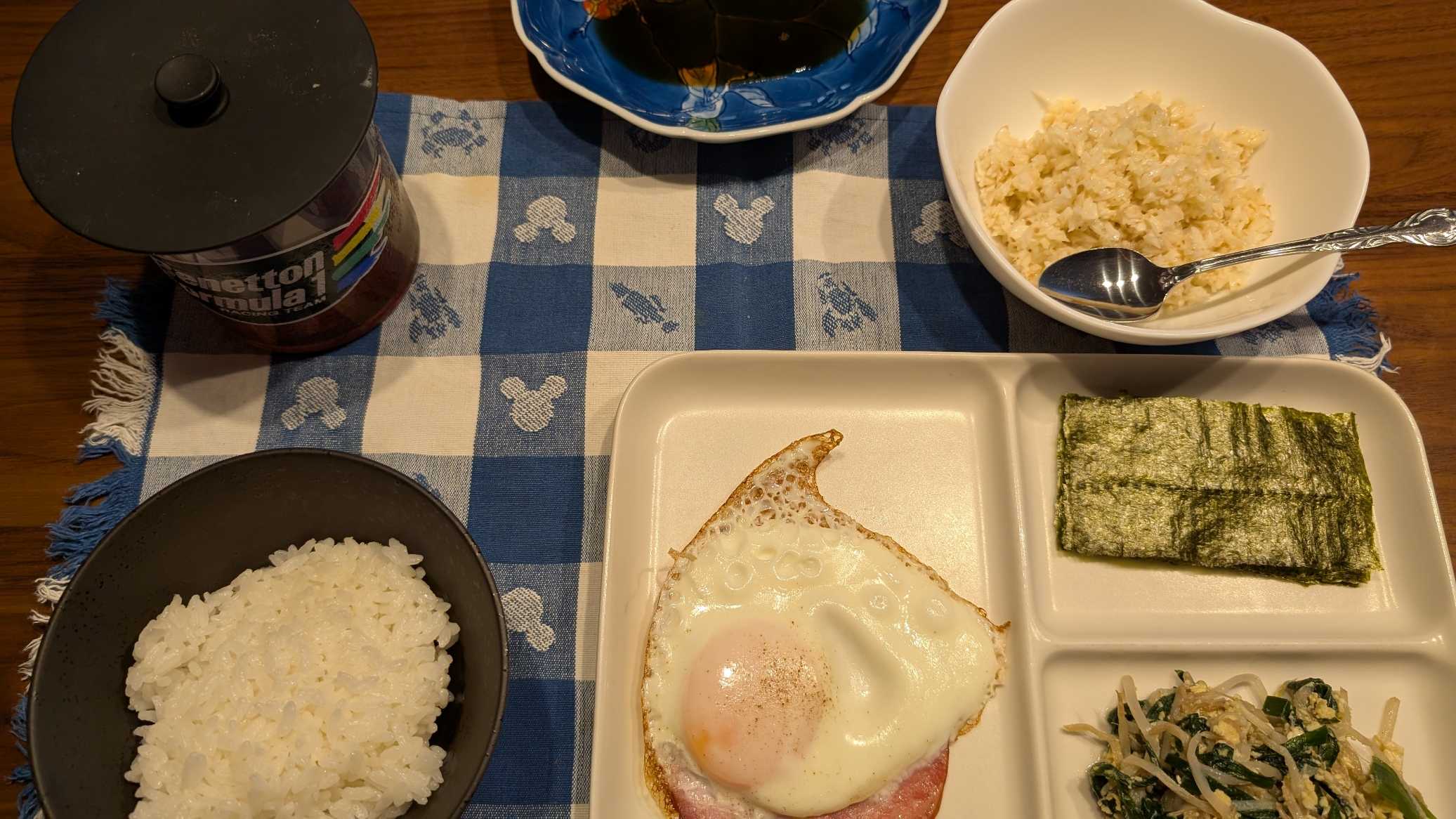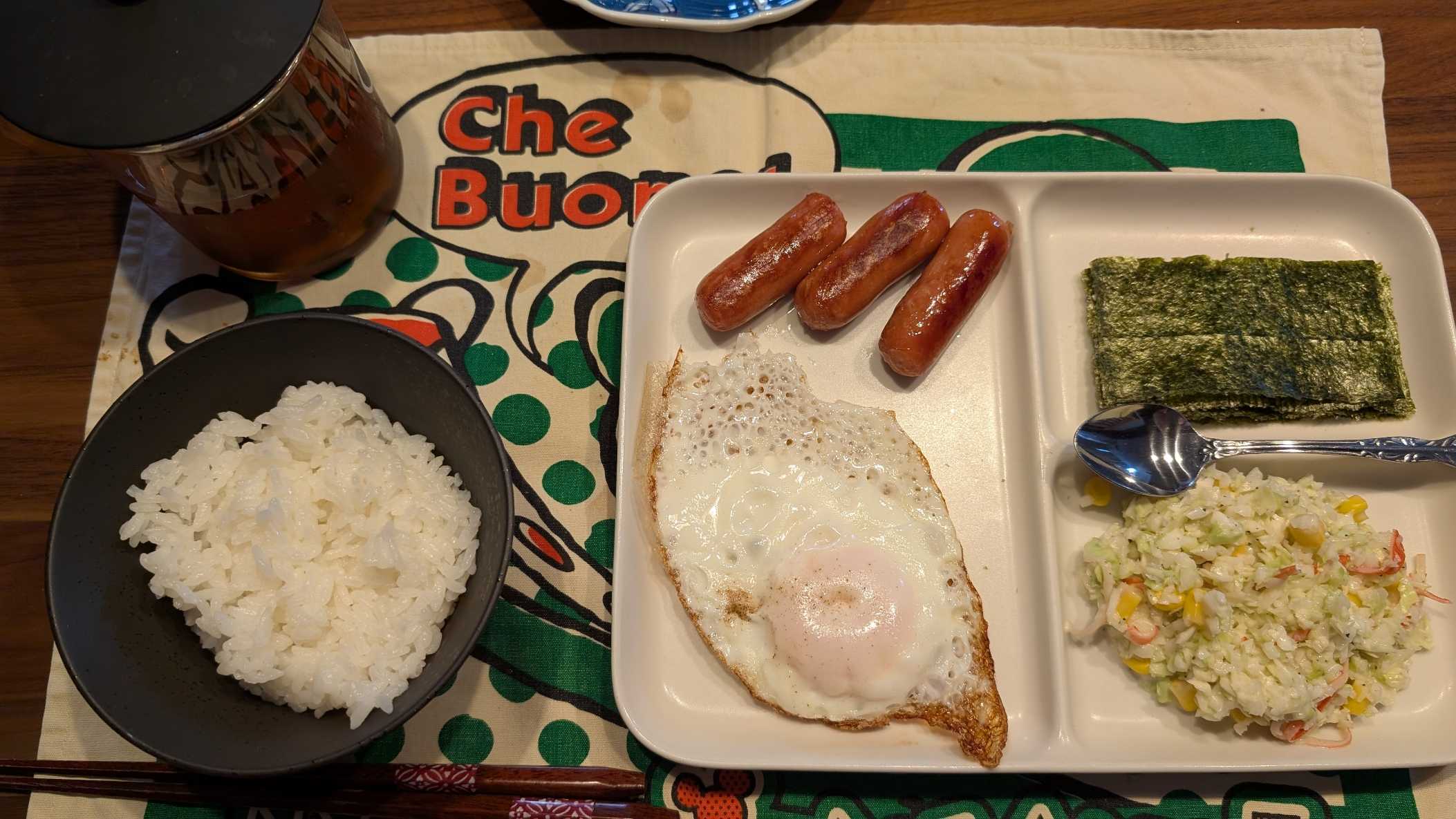 朝食→サラダ、ウィンナー3本、目玉焼き、焼きのり、ご飯、ハト麦茶朝食後→アイスコーヒー昼食→サラダ、桃ジャムヨーグルト、ツナチーズトースト、牛乳夕食→大根とツナの煮物、塩焼きそばの目玉焼き載せ、豆腐の味噌汁、ハト麦茶