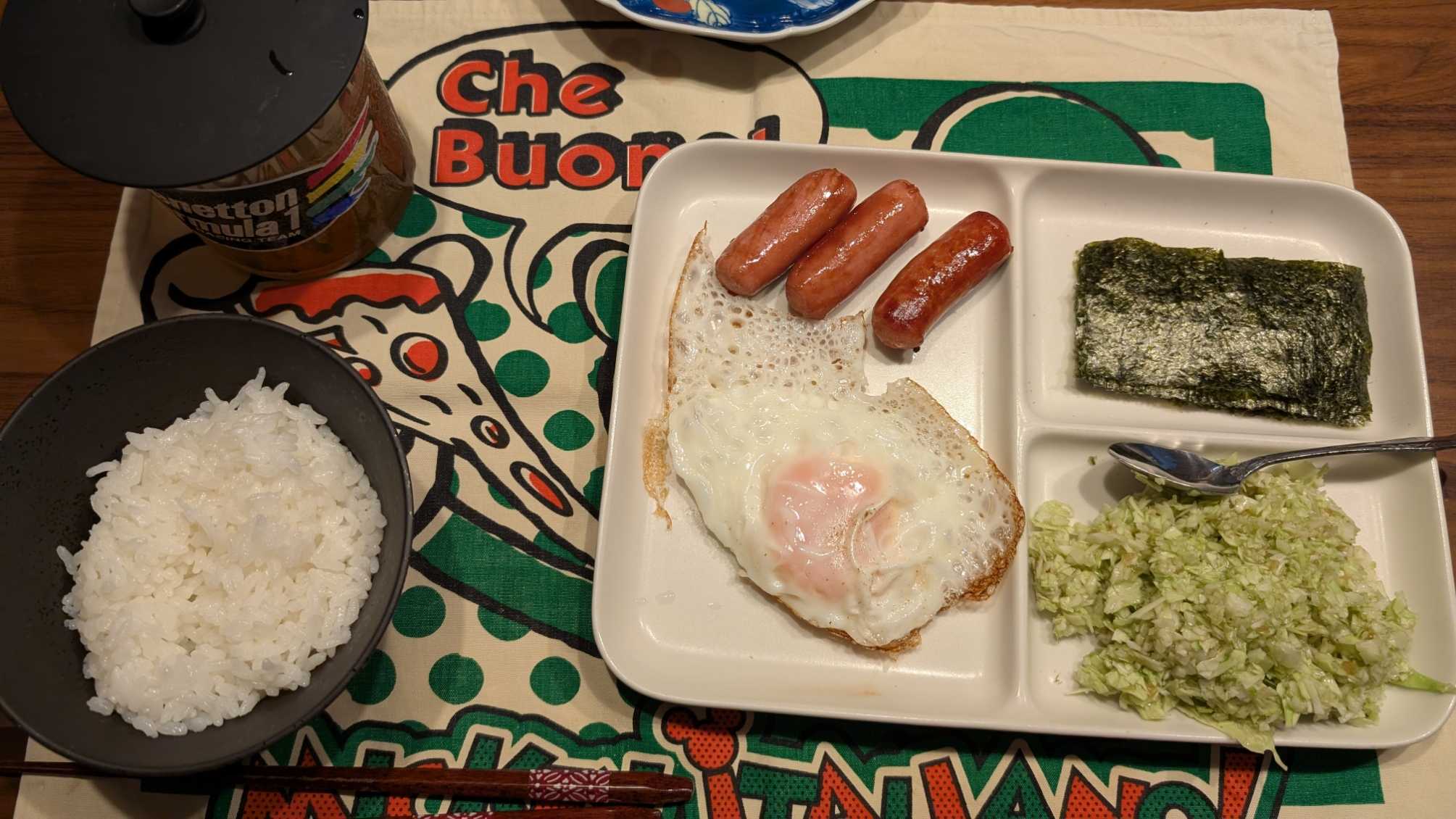 朝食→サラダ、ウィンナー3本、目玉焼き、焼きのり、ご飯、ハト麦茶朝食後→アイスコーヒー昼食→サラダ、桃ジャムヨーグルト、ファミマ・ちぎれるブリオッシュパン、生コッペパン・オムナポリタン、牛乳夕食→サラダ、ニラともやしの炒め物、横浜大宝餃子の餃子、ご飯、エノキダケの中華スープ、ハト麦茶