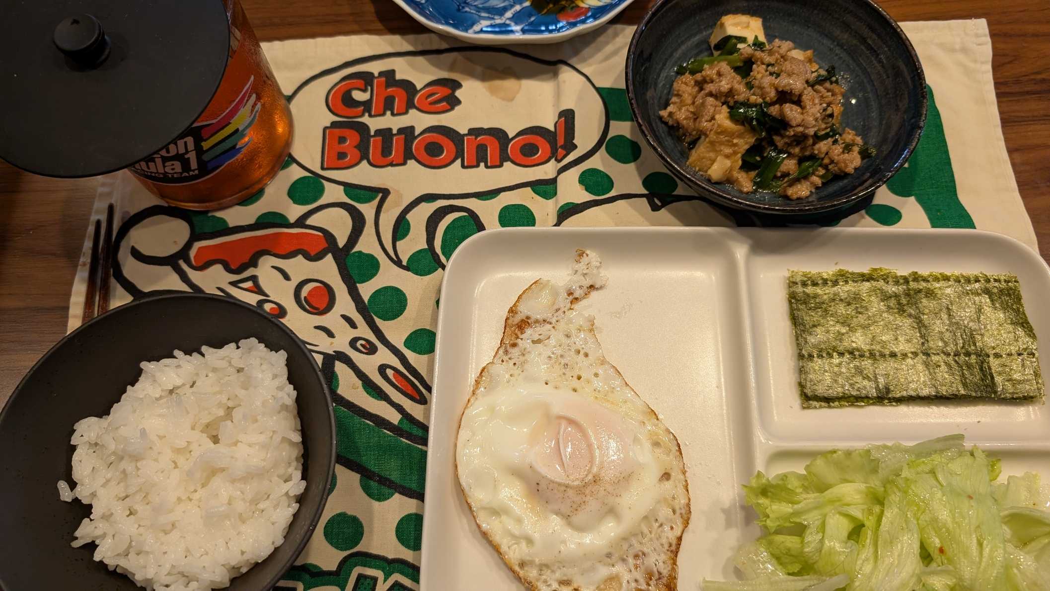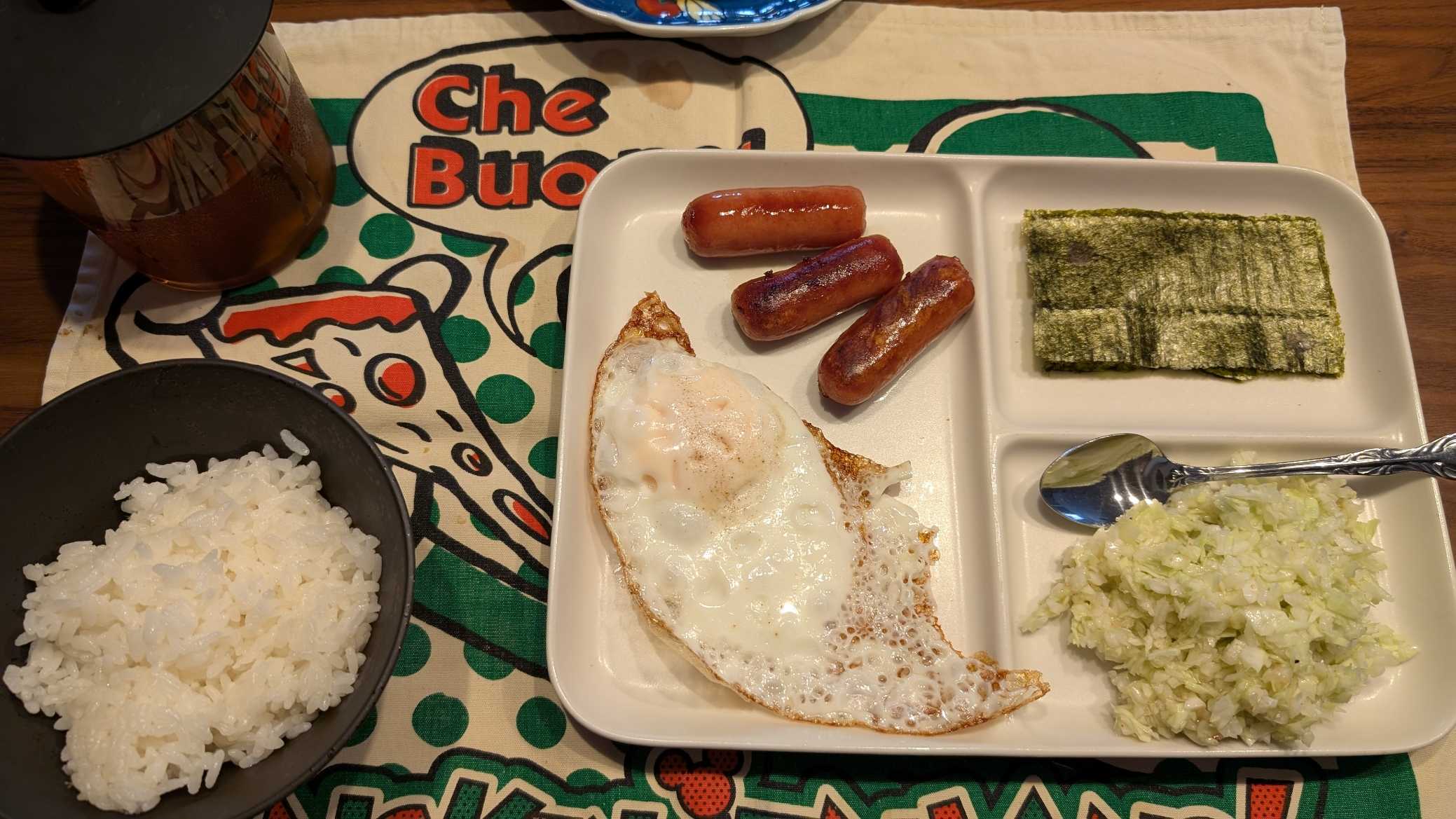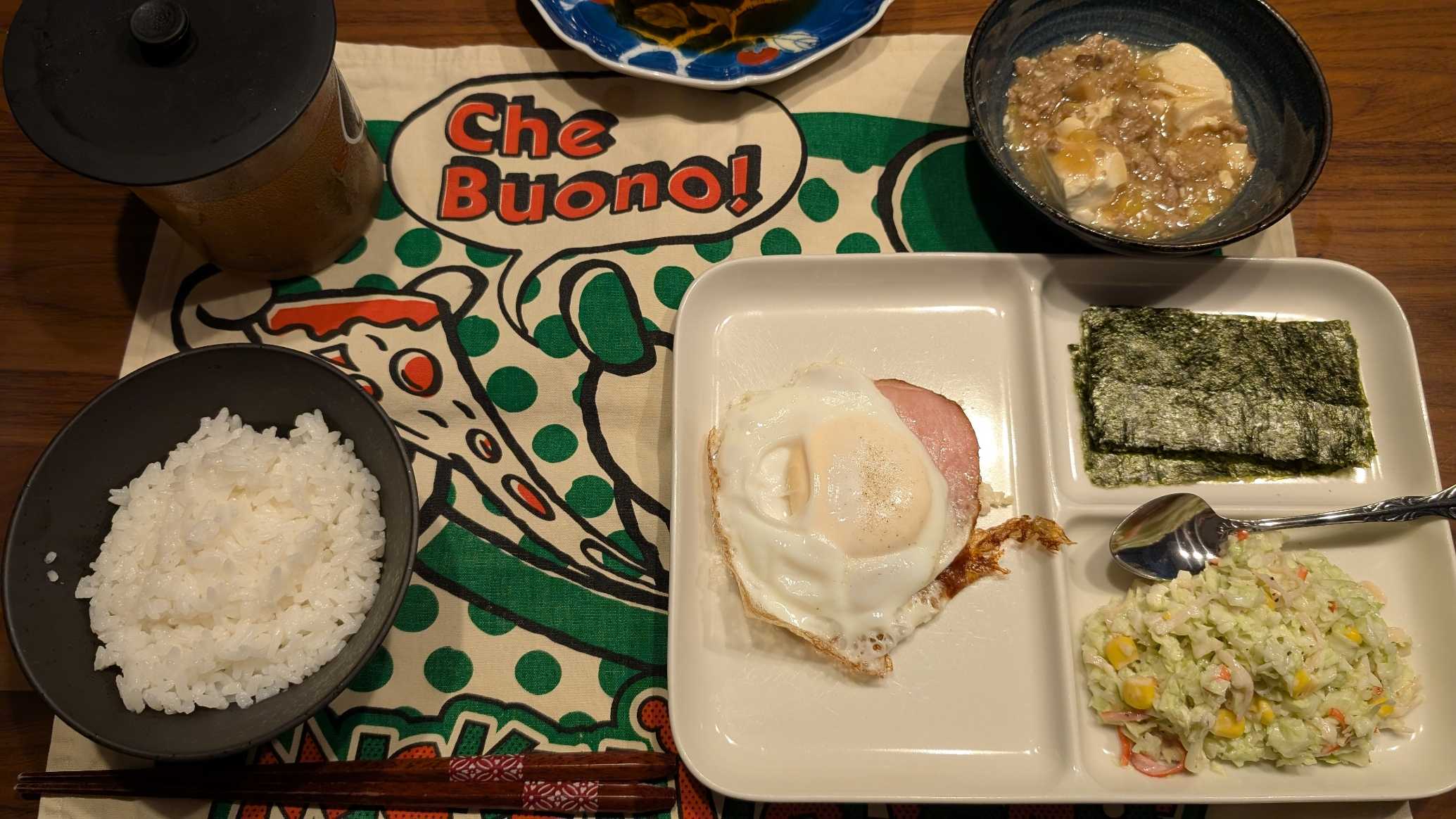 昼食前→アイスコーヒー昼食→サラダ、ウィンナー3本、目玉焼き、焼きのり、ご飯、ハト麦茶夕食→コールスローサラダ、人参しりしり、麻婆豆腐、ご飯、なめこの味噌汁、ハト麦茶