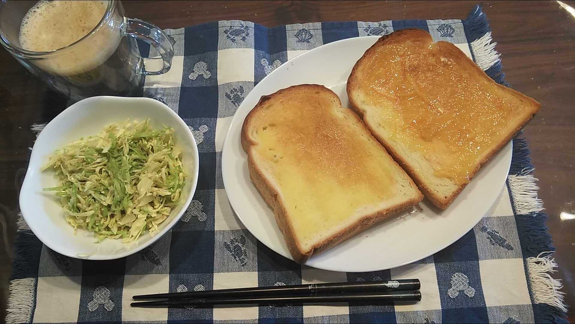昼食→サラダ、マーガリン&ハチミツトースト・マーマレードジャムトースト、カフェオレ