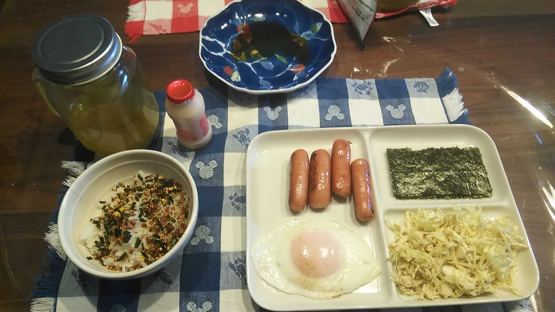 朝食→乳酸菌飲料、サラダ、ウィンナー4本、目玉焼き、海苔、ふりかけご飯、お茶