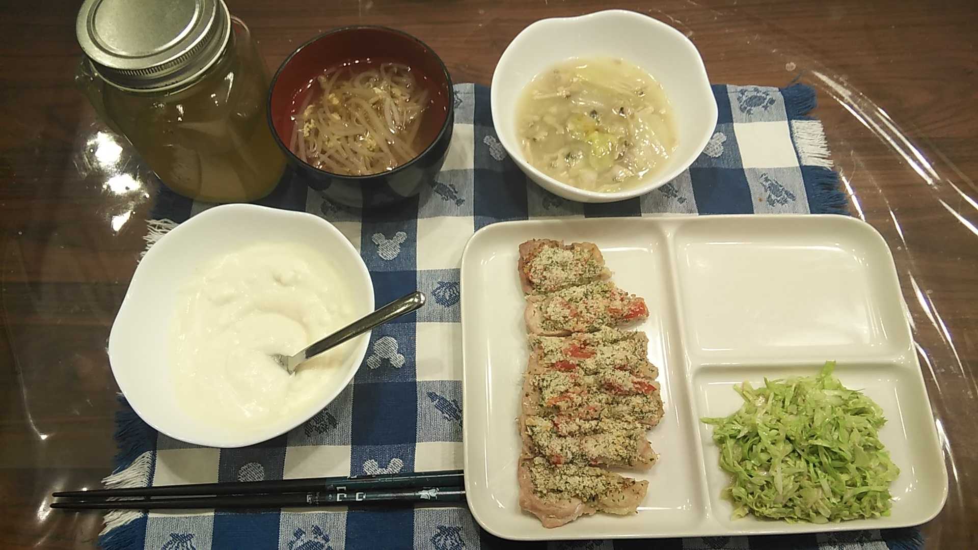 夕食→サラダ、豚肉のパン粉焼き、あさりと白菜のスープ煮、もやしと卵のスープ、おからパウダー入りヨーグルト、お茶