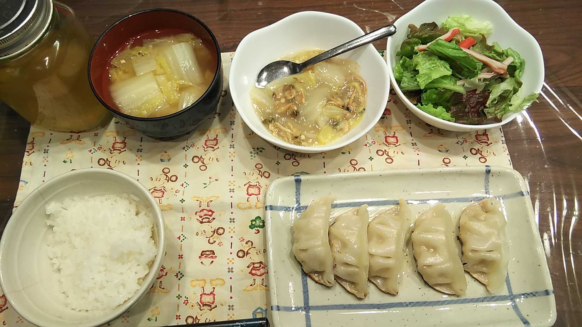 夕食→サラダ、白菜とあさりのスープ煮、餃子、白菜の味噌汁、ご飯、お茶