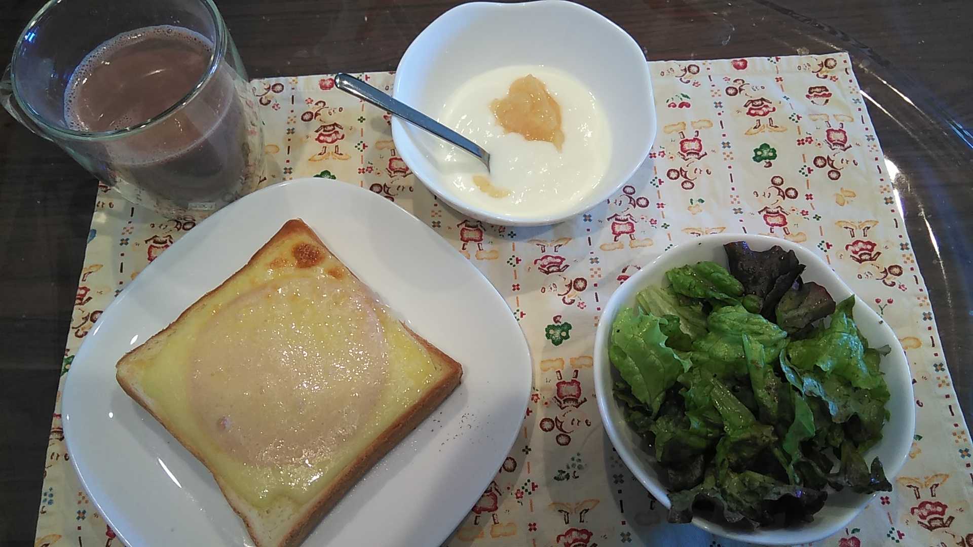 昼食→サラダ、桃ジャムヨーグルト、チーズハムトースト、豆乳ココア