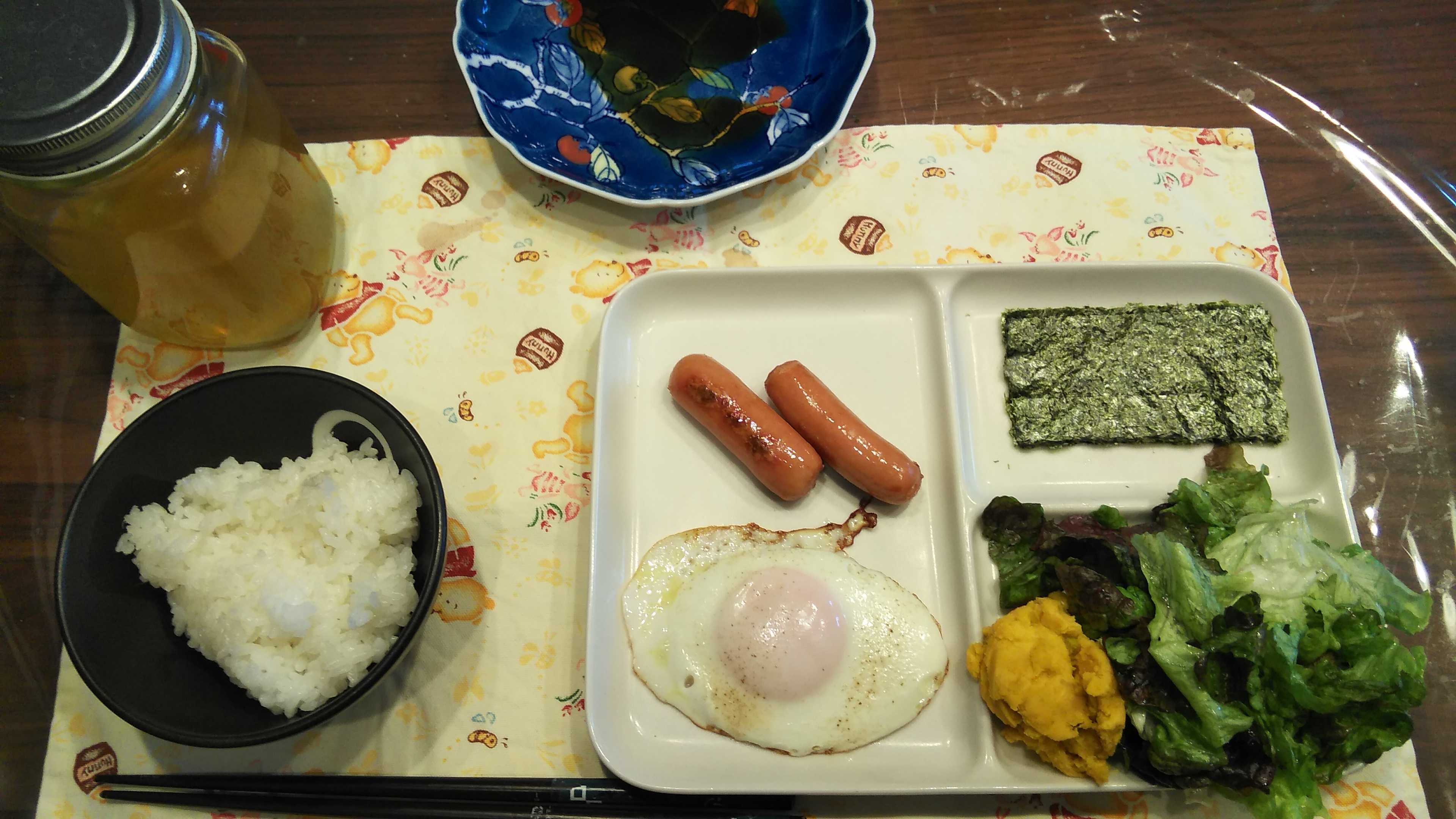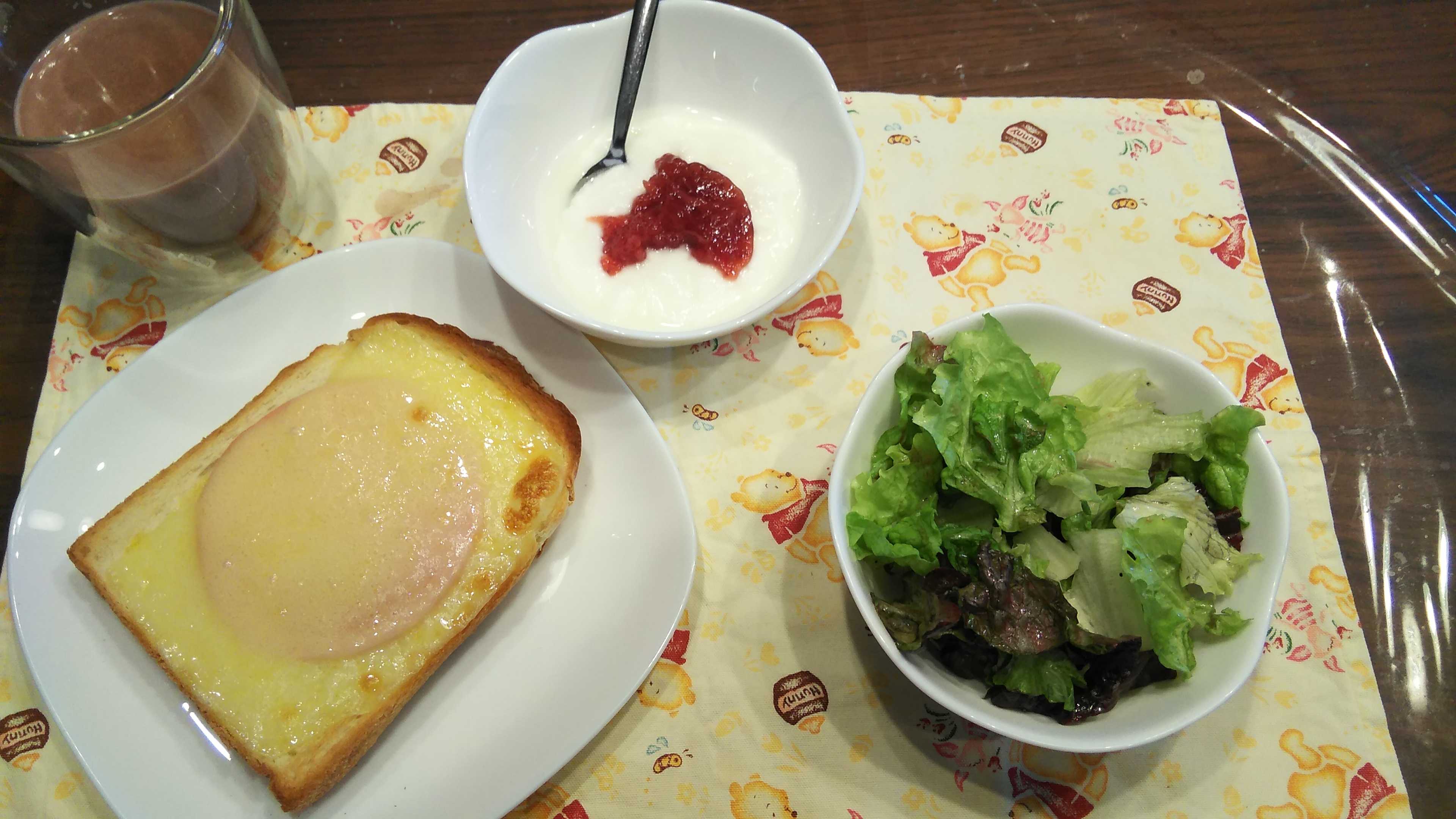 昼食→サラダ、イチゴジャムヨーグルト、チーズハムトースト、豆乳ココア