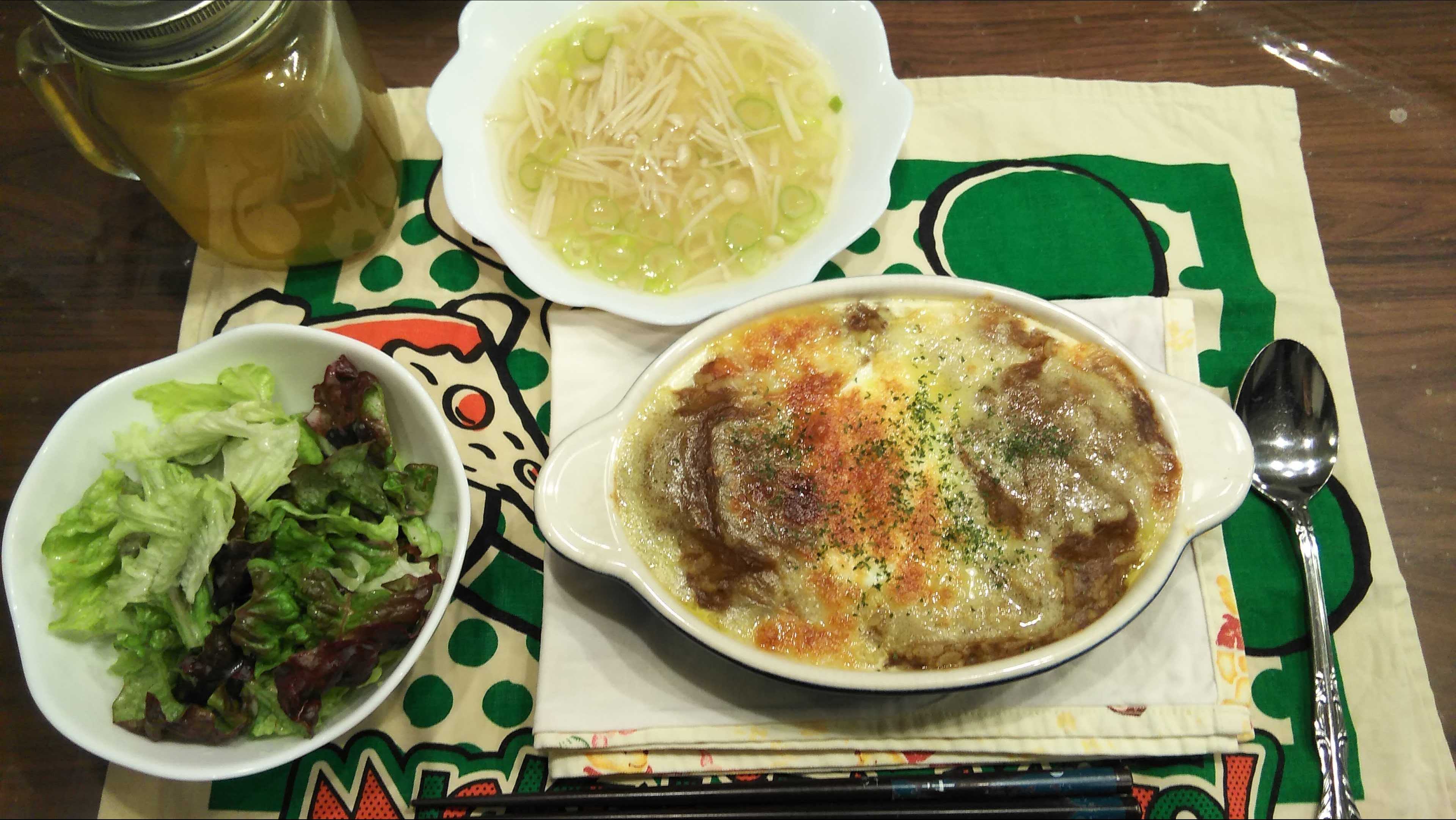 夕食→サラダ、カレードリア、えのきだけとネギの中華スープ、お茶