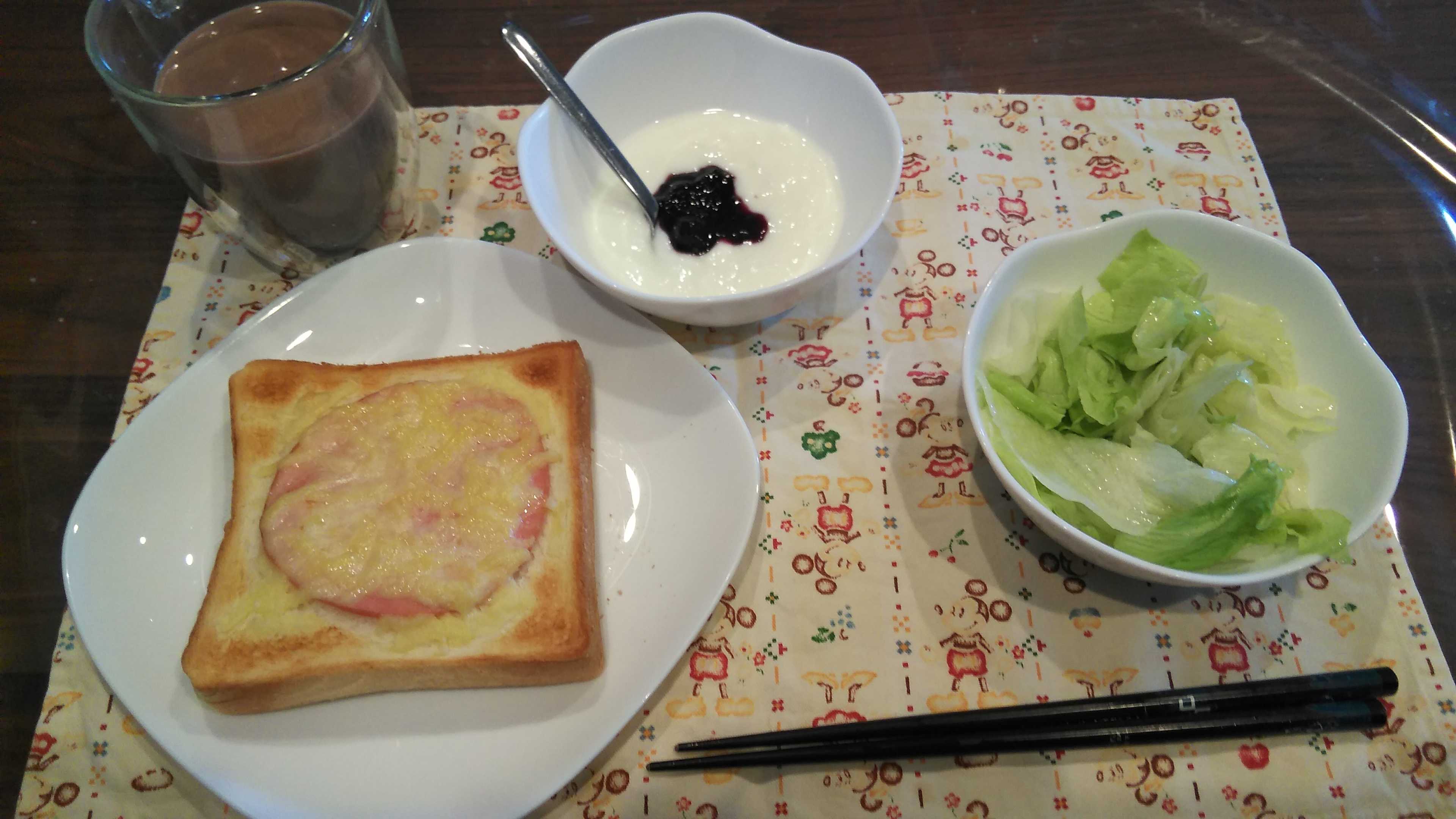 昼食→サラダ、ブルーベリージャムヨーグルト、ハムチーズトースト、豆乳ココア