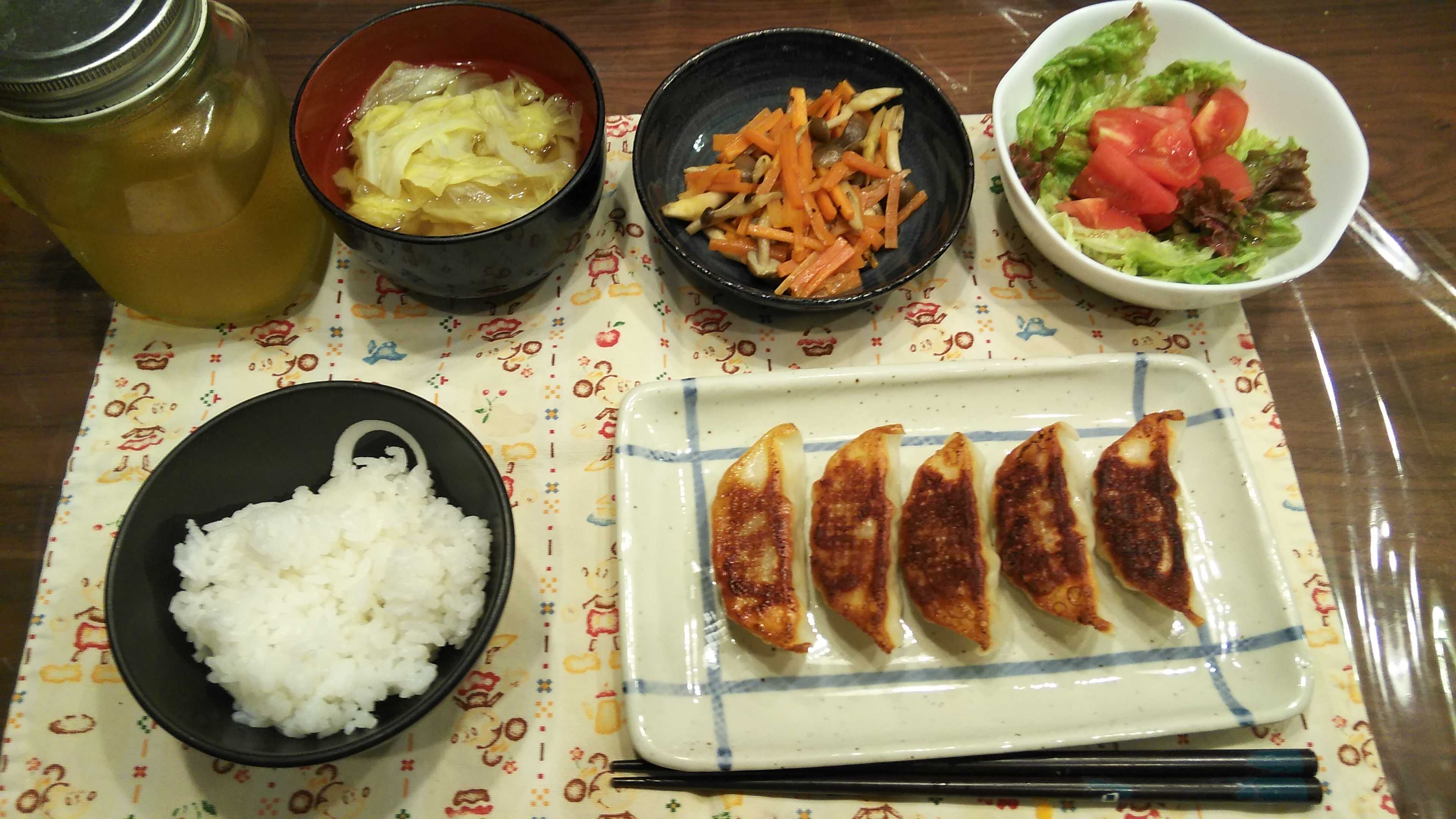 夕食→トマト、サラダ、人参としめじの無塩バター炒め、餃子、キャベツのコンソメスープ、ご飯、お茶