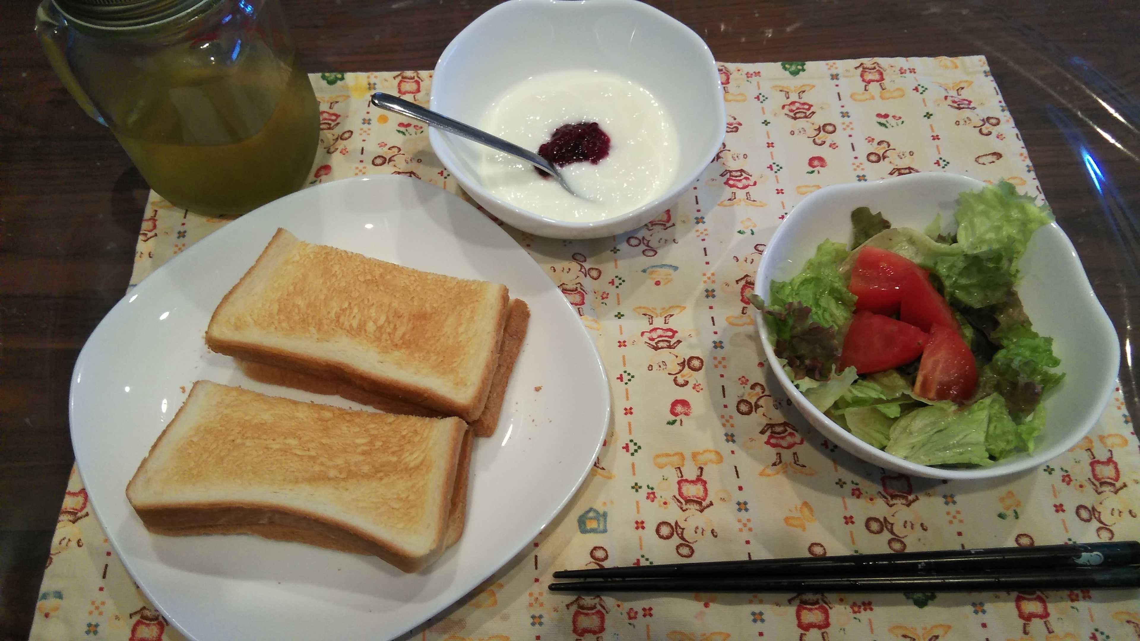 昼食→トマト、サラダ、クランベリージャムヨーグルト、ハムチーズサンド、お茶