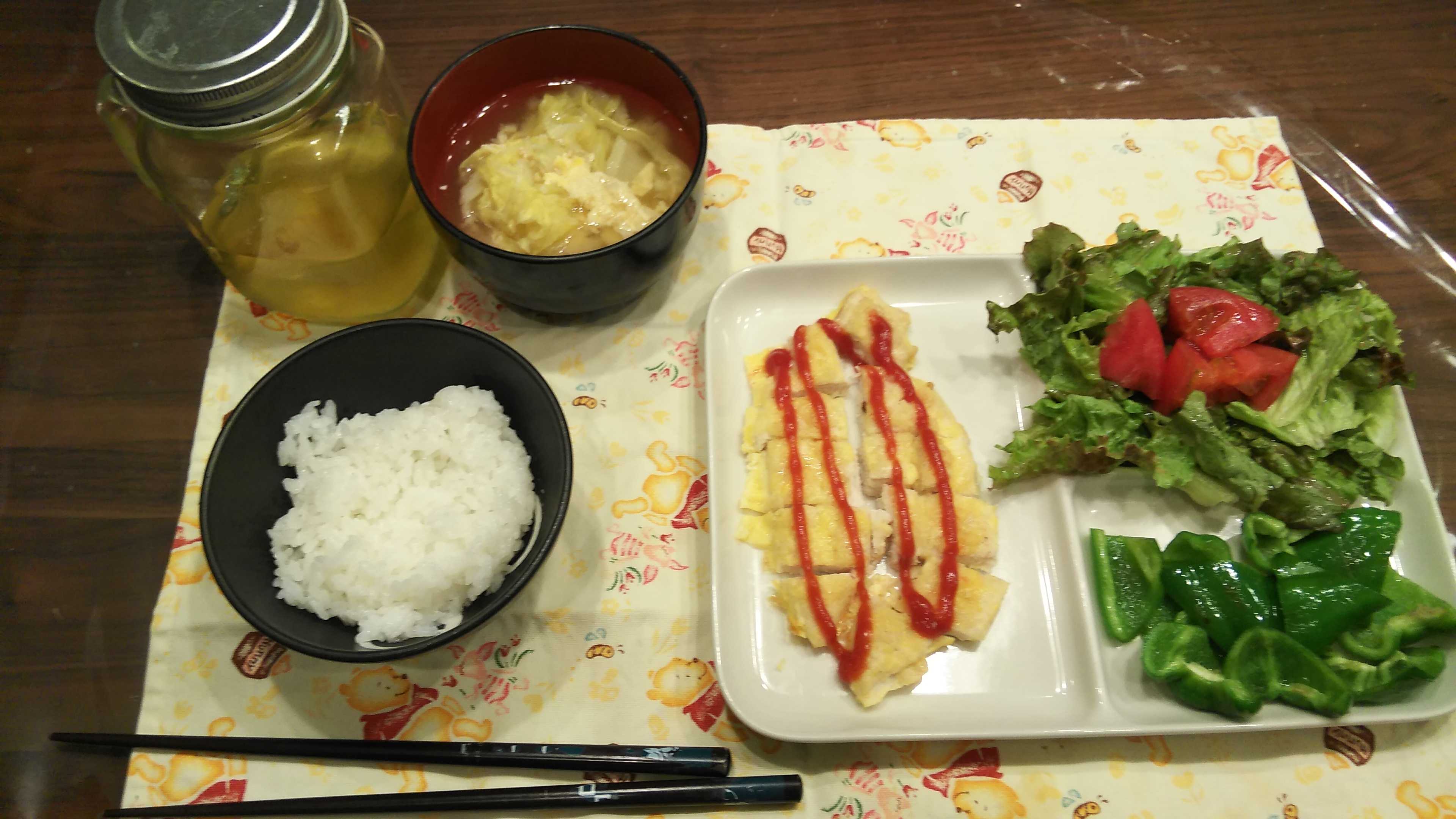 夕食→トマト、サラダ、ピーパン炒め、ささみのピカタ、キャベツと卵の味噌汁、ご飯、お茶
