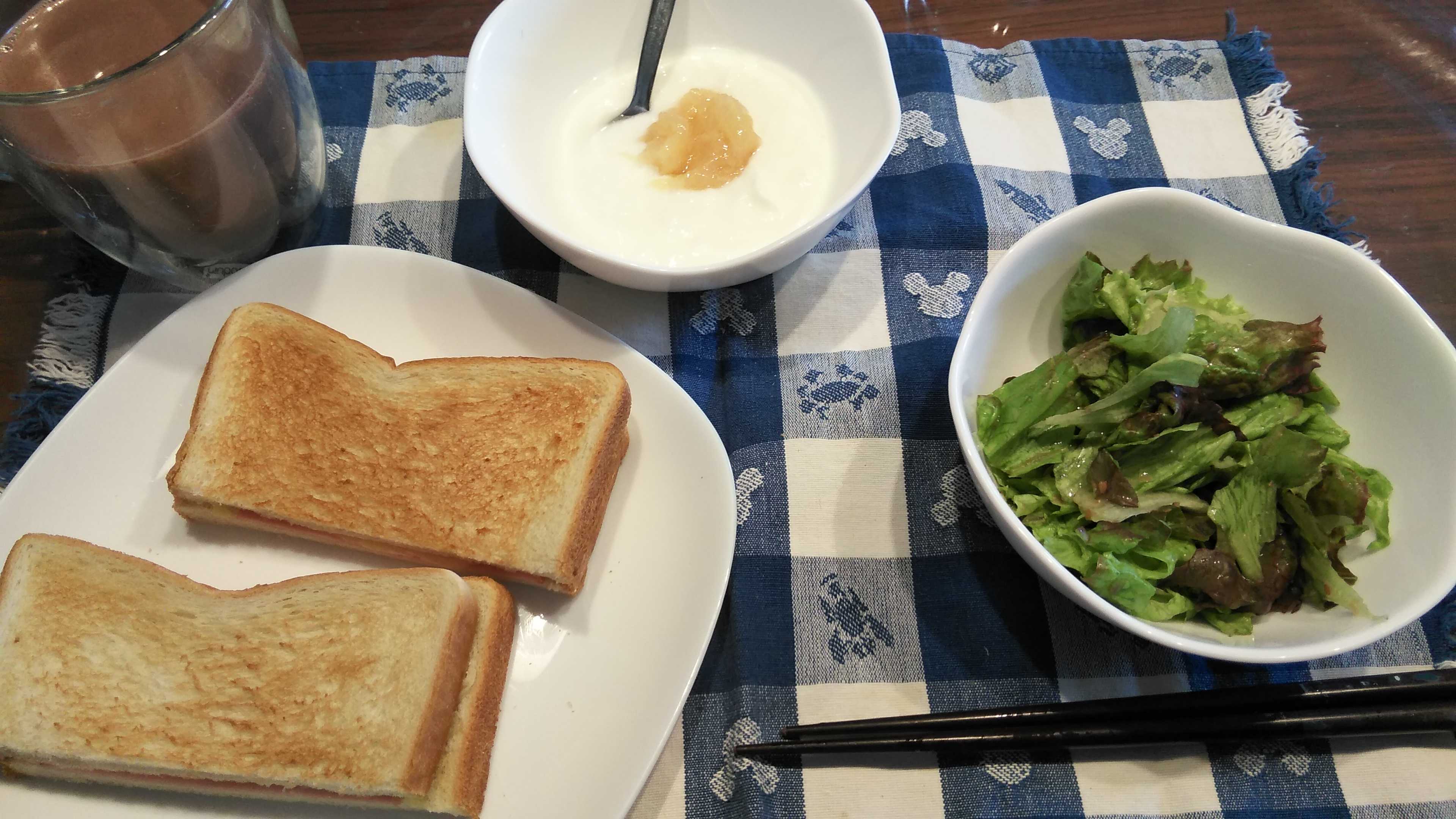 昼食→サラダ、桃ジャムヨーグルト、チーズハムサンド、豆乳ココア