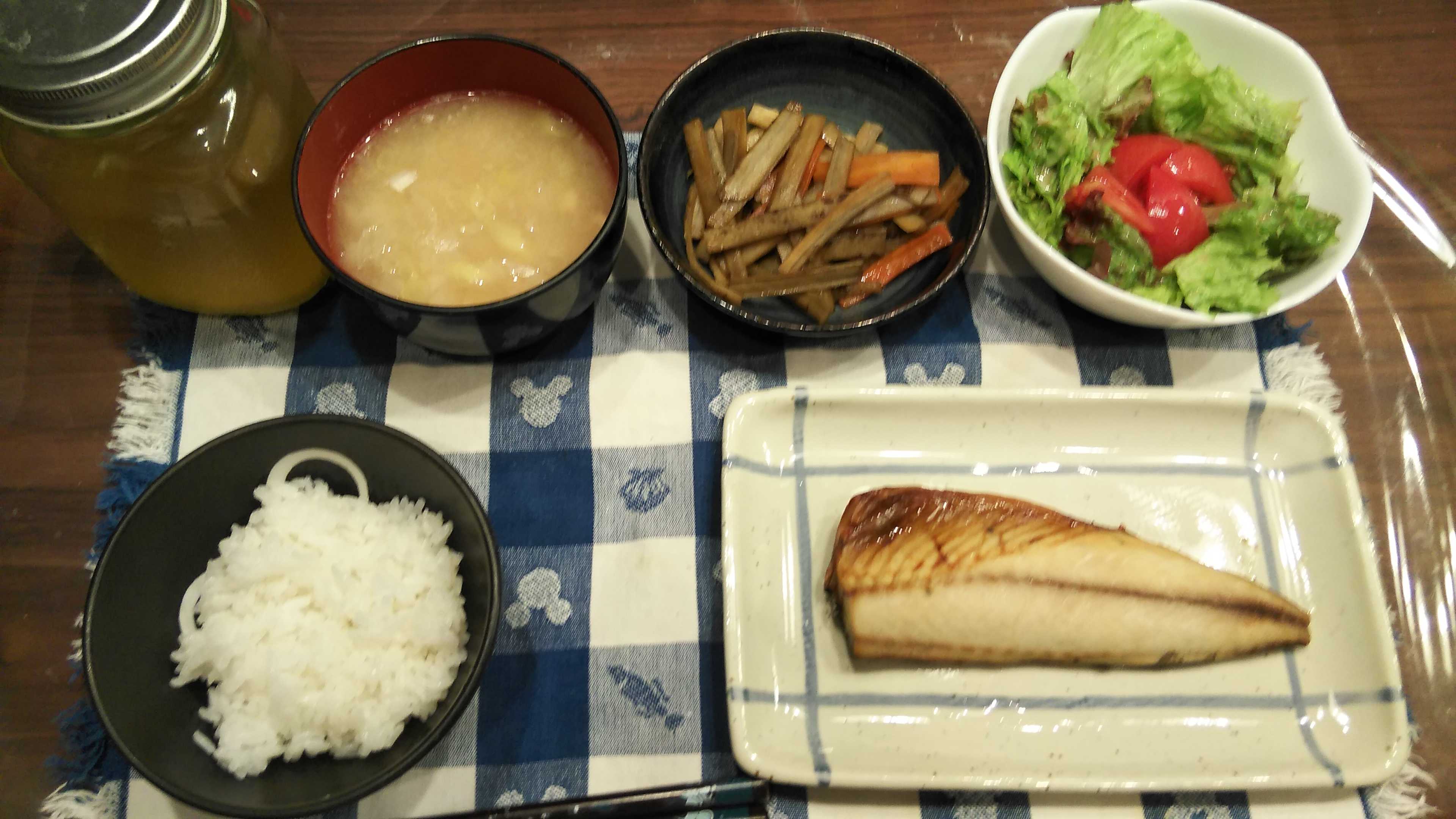 夕食→トマト、サラダ、ごぼうと人参のきんぴら、ご飯、納豆味噌汁、お茶