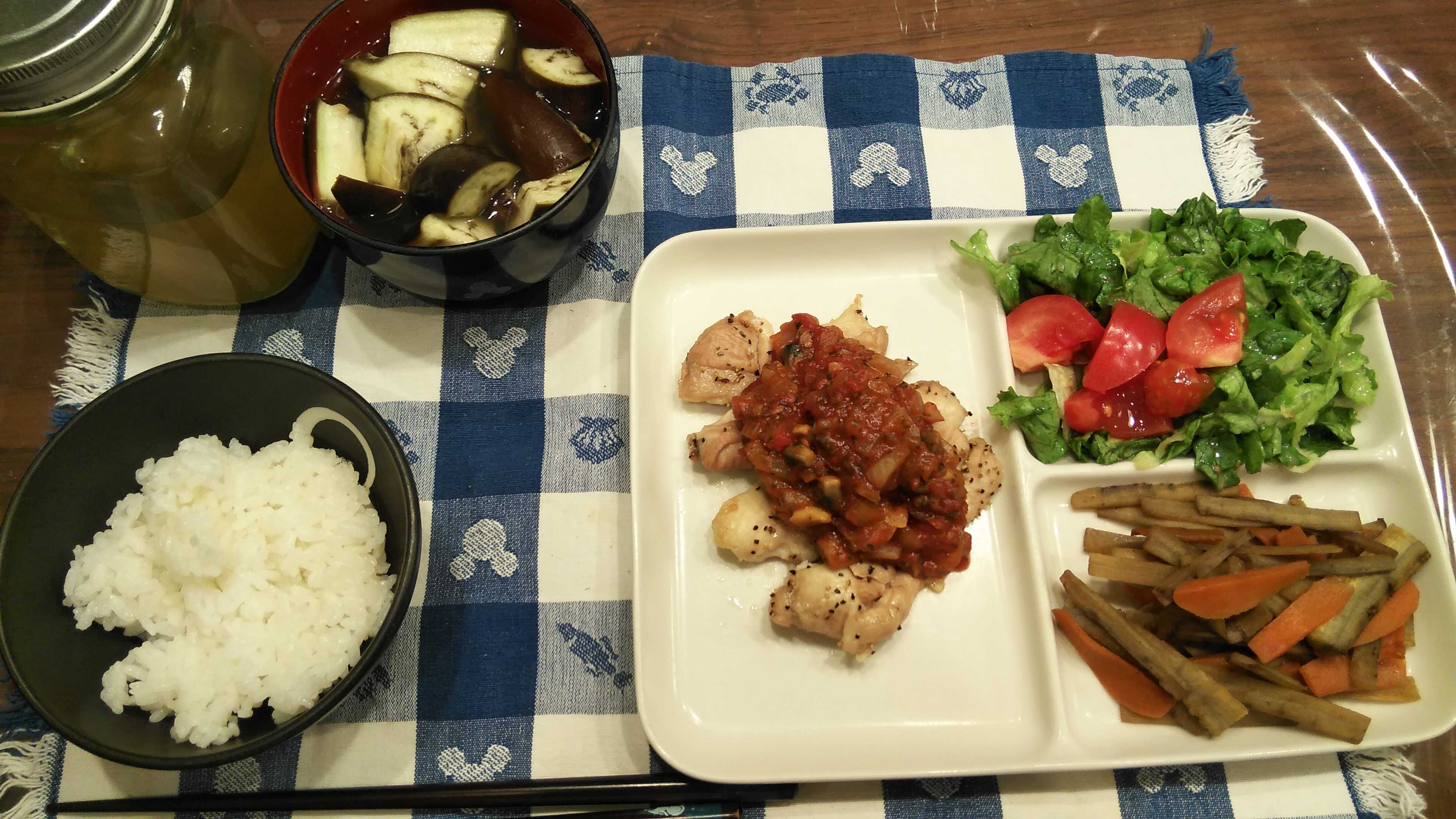 夕食→トマト、サラダ、ごぼうと人参のきんぴら、チキンのトマトソース、ご飯、茄子の味噌汁、お茶