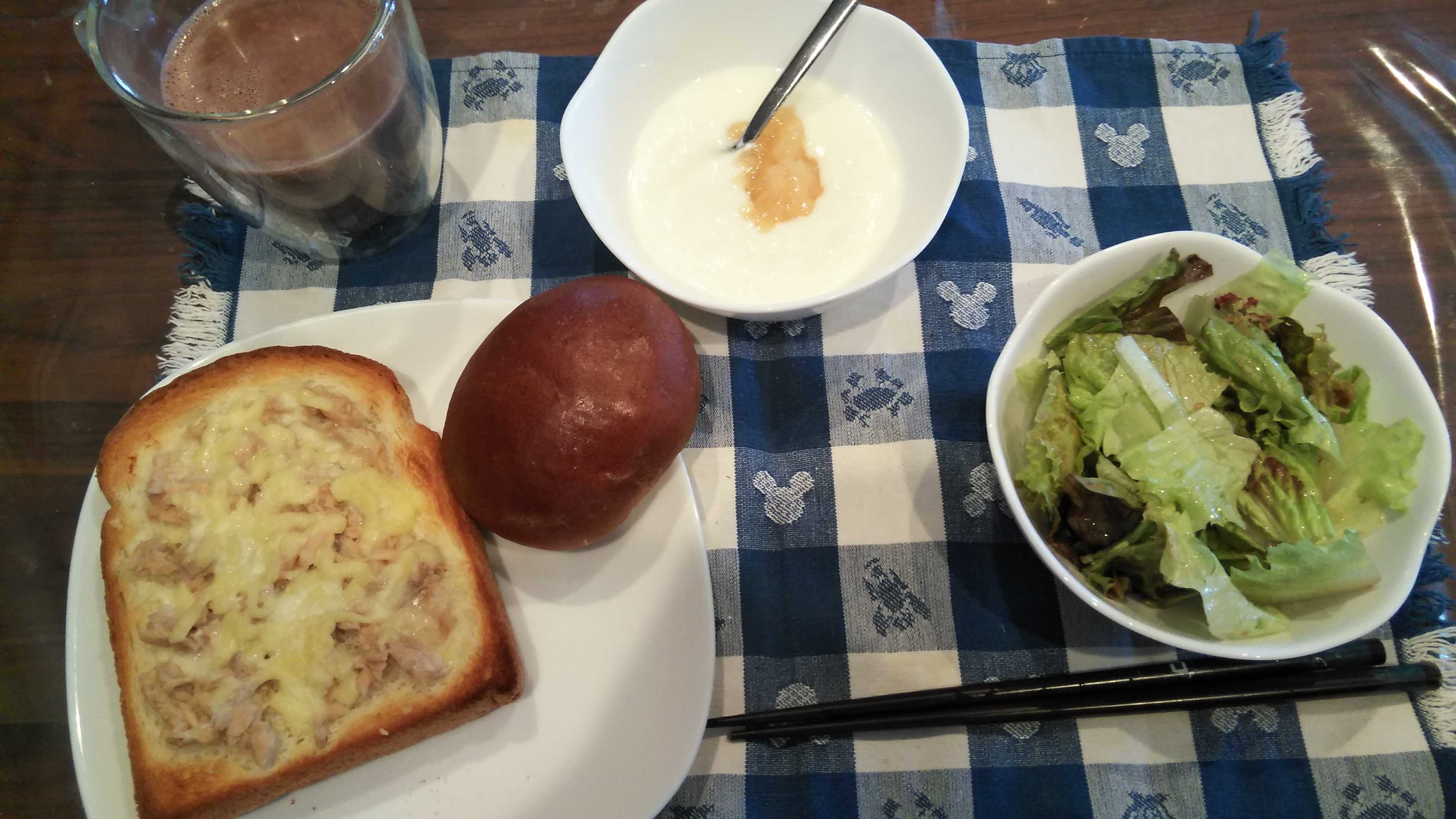昼食→サラダ、桃ジャムヨーグルト、ツナチーズトースト、黒糖ロール、豆乳ココア