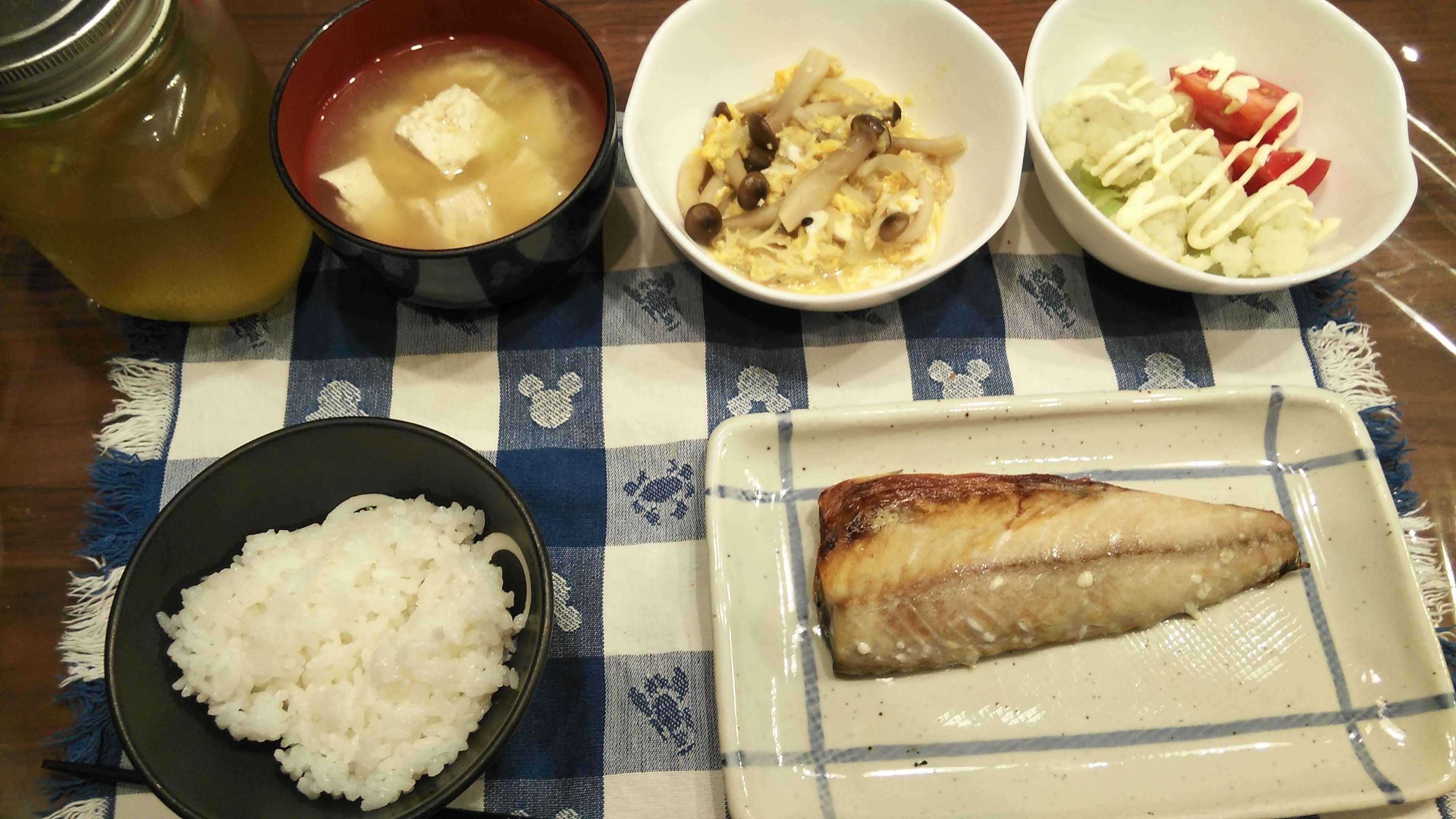 夕食→トマト、カリフラワー、塩サバ、きのこの卵とじ、ご飯、豆腐の味噌汁、お茶