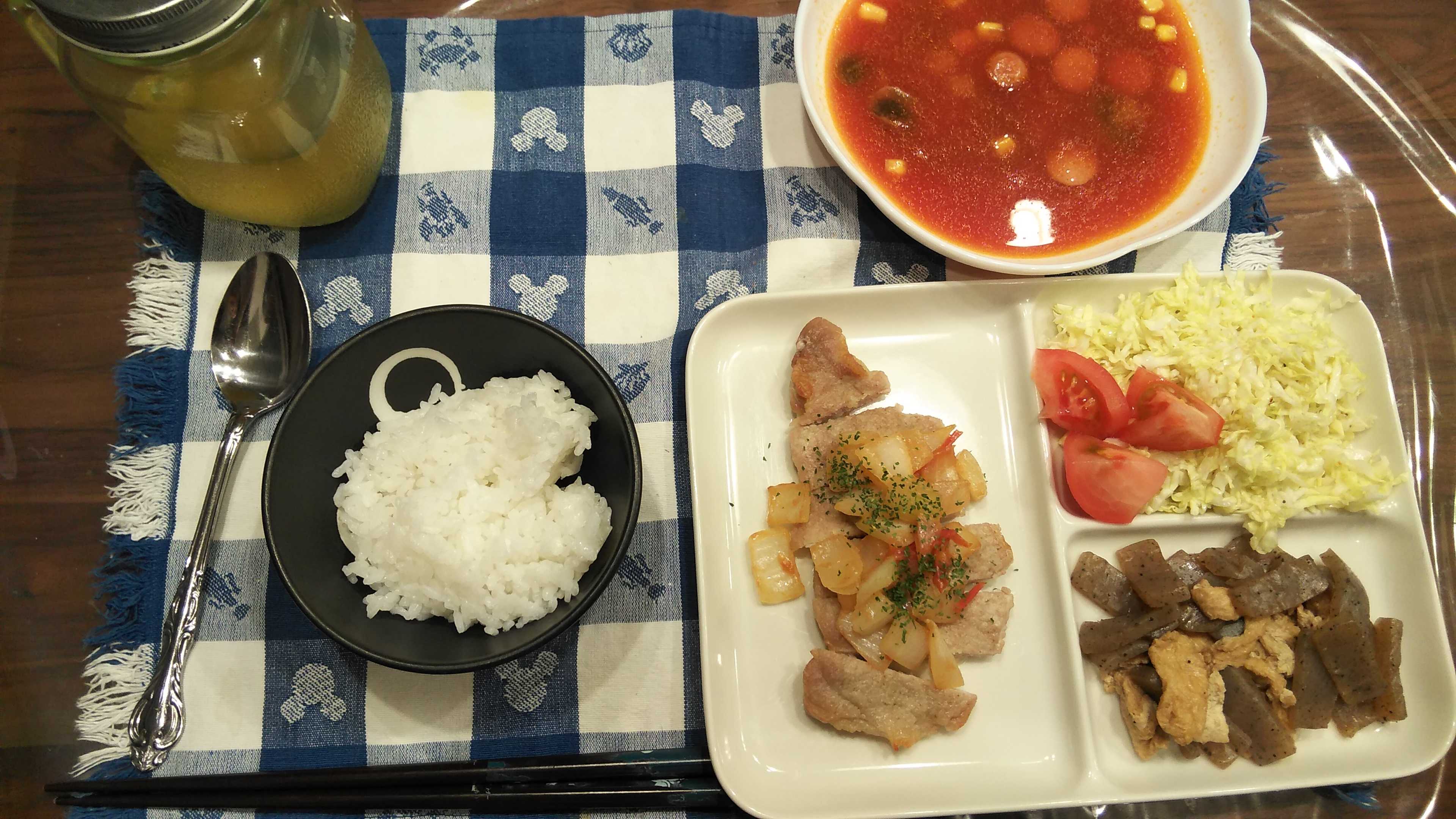 夕食→トマト、サラダ、こんにゃくと油揚げの煮物、豚肉のビネガー風味、ミネストローネ風、ご飯、お茶