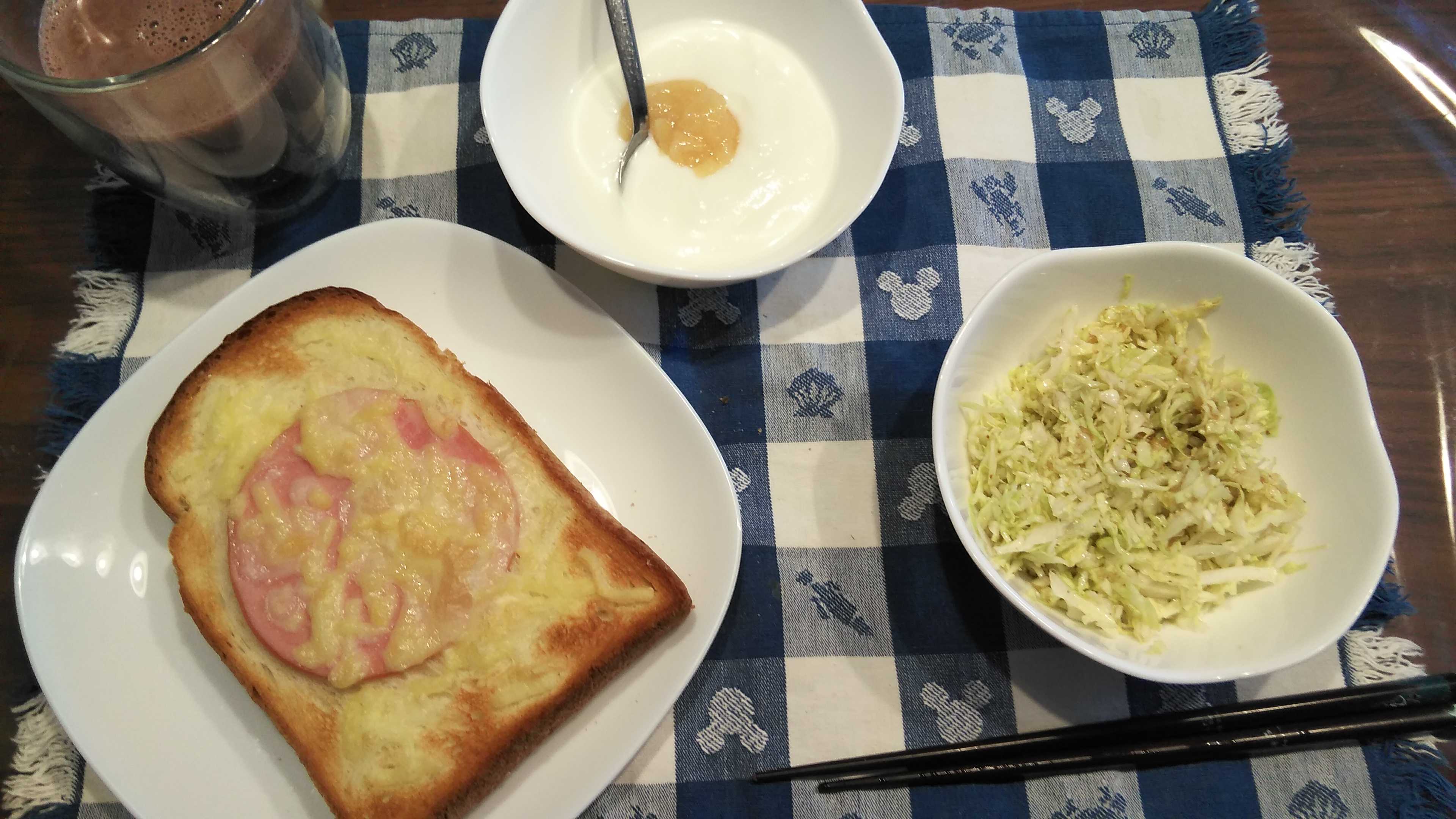 昼食→サラダ、桃ジャムヨーグルト、チーズハムトースト、豆乳ココア