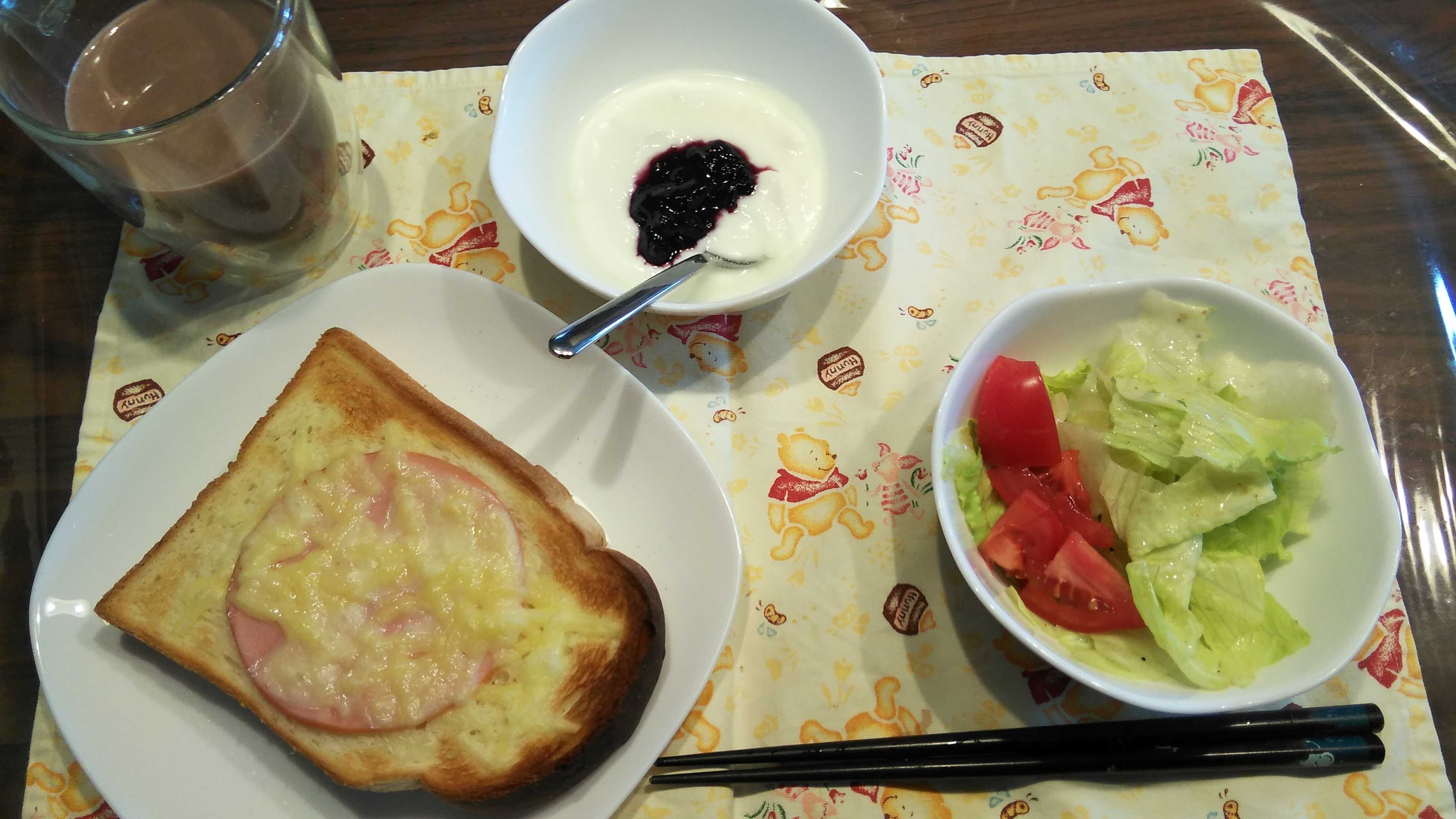 昼食→トマト、サラダ、ブルーベリージャムヨーグルト、チーズハムトースト、豆乳ココア