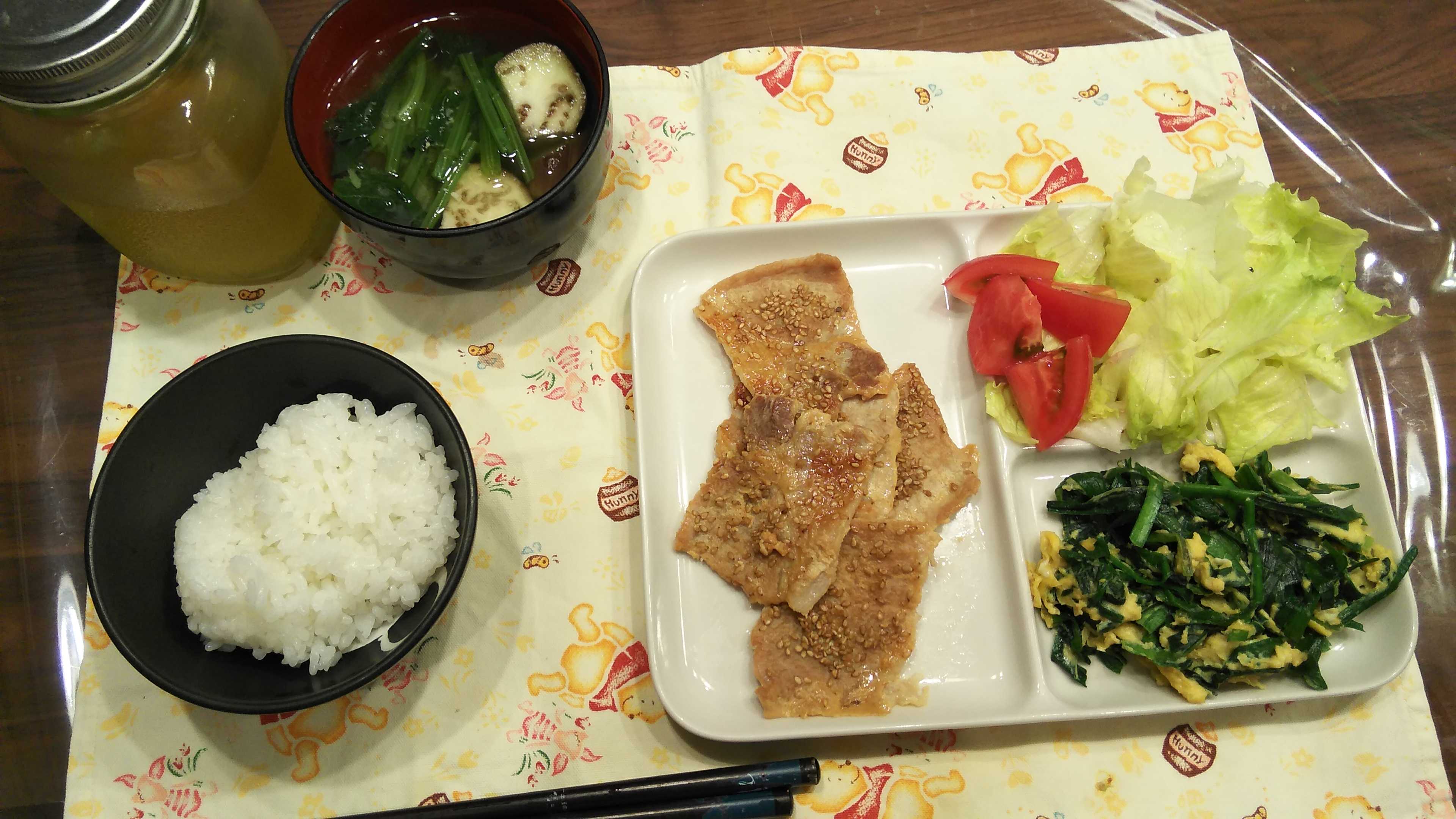 夕食→トマト、サラダ、ニラと卵の炒め物、豚肉の胡麻ゴマ焼き、茄子とほうれん草の味噌汁、ご飯、お茶