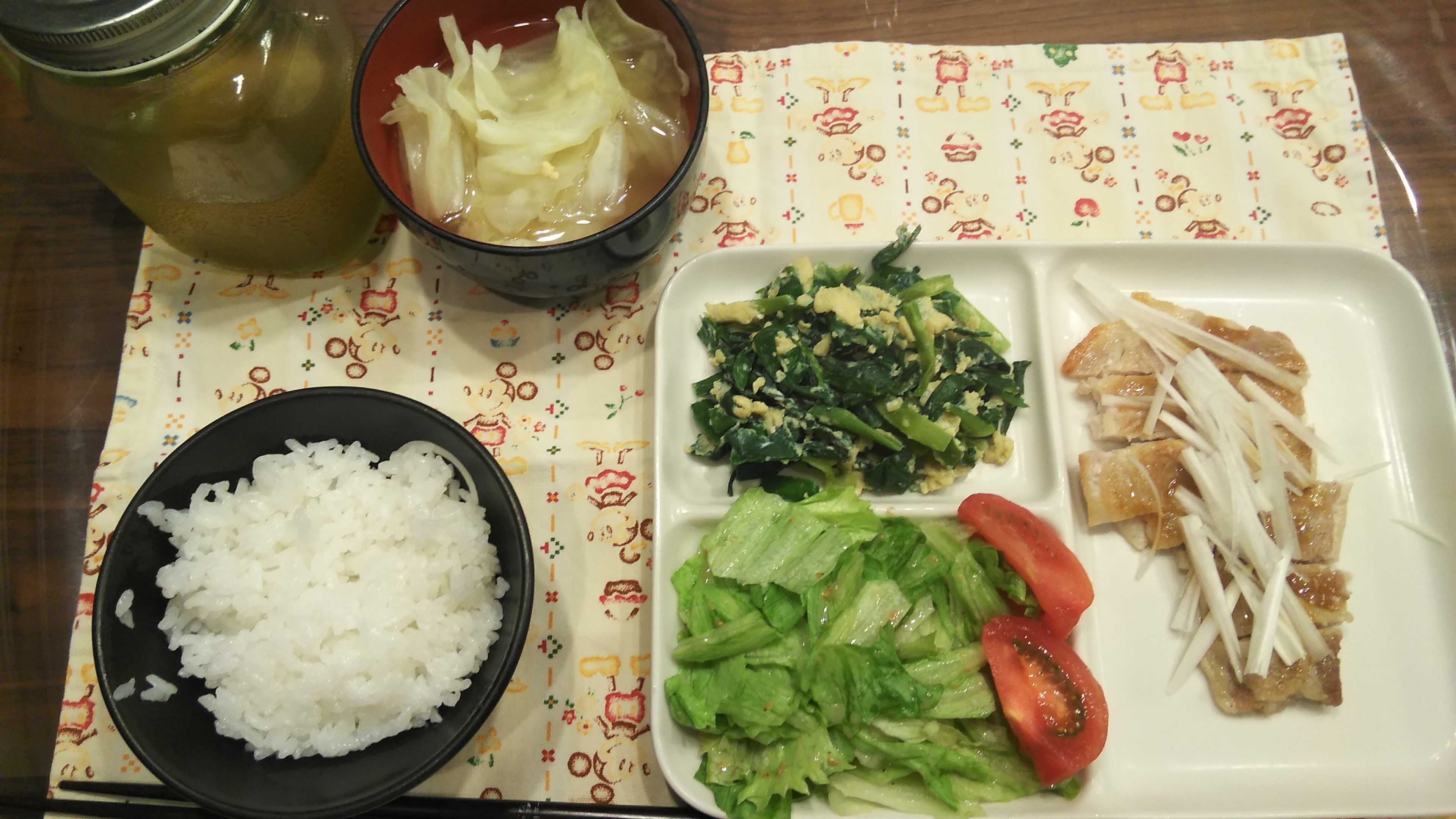 夕食→トマト、サラダ、ニラと卵の炒め物、豚肉のわさび醤油焼き、ご飯、お茶