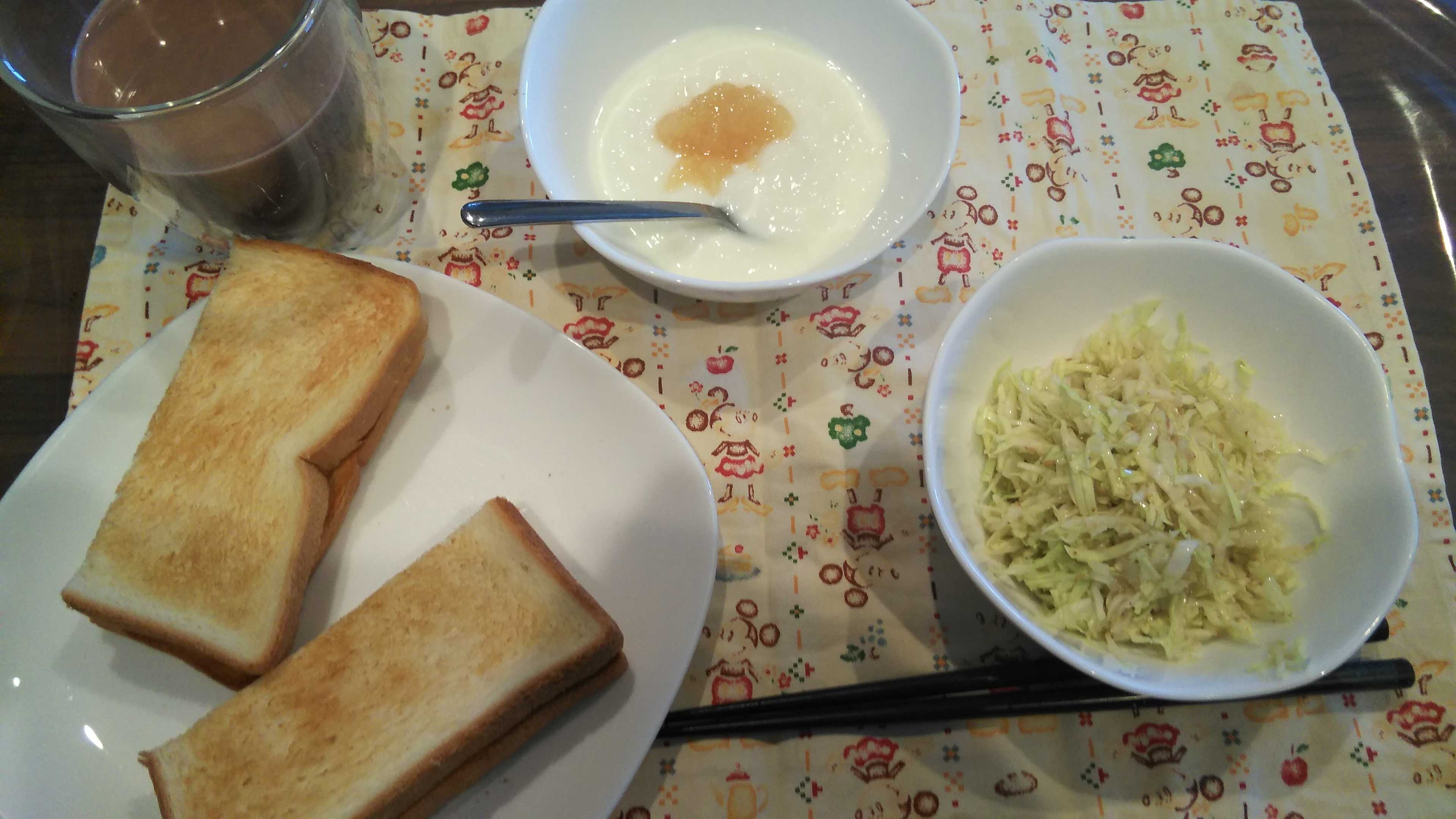 昼食→サラダ、桃ジャムヨーグルト、チーズハムサンド、豆乳ココア