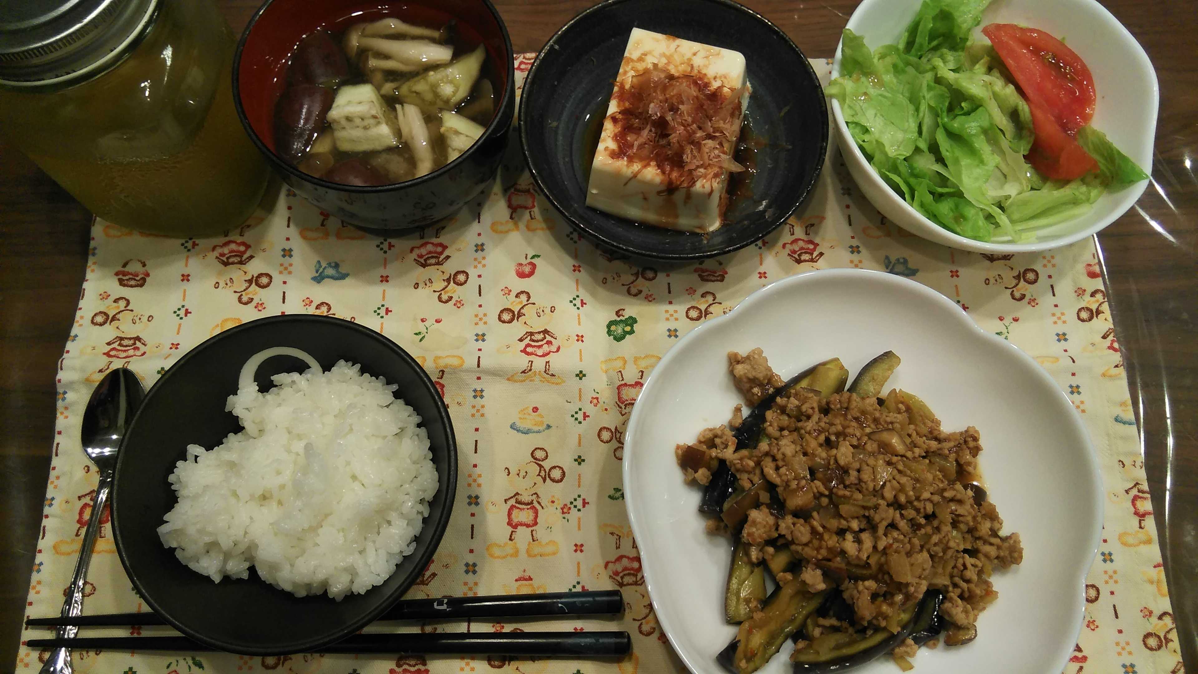 夕食→トマト、サラダ、冷奴、麻婆茄子、茄子の味噌汁、ご飯、お茶
