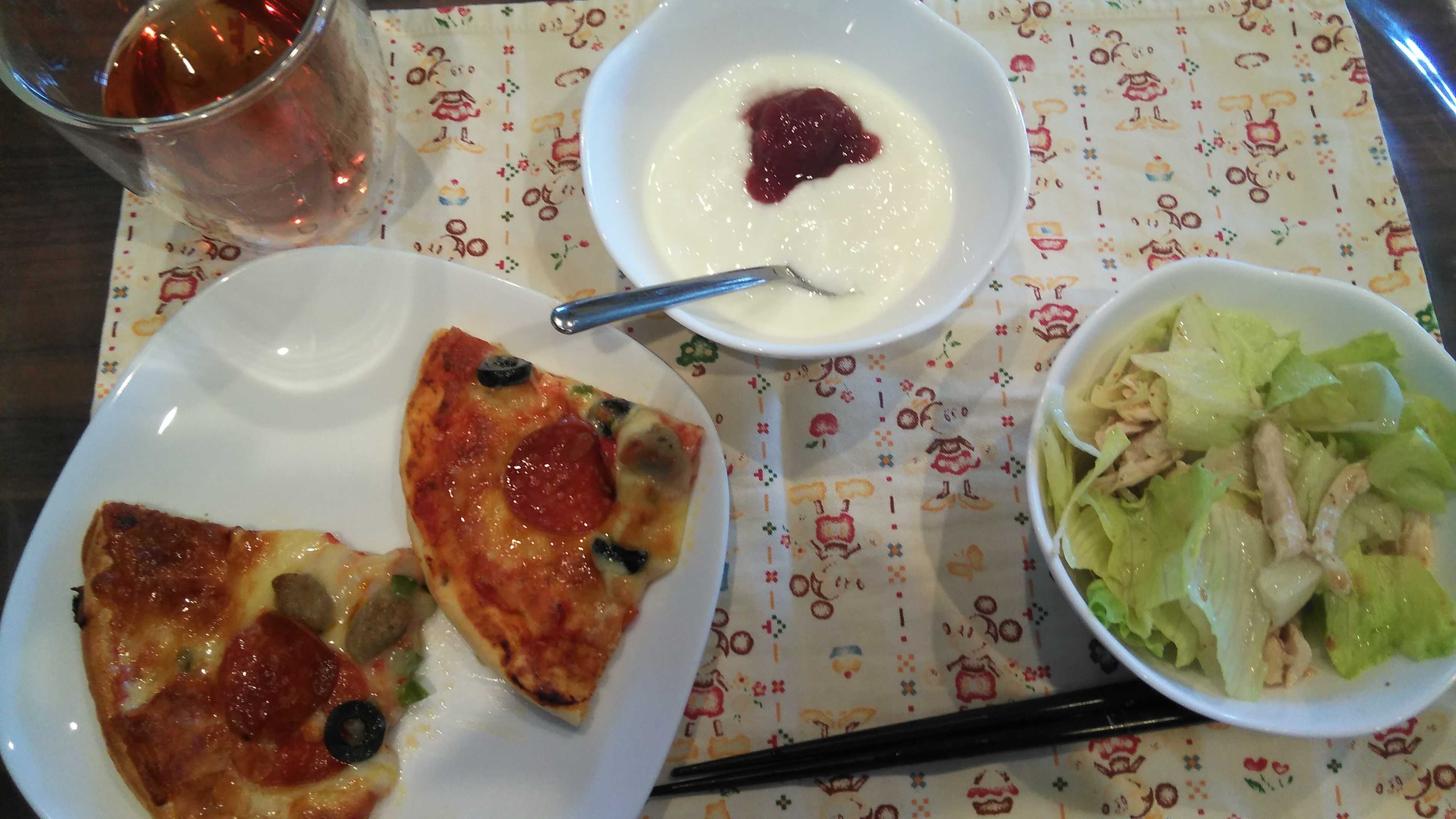 昼食→ささみ入りサラダ、イチゴジャムヨーグルト、ピザ1/2、アイスティ